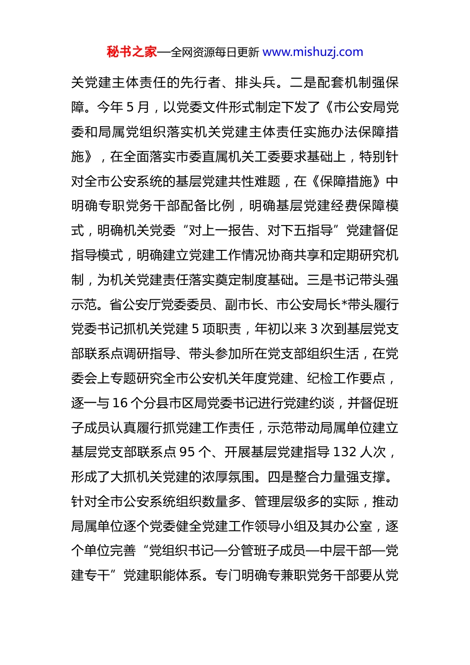 秘书之家—全网资源每日更新 www.mishuzj.com市局党委 2025 年前三季度抓基层党建工作总结 今年以来,市公安局党委坚持以习近平新时代中国特色社会主义思想为指引,坚决落实新时代党的建设总要求,认真贯彻市委部署安排,聚焦“党委统筹强保障、全链管理促履责、机制推进优指导、融入融合见成效”4 个关键环节,提升站位,以上率下,务实重干,进一步拧紧机关党建责任链条,为以高质量机关党建促进高质量发展、高效能治理奠定坚实政治基础。一、主要工作情况(一)加强党委统筹,汇聚工作合力。牢固树立“抓好党建是本职、不抓党建是失职、抓不好党建是不称职”理念,认真履行抓机关党建主体责任、书记第一责任和班子成员“一岗双责”。一是深学悉悟强认识。把习近平总书记关于党的建设的重要思想纳入年度党委中心组分专题学习重要内容,市公安局党委班子以上率下,认真学习习近平总书记“7.9”重要讲话和“7.29”重要指示精神,组织各分县市区局和局直各单位党组织书记围绕习近平总书记在二十届中央政治局第二十一次集体学习时的重要讲话精神开展专题学习,跟进下发党委中心组学习贯彻意见,进一步提升各级领导干部的党建责任意识,努力争当落实机秘书之家—全网资源每日更新 www.mishuzj.com关党建主体责任的先行者、排头兵。二是配套机制强保障。今年 5 月,以党委文件形式制定下发了《市公安局党委和局属党组织落实机关党建主体责任实施办法保障措施》,在全面落实市委直属机关工委要求基础上,特别针对全市公安系统的基层党建共性难题,在《保障措施》中明确专职党务干部配备比例,明确基层党建经费保障模式,明确机关党委“对上一报告、对下五指导”党建督促指导模式,明确建立党建工作情况协商共享和定期研究机制,为机关党建责任落实奠定制度基础。三是书记带头强示范。省公安厅党委委员、副市长、市公安局长*带头履行党委书记抓机关党建 5 项职责,年初以来 3 次到基层党支部联系点调研指导、带头参加所在党支部组织生活,在党委会上专题研究全市公安机关年度党建、纪检工作要点,逐一与 16 个分县市区局党委书记进行党建约谈,并督促班子成员认真履行抓党建工作责任,示范带动局属单位建立基层党支部联系点 95 个、开展基层党建指导 132 人次,形成了大抓机关党建的浓厚氛围。四是整合力量强支撑。针对全市公安系统组织数量多、管理层级多的实际,推动局属单位逐个党委健全党建工作领导小组及其办公室,逐个单位完善“党组织书记—分管班子成员—中层干部—党建专干”党建职能体系。专门明确专兼职党务干部要从党秘书之家—全网资源每日更新 www.mishuzj.com龄三年以上、近三年来无违法违纪的党员中产生,逐个支部进行梳理,进一步优化党务干部队伍,持续建优建强“大党建”力量保障体系。(二)实施全链管理,具化推进路径。对照《实施办法》的底层逻辑,结合单位实际,建立完善“清单明责、联动督责、组织问责”党建责任落实链条,做法被省公安厅确定为全省公安机关政治工作行动计划典型案例。一是清单明责。针对以往机关党建责任定性多、定量少、落实易疏漏的实际,全面梳理现行党内法规和上级要求,先后制定下发《市县两级公安机关党建工作责任清单》《基层党支部党建工作责任清单》《市县两级公安机关党委班子、党委书记、班子成员“党建责任提示单”》,量化了每月、每半年、每年度需要落实的党建工作任务。结合出台《市公安局党委和局属党组织落实机关党建主体责任实施办法保障措施》,进一步细化了党组织书记和班子成员的 5 项责任,以及需启动责任追究程序的 9 类 19 种情形,让党建责任更加明晰。二是联动督责。坚持事前有提醒,由机关党委牵头,梳理阶段性党建工作重点任务,年初以来向局属党组织书记或负责人先后下发“党建工作提示单、督办单”8 批 420 余人次,源头推动各级党组织书记履职尽责。坚持事中有检验,结合年度重大活动,由市局秘书之家—全网资源每日更新 www.mishuzj.com中心办、督察支队、机关党委、机关纪委等组成联合检查组,明察暗访各单位“一把手”召开党组织会议研究部署情况、“一线工作法”落实情况、...