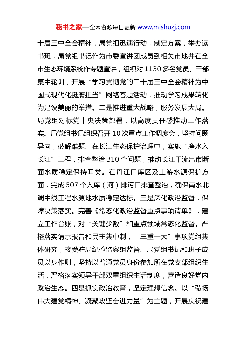 秘书之家—全网资源每日更新 www.mishuzj.com市生态环境局党组书记 2025 年前三季度抓基层党建工作述职报告 今年以来,我坚持以习近平新时代中国特色社会主义思想为指引,坚决落实基层党建第一责任人责任,认真贯彻习近平总书记关于党的建设的重要思想和新时代党的建设总要求,尤其是把学习好、领会好、贯彻好习近平总书记考察重要讲话精神,作为当前和今后的重大政治任务,坚决扛牢管党治党政治责任,全面提升机关党的建设质量,聚焦“两高四着力”,以党建“第一责任”引领保障生态环境高水平保护高质量发展,全力推动总书记重要讲话精神在全市生态环境系统落地见效,为奋力谱写中原大地推进中国式现代化新篇章注入生态环保强大动力。一、主要工作情况(一)突出政治统领,筑牢绝对忠诚的思想根基。一是践行“两个维护”,强化政治自觉。市生态环境局强化政治机关意识,将政治建设置于首位,以习近平新时代中国特色社会主义思想武装头脑、指导实践。严格执行“第一议题”制度,及时跟进学习习近平总书记视察重要讲话和指示批示精神,党组中心组精心组织集体学习,涵盖党的重要会议精神、习近平生态文明思想等。为贯彻党的二秘书之家—全网资源每日更新 www.mishuzj.com十届三中全会精神,局党组迅速行动,制定方案,举办读书班,局党组书记作为市委宣讲团成员到相关市地并在全市生态环境系统作专题宣讲,组织对 1130 多名党员、干部集中轮训,开展“学习贯彻党的二十届三中全会精神为中国式现代化挺膺担当”网络答题活动,推动学习成果转化为建设美丽的举措。二是推进重大战略,服务发展大局。局党组对标党中央决策部署,以高度责任感推动工作落实。局党组书记组织召开 10 次重点工作调度会,坚持问题导向,破解难题。在长江生态保护治理中,实施“净水入长江”工程,排查整治 310 个问题,推动长江干流出市断面水质稳定保持Ⅱ类。在丹江口库区及上游水源保护方面,完成 507 个入库(河)排污口排查整治,确保南水北调中线工程水源地水质稳定达标。三是深化政治监督,保障决策落实。完善《常态化政治监督重点事项清单》,建立工作台账,对“关键少数”和重点领域常态化监督。严格落实请示报告和民主集中制,“三重一大”事项党组集体研究,接受驻局纪检监察组监督。局党组书记和班子成员以身作则,坚持以普通党员身份参加所在党支部组织生活,严格落实领导干部双重组织生活制度,营造良好党内政治生态。四是抓实政治教育,坚定理想信念。以“弘扬伟大建党精神、凝聚攻坚奋进力量”为主题,开展庆祝建秘书之家—全网资源每日更新 www.mishuzj.com党和建国周年系列活动。组织党员重温入党誓词、过政治生日、参观红色教育基地、主题党日活动等,举行升国旗仪式,举办“红旗颂·长江情·绿色韵”交响音乐会,组织青年干部开展多种活动,常态化开展党史学习教育,凝聚精神动力。五是守牢政治底线,防范化解风险。严格落实意识形态工作责任制,每季度分析研判,关注生态环境领域意识形态动态。强化生态环境风险排查防控,加强自主阵地管理,把控信息发布审核关,清理整顿讲座、论坛,规范党员网络行为,修订舆情应对处置机制,完善相关制度,局领导落实接访和信访包案制度,维护意识形态安全,营造良好舆论环境。(二)夯实组织基础,推进基层党建全面过硬。一是建强基层堡垒,提升组织效能。树牢大抓基层的鲜明导向,以提升组织力为重点,突出政治功能,扎实推进基层党组织标准化规范化建设。落实基层党组织任期制度,完善换届提醒机制,精心指导所属党支部进行换届改选,配齐配强党支部班子,为基层党组织发挥战斗堡垒作用提供有力组织保障。二是严管党员队伍,激发先锋活力。坚持把政治标准放在首位,严格把好发展党员“入口关”“程序关”,确保新发展党员政治素质过硬。坚持“四强”党支部标准,每年在“七一”前夕召开“两优一先”表彰大秘书之家—全网资源每日更新 www.mishuzj.com会,对先进党支部、优秀共产党员和优秀党务工作者进行表彰,树立先进典型,发挥示范引领作用。三是常态廉政监督,筑牢纪律防线。常态化开展重要节日、重要节点廉政提醒,通过发送廉...