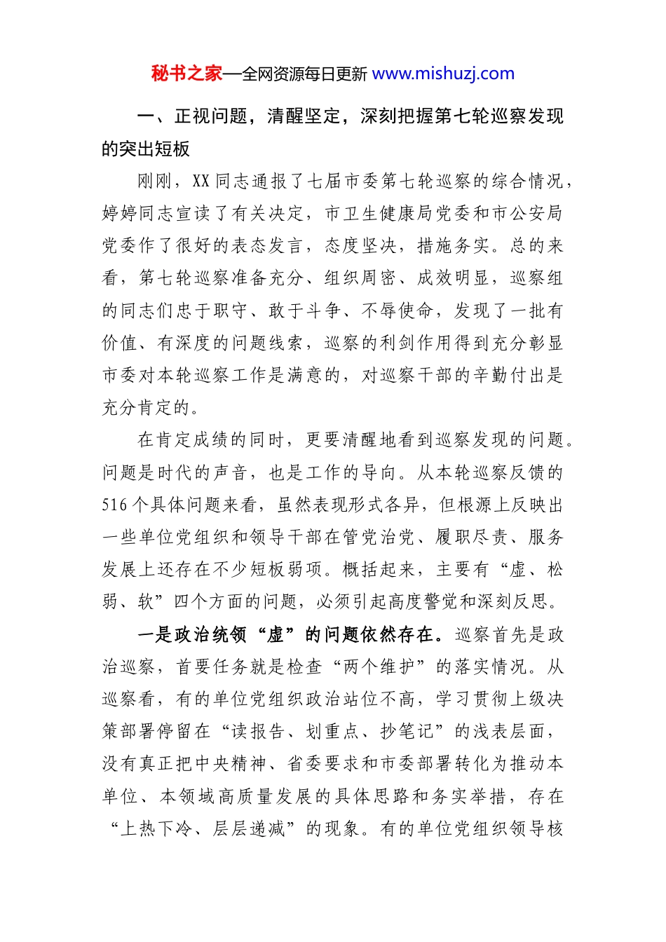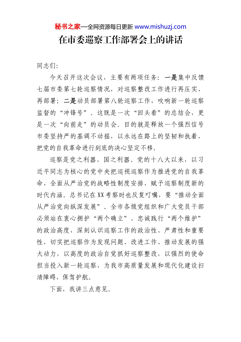 秘书之家—全网资源每日更新 www.mishuzj.com在市委巡察工作部署会上的讲话 同志们:今天召开这次会议,主要有两项任务:一是集中反馈七届市委第七轮巡察情况,对巡察整改工作进行再压实、再部署;二是动员部署第八轮巡察工作,吹响新一轮巡察监督的“冲锋号”。这既是一次“回头看”的总结会,更是一次“向前走”的动员会。目的就是释放一个强烈信号市委坚持严的基调不动摇,以永远在路上的坚韧和执着,把党的自我革命进行到底的决心坚定不移。巡察是党之利器、国之利器。党的十八大以来,以习近平同志为核心的党中央把巡视巡察作为推进党的自我革命、全面从严治党的战略性制度安排,赋予巡察制度新的时代内涵。总书记在 XX 考察时也反复叮嘱,要“推动全面从严治党向纵深发展”。全市各级党组织和广大党员干部必须站在衷心拥护“两个确立”、忠诚践行“两个维护”的政治高度,深刻认识巡察工作的政治性、严肃性和重要性,切实把巡察作为发现问题、改进工作、推动发展的强大动力,以高度的政治自觉抓好巡察整改,以强烈的使命担当投入新一轮巡察,为我市高质量发展和现代化建设扫清障碍、保驾护航。下面,我讲三点意见。秘书之家—全网资源每日更新 www.mishuzj.com一、正视问题,清醒坚定,深刻把握第七轮巡察发现的突出短板刚刚,XX 同志通报了七届市委第七轮巡察的综合情况,婷婷同志宣读了有关决定,市卫生健康局党委和市公安局党委作了很好的表态发言,态度坚决,措施务实。总的来看,第七轮巡察准备充分、组织周密、成效明显,巡察组的同志们忠于职守、敢于斗争、不辱使命,发现了一批有价值、有深度的问题线索,巡察的利剑作用得到充分彰显市委对本轮巡察工作是满意的,对巡察干部的辛勤付出是充分肯定的。在肯定成绩的同时,更要清醒地看到巡察发现的问题。问题是时代的声音,也是工作的导向。从本轮巡察反馈的516 个具体问题来看,虽然表现形式各异,但根源上反映出一些单位党组织和领导干部在管党治党、履职尽责、服务发展上还存在不少短板弱项。概括起来,主要有“虚、松弱、软”四个方面的问题,必须引起高度警觉和深刻反思。一是政治统领“虚”的问题依然存在。巡察首先是政治巡察,首要任务就是检查“两个维护”的落实情况。从巡察看,有的单位党组织政治站位不高,学习贯彻上级决策部署停留在“读报告、划重点、抄笔记”的浅表层面,没有真正把中央精神、省委要求和市委部署转化为推动本单位、本领域高质量发展的具体思路和务实举措,存在“上热下冷、层层递减”的现象。有的单位党组织领导核秘书之家—全网资源每日更新 www.mishuzj.com心作用发挥不充分,议事决策不规范,民主集中制执行不到位,“一把手”末位表态制流于形式,科学决策、民主决策、依法决策的水平有待提高。有的单位对意识形态工作极端重要性认识不足,阵地管理存在风险隐患,未能牢牢掌握意识形态工作领导权。这些问题看似是工作方法问题,实则是政治担当、政治能力问题,根子在于政治统领作用的虚化。二是发展根基“松”的问题不容忽视。高质量发展是新时代的硬道理,也是检验各级党组织战斗力的“试金石”。巡察发现,部分单位服务中心大局的意识不强,存在“重业务、轻政治”的倾向,未能将部门工作有效融入全市发展大局。尤其是在防范化解风险方面,一些单位敏锐性不强、措施不硬。比如,统计造假问题,有的单位为了追求所谓的“政绩观”,在数据上动心思、做文章,搞数字游戏。巡察发现,个别企业上报的产值数据竟然是实际产值的近百倍,这种行为不仅是作风问题,更是严重的政治问题,它污染了政治生态,扭曲了发展导向,误导了宏观决策,其危害触目惊心。此外,在项目审批、工程招投标、国有资产管理等重点领域,廉洁风险防控机制不健全,制度笼子扎得不紧,存在较大风险隐患。这些问题动摇了发展的根基,必须下猛药、出重拳予以整治。三是宗旨意识“弱”的问题比较突出。江山就是人民,人民就是江山。巡察发现,少数单位和干部官僚主义、形秘书之家—全网资源每日更新 www.mishuzj.com式主义积习难改。有的习惯于坐在办公室里看材料、听汇报,深入基层一线解决实际问题少,对...