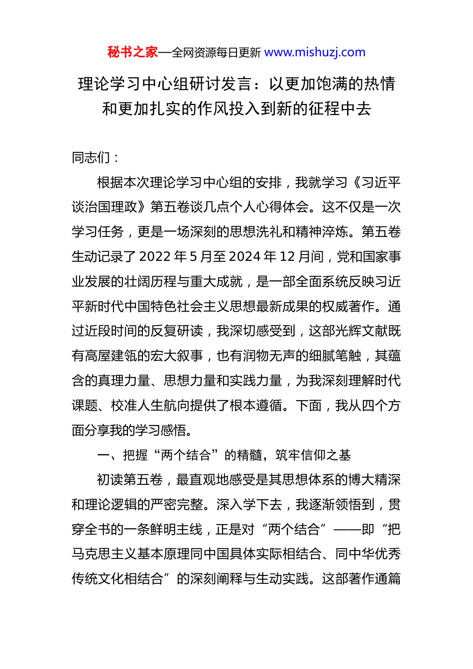 秘书之家—全网资源每日更新 www.mishuzj.com理论学习中心组研讨发言:以更加饱满的热情和更加扎实的作风投入到新的征程中去 同志们:根据本次理论学习中心组的安排,我就学习《习近平谈治国理政》第五卷谈几点个人心得体会。这不仅是一次学习任务,更是一场深刻的思想洗礼和精神淬炼。第五卷生动记录了 2022 年 5 月至 2024 年 12 月间,党和国家事业发展的壮阔历程与重大成就,是一部全面系统反映习近平新时代中国特色社会主义思想最新成果的权威著作。通过近段时间的反复研读,我深切感受到,这部光辉文献既有高屋建瓴的宏大叙事,也有润物无声的细腻笔触,其蕴含的真理力量、思想力量和实践力量,为我深刻理解时代课题、校准人生航向提供了根本遵循。下面,我从四个方面分享我的学习感悟。一、把握“两个结合”的精髓,筑牢信仰之基初读第五卷,最直观地感受是其思想体系的博大精深和理论逻辑的严密完整。深入学下去,我逐渐领悟到,贯穿全书的一条鲜明主线,正是对“两个结合”——即“把马克思主义基本原理同中国具体实际相结合、同中华优秀传统文化相结合”的深刻阐释与生动实践。这部著作通篇秘书之家—全网资源每日更新 www.mishuzj.com闪耀着马克思主义的真理光芒,系统运用辩证唯物主义和历史唯物主义的世界观和方法论来分析和解决中国面临的新问题。它并非对经典理论的简单套用,而是立足于新时代中国特色社会主义的伟大实践,提出了一系列原创性的新理念新思想新战略,是马克思主义中国化时代化的最新成果。对我个人而言,这种感受尤为深刻。在日常工作和生活中,时常会面临纷繁复杂的矛盾和挑战,有时会感到困惑和迷茫。学习第五卷,让我更加清晰地认识到,只有植根于中华民族五千多年文明史的深厚土壤,同时又坚持科学的马克思主义立场观点方法,才能获得无比坚实的理论自信和历史主动。书中所展现的宏大历史观和深邃战略思维,帮助我跳出具体事务的局限,从更长远的时空维度看待问题,从而筑牢了信仰的根基,增强了在风浪考验面前保持定力的思想自觉。这不仅仅是知识的填充,更是一种思想上的升华,一种从“知其然”到“知其所以然”的深刻转变。二、领会中国式现代化的宏伟蓝图,明确前进方向“中国式现代化是新时代最大的政治”。第五卷将中国式现代化置于前所未有的突出位置,对其理论体系和实践路径进行了全面系统地阐述。通过学习,我深刻认识到,中国式现代化绝非西方现代化的翻版或翻新,而是中国共秘书之家—全网资源每日更新 www.mishuzj.com产党领导的社会主义现代化,它既有各国现代化的共同特征,更有基于自己国情的中国特色。这让我对国家未来的发展方向有了更加清晰和坚定地认识。书中强调,推进中国式现代化是一个系统工程,必须统筹兼顾、系统谋划、整体推进,正确处理好若干重大关系。这让我联想到,个人的成长与发展同样需要系统思维。在面对多重目标和复杂任务时,不能顾此失彼,更不能急于求成。第五卷中关于高质量发展、共同富裕、人与自然和谐共生等一系列重要论述为我理解新发展阶段的内在要求提供了“金钥匙”。这让我明白,无论身处何种岗位,都应将个人奋斗融入推进中国式现代化的宏伟事业中,将眼光放得更长远,将格局打得更开阔,以历史耐心和战略定力,走好自己的每一步。这种对宏伟蓝图的领会,让我不再仅仅满足于完成手头的具体任务,而是开始思考如何以更高标准、更宽视野为强国建设、民族复兴伟业贡献绵薄之力。三、站稳“人民至上”的根本立场,内化为民情怀“江山就是人民,人民就是江山”。第五卷中,“人民”是出现频率最高的词汇之一,字里行间充盈着以人民为中心的发展思想和“为人民谋幸福、为民族谋复兴”的价值立场。书中许多篇章,无论是谈改革发展,还是论及社会治理,都始终将人民群众的利益放在最高位置。这种秘书之家—全网资源每日更新 www.mishuzj.com深厚的人民情怀,对我触动极大,也让我对“我是谁、为了谁、依靠谁”这个根本问题有了更切身地感悟。在学习过程中,我反复咀嚼“读懂‘人民至上’的分量,坚守‘为民服务’的初心”这句话。这提醒我,作为一名党员,无论职务高低,都必须时刻牢记...