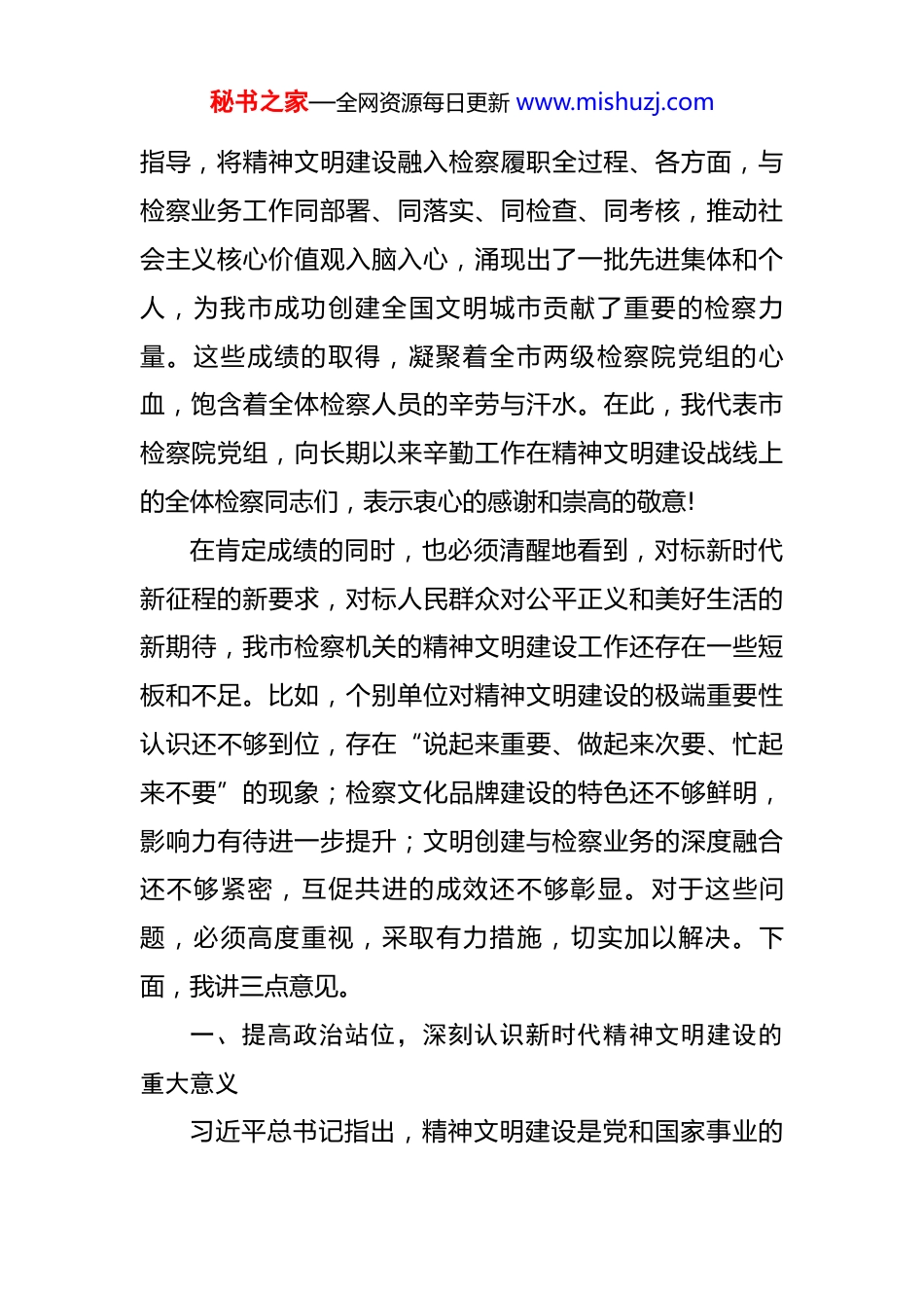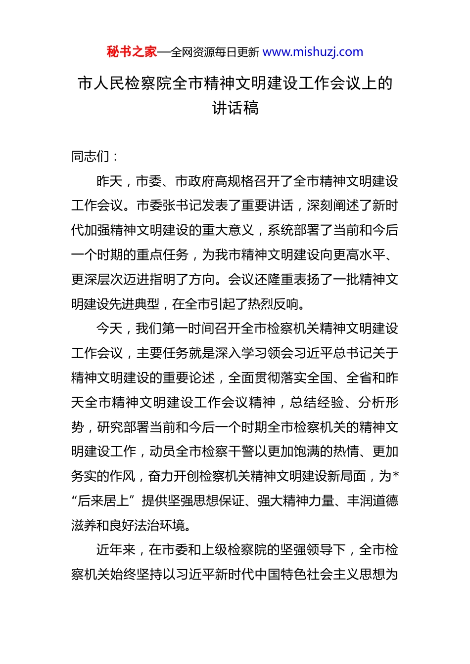秘书之家—全网资源每日更新 www.mishuzj.com市人民检察院全市精神文明建设工作会议上的讲话稿 同志们:昨天,市委、市政府高规格召开了全市精神文明建设工作会议。市委张书记发表了重要讲话,深刻阐述了新时代加强精神文明建设的重大意义,系统部署了当前和今后一个时期的重点任务,为我市精神文明建设向更高水平、更深层次迈进指明了方向。会议还隆重表扬了一批精神文明建设先进典型,在全市引起了热烈反响。今天,我们第一时间召开全市检察机关精神文明建设工作会议,主要任务就是深入学习领会习近平总书记关于精神文明建设的重要论述,全面贯彻落实全国、全省和昨天全市精神文明建设工作会议精神,总结经验、分析形势,研究部署当前和今后一个时期全市检察机关的精神文明建设工作,动员全市检察干警以更加饱满的热情、更加务实的作风,奋力开创检察机关精神文明建设新局面,为*“后来居上”提供坚强思想保证、强大精神力量、丰润道德滋养和良好法治环境。近年来,在市委和上级检察院的坚强领导下,全市检察机关始终坚持以习近平新时代中国特色社会主义思想为秘书之家—全网资源每日更新 www.mishuzj.com指导,将精神文明建设融入检察履职全过程、各方面,与检察业务工作同部署、同落实、同检查、同考核,推动社会主义核心价值观入脑入心,涌现出了一批先进集体和个人,为我市成功创建全国文明城市贡献了重要的检察力量。这些成绩的取得,凝聚着全市两级检察院党组的心血,饱含着全体检察人员的辛劳与汗水。在此,我代表市检察院党组,向长期以来辛勤工作在精神文明建设战线上的全体检察同志们,表示衷心的感谢和崇高的敬意!在肯定成绩的同时,也必须清醒地看到,对标新时代新征程的新要求,对标人民群众对公平正义和美好生活的新期待,我市检察机关的精神文明建设工作还存在一些短板和不足。比如,个别单位对精神文明建设的极端重要性认识还不够到位,存在“说起来重要、做起来次要、忙起来不要”的现象;检察文化品牌建设的特色还不够鲜明,影响力有待进一步提升;文明创建与检察业务的深度融合还不够紧密,互促共进的成效还不够彰显。对于这些问题,必须高度重视,采取有力措施,切实加以解决。下面,我讲三点意见。一、提高政治站位,深刻认识新时代精神文明建设的重大意义习近平总书记指出,精神文明建设是党和国家事业的秘书之家—全网资源每日更新 www.mishuzj.com重要组成部分,是关系中华民族伟大复兴的一件大事。在全面建设社会主义现代化国家、向第二个百年奋斗目标进军的新征程上,精神文明建设的地位和作用更加凸显。全市检察机关必须从战略和全局的高度,深刻把握其时代内涵和实践要求。第一,加强精神文明建设是筑牢政治忠诚、拥护“两个确立”的必然要求。精神文明建设,首要的是政治文明建设,核心是理想信念教育。检察机关是党绝对领导下的政治机关、法律监督机关和司法机关,旗帜鲜明讲政治是第一位的要求。加强精神文明建设,就是要坚持不懈用党的创新理论凝心铸魂,引导全体检察人员深刻领悟“两个确立”的决定性意义,增强“四个意识”、坚定“四个自信”、做到“两个维护”,始终在思想上政治上行动上同以习近平同志为核心的党中央保持高度一致。这是确保检察事业始终沿着正确政治方向前进的根本保证。第二,加强精神文明建设是服务 XX 高质量发展、助力“后来居上”的内在需要。一座城市的竞争,不仅是经济实力的比拼,更是文明程度和市民素养的较量。当前,XX正处在爬坡过坎、蓄势突破的关键时期。推动经济社会高质量发展,既需要坚实的物质基础,也需要强大的精神支撑。全市检察机关作为国家法律监督机关,不仅是社会秩秘书之家—全网资源每日更新 www.mishuzj.com序的维护者,也是社会风尚的引领者。通过加强精神文明建设,能够提振干警干事创业的精气神,激发“检察之为”的内生动力,将文明创建的软实力转化为服务大局的硬支撑,为 XX 在现代化建设新征程上行稳致远注入不竭动力。第三,加强精神文明建设是践行司法为民、满足人民群众新期待的根本途径。精神文明的成果,最终要体现在人民群众的获得感、幸福感、安全感上。人民群众对公平...