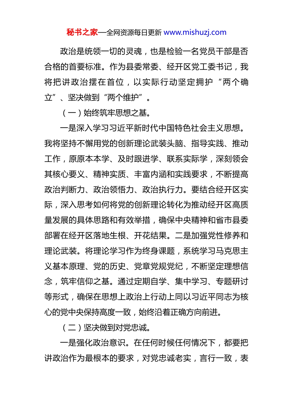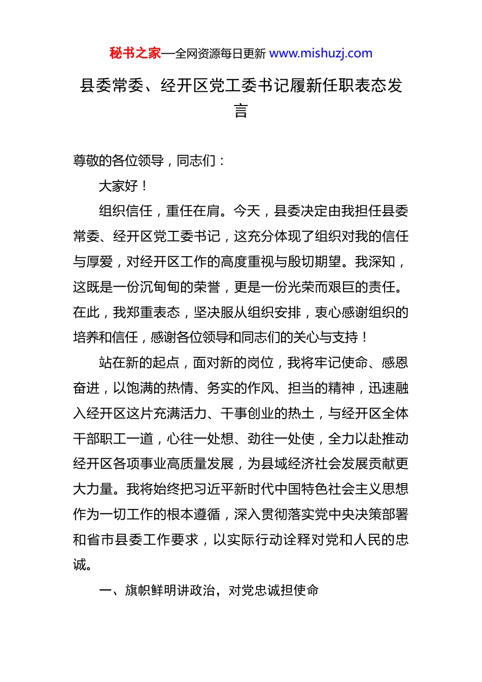 秘书之家—全网资源每日更新 www.mishuzj.com县委常委、经开区党工委书记履新任职表态发言 尊敬的各位领导,同志们:大家好!组织信任,重任在肩。今天,县委决定由我担任县委常委、经开区党工委书记,这充分体现了组织对我的信任与厚爱,对经开区工作的高度重视与殷切期望。我深知,这既是一份沉甸甸的荣誉,更是一份光荣而艰巨的责任。在此,我郑重表态,坚决服从组织安排,衷心感谢组织的培养和信任,感谢各位领导和同志们的关心与支持!站在新的起点,面对新的岗位,我将牢记使命、感恩奋进,以饱满的热情、务实的作风、担当的精神,迅速融入经开区这片充满活力、干事创业的热土,与经开区全体干部职工一道,心往一处想、劲往一处使,全力以赴推动经开区各项事业高质量发展,为县域经济社会发展贡献更大力量。我将始终把习近平新时代中国特色社会主义思想作为一切工作的根本遵循,深入贯彻落实党中央决策部署和省市县委工作要求,以实际行动诠释对党和人民的忠诚。一、旗帜鲜明讲政治,对党忠诚担使命秘书之家—全网资源每日更新 www.mishuzj.com政治是统领一切的灵魂,也是检验一名党员干部是否合格的首要标准。作为县委常委、经开区党工委书记,我将把讲政治摆在首位,以实际行动坚定拥护“两个确立”、坚决做到“两个维护”。(一)始终筑牢思想之基。一是深入学习习近平新时代中国特色社会主义思想。我将坚持不懈用党的创新理论武装头脑、指导实践、推动工作,原原本本学、及时跟进学、联系实际学,深刻领会其核心要义、精神实质、丰富内涵和实践要求,不断提高政治判断力、政治领悟力、政治执行力。要结合经开区实际,深入思考如何将党的创新理论转化为推动经开区高质量发展的具体思路和有效举措,确保中央精神和省市县委部署在经开区落地生根、开花结果。二是加强党性修养和理论武装。将理论学习作为终身课题,系统学习马克思主义基本原理、党的历史、党章党规党纪,不断坚定理想信念,筑牢信仰之基。通过定期自学、集中学习、专题研讨等形式,确保在思想上政治上行动上同以习近平同志为核心的党中央保持高度一致,始终沿着正确方向前进。(二)坚决做到对党忠诚。一是强化政治意识。在任何时候任何情况下,都要把讲政治作为最根本的要求,对党忠诚老实,言行一致,表秘书之家—全网资源每日更新 www.mishuzj.com里如一。要严格遵守党的政治纪律和政治规矩,不折不扣地执行上级各项决策部署,确保政令畅通、令行禁止。对县委作出的各项决策,我将坚决拥护、全力支持、率先垂范,带领经开区上下形成统一思想、统一行动的强大合力。二是维护班子团结。作为经开区党工委书记,我将以身作则,发扬民主,与班子成员坦诚相待、互相信任、互相支持,共同维护班子团结和集体权威。坚持民主集中制原则,充分听取班子成员的意见建议,汇聚各方智慧,形成经开区发展的强大凝聚力。三是涵养政治生态。我将以身作则,带头营造风清气正的政治生态,坚决抵制各种不正之风,为干部职工创造一个积极向上、干事创业的良好环境。(三)忠诚履职担当作为。一是牢固树立正确的权力观、政绩观。始终牢记为民服务的宗旨,把党和人民赋予的权力用来为人民谋幸福、为经开区谋发展。坚决杜绝形式主义、官僚主义,力戒空谈,真抓实干,把工作的出发点和落脚点都放在推动经开区发展和增进人民福祉上。二是增强斗争精神。在推动经开区发展过程中,难免会遇到各种困难和挑战。我将坚持原则,敢于斗争、善于斗争,以顽强的意志和过硬的作风,带领经开区上下攻坚克难,闯关夺隘,不负组织和人秘书之家—全网资源每日更新 www.mishuzj.com民的重托。三是提高履职能力。面对新形势、新任务,我将加强学习,向书本学、向实践学、向领导同事学、向先进典型学,不断提升自身的专业素养和领导能力,努力成为一名懂经济、会管理、善协调的复合型干部,更好地服务经开区发展。二、聚焦主业谋发展,实干担当促转型经开区是县域经济发展的主战场、主引擎。我将紧紧围绕县委、县政府中心工作,立足经开区实际,聚焦高质量发展这一首要任务,全力以赴谋划和推进各项工作。(一)坚持新发展理念,厚植发展优势。一...