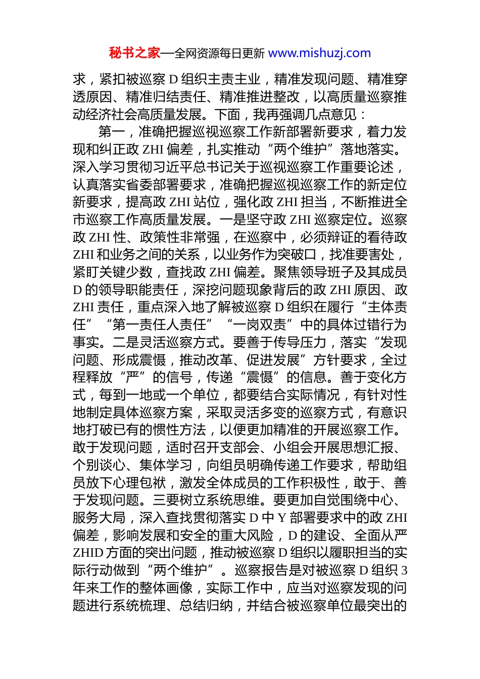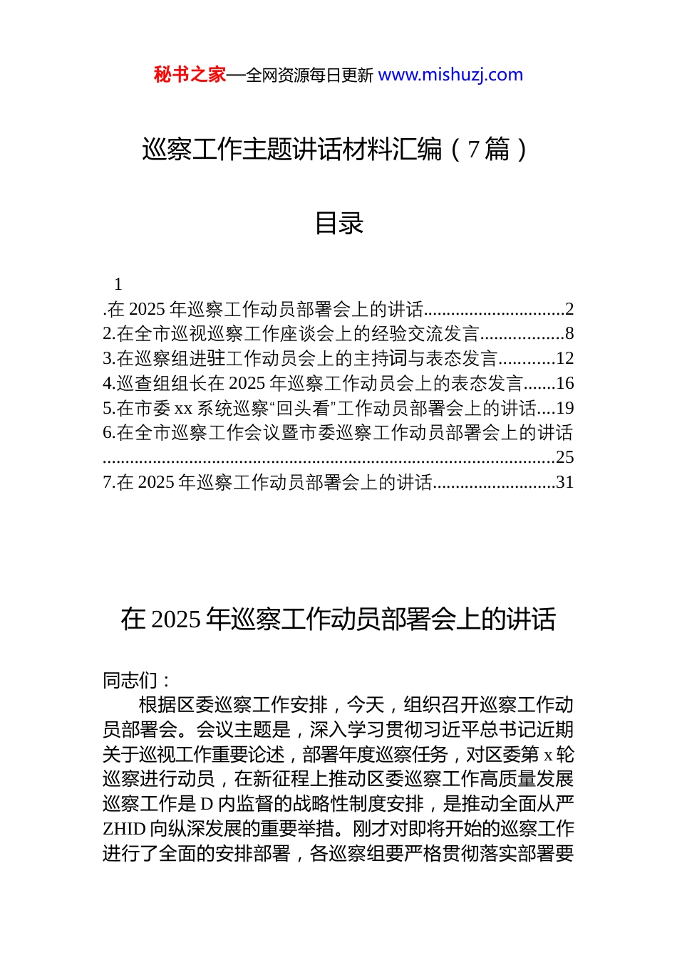 秘书之家—全网资源每日更新 www.mishuzj.com巡察工作主题讲话材料汇编(7 篇)目录1.在 2025 年巡察工作动员部署会上的讲话...............................22.在全市巡视巡察工作座谈会上的经验交流发言..................83.在巡察组进工作动员会上的主持与表态发言驻词............124.巡查组组长在 2025 年巡察工作动员会上的表态发言.......165.在市委 xx 系统巡察“回头看”工作动员部署会上的讲话....196.在全市巡察工作会议暨市委巡察工作动员部署会上的讲话...................................................................................................257.在 2025 年巡察工作动员部署会上的讲话...........................31在 2025 年巡察工作动员部署会上的讲话同志们:根据区委巡察工作安排,今天,组织召开巡察工作动员部署会。会议主题是,深入学习贯彻习近平总书记近期关于巡视工作重要论述,部署年度巡察任务,对区委第 x 轮巡察进行动员,在新征程上推动区委巡察工作高质量发展巡察工作是 D 内监督的战略性制度安排,是推动全面从严ZHID 向纵深发展的重要举措。刚才对即将开始的巡察工作进行了全面的安排部署,各巡察组要严格贯彻落实部署要秘书之家—全网资源每日更新 www.mishuzj.com求,紧扣被巡察 D 组织主责主业,精准发现问题、精准穿透原因、精准归结责任、精准推进整改,以高质量巡察推动经济社会高质量发展。下面,我再强调几点意见:第一,准确把握巡视巡察工作新部署新要求,着力发现和纠正政 ZHI 偏差,扎实推动“两个维护”落地落实。深入学习贯彻习近平总书记关于巡视巡察工作重要论述,认真落实省委部署要求,准确把握巡视巡察工作的新定位新要求,提高政 ZHI 站位,强化政 ZHI 担当,不断推进全市巡察工作高质量发展。一是坚守政 ZHI 巡察定位。巡察政 ZHI 性、政策性非常强,在巡察中,必须辩证的看待政ZHI 和业务之间的关系,以业务作为突破口,找准要害处,紧盯关键少数,查找政 ZHI 偏差。聚焦领导班子及其成员D 的领导职能责任,深挖问题现象背后的政 ZHI 原因、政ZHI 责任,重点深入地了解被巡察 D 组织在履行“主体责任”“第一责任人责任”“一岗双责”中的具体过错行为事实。二是灵活巡察方式。要善于传导压力,落实“发现问题、形成震慑,推动改革、促进发展”方针要求,全过程释放“严”的信号,传递“震慑”的信息。善于变化方式,每到一地或一个单位,都要结合实际情况,有针对性地制定具体巡察方案,采取灵活多变的巡察方式,有意识地打破已有的惯性方法,以便更加精准的开展巡察工作。敢于发现问题,适时召开支部会、小组会开展思想汇报、个别谈心、集体学习,向组员明确传递工作要求,帮助组员放下心理包袱,激发全体成员的工作积极性,敢于、善于发现问题。三要树立系统思维。要更加自觉围绕中心、服务大局,深入查找贯彻落实 D 中 Y 部署要求中的政 ZHI偏差,影响发展和安全的重大风险,D 的建设、全面从严ZHID 方面的突出问题,推动被巡察 D 组织以履职担当的实际行动做到“两个维护”。巡察报告是对被巡察 D 组织 3年来工作的整体画像,实际工作中,应当对巡察发现的问题进行系统梳理、总结归纳,并结合被巡察单位最突出的秘书之家—全网资源每日更新 www.mishuzj.com特点,精准选用实例、客观定性分析、深入分析研判,才能做到精准、客观、全面。第二,扎实推动巡察工作高质量发展,加强 D 的政ZHI 建设,推动政 ZHI 监督走深走实。落实巡察整改监督责任,把督促整改作为强化政 ZHI 监督、做实日常监督的重要抓手,将巡察整改情况纳入年度考核内容,推动相关责任主体各司其职、密切协作,合力推动巡察整改落实到位督促全区各级 D 组织持之以恒扬优势、提能级、优环境,把改革发展的一项项“任务清单”转化为群众可感可及的“成绩榜单”。一是聚焦“两个维护”强化政 ZHI 监督。以强有力的政 ZHI 监督,督促推动各级 D 组织和广大 D 员干部在思想上政 ZHI 上行动上同以习近平同志为核心的 D中 Y 保持高度一致。思想上,坚持不懈强...
