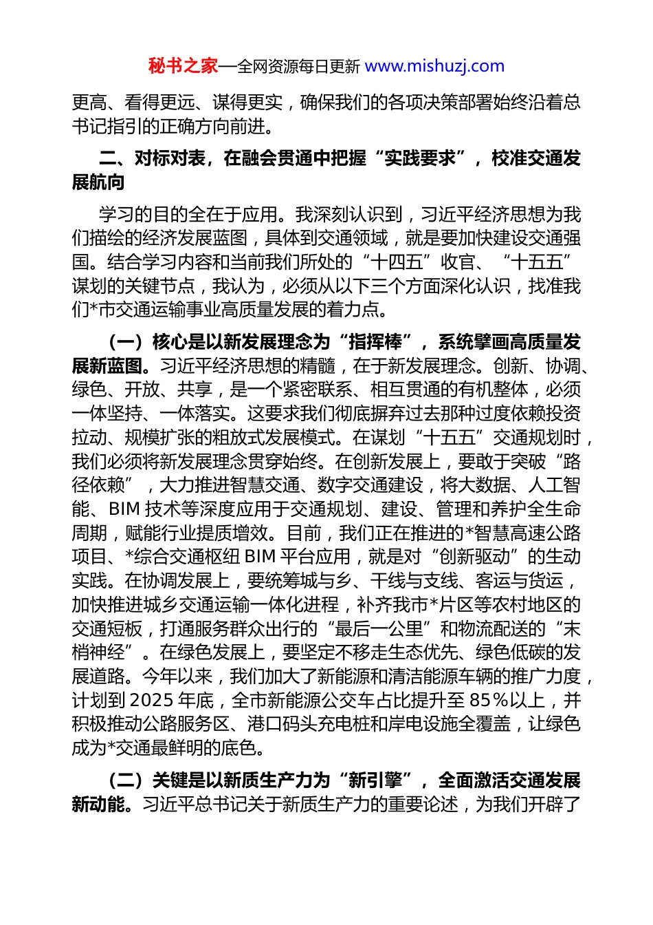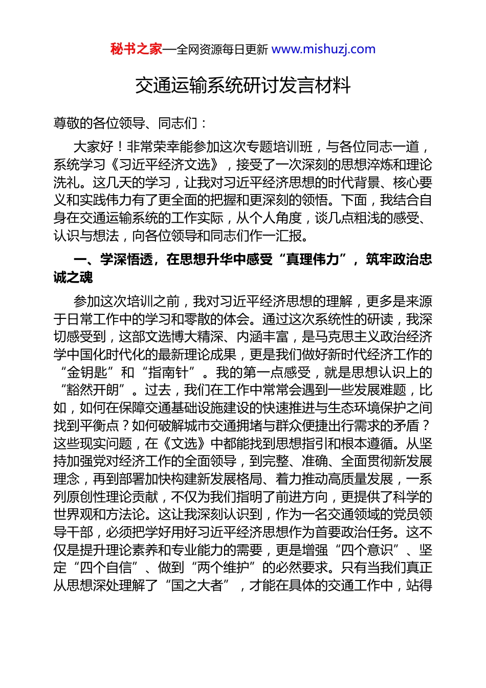 秘书之家—全网资源每日更新 www.mishuzj.com交通运输系统研讨发言材料尊敬的各位领导、同志们:大家好!非常荣幸能参加这次专题培训班,与各位同志一道,系统学习《习近平经济文选》,接受了一次深刻的思想淬炼和理论洗礼。这几天的学习,让我对习近平经济思想的时代背景、核心要义和实践伟力有了更全面的把握和更深刻的领悟。下面,我结合自身在交通运输系统的工作实际,从个人角度,谈几点粗浅的感受、认识与想法,向各位领导和同志们作一汇报。一、学深悟透,在思想升华中感受“真理伟力”,筑牢政治忠诚之魂参加这次培训之前,我对习近平经济思想的理解,更多是来源于日常工作中的学习和零散的体会。通过这次系统性的研读,我深切感受到,这部文选博大精深、内涵丰富,是马克思主义政治经济学中国化时代化的最新理论成果,更是我们做好新时代经济工作的“金钥匙”和“指南针”。我的第一点感受,就是思想认识上的“豁然开朗”。过去,我们在工作中常常会遇到一些发展难题,比如,如何在保障交通基础设施建设的快速推进与生态环境保护之间找到平衡点?如何破解城市交通拥堵与群众便捷出行需求的矛盾?这些现实问题,在《文选》中都能找到思想指引和根本遵循。从坚持加强党对经济工作的全面领导,到完整、准确、全面贯彻新发展理念,再到部署加快构建新发展格局、着力推动高质量发展,一系列原创性理论贡献,不仅为我们指明了前进方向,更提供了科学的世界观和方法论。这让我深刻认识到,作为一名交通领域的党员领导干部,必须把学好用好习近平经济思想作为首要政治任务。这不仅是提升理论素养和专业能力的需要,更是增强“四个意识”、坚定“四个自信”、做到“两个维护”的必然要求。只有当我们真正从思想深处理解了“国之大者”,才能在具体的交通工作中,站得秘书之家—全网资源每日更新 www.mishuzj.com更高、看得更远、谋得更实,确保我们的各项决策部署始终沿着总书记指引的正确方向前进。二、对标对表,在融会贯通中把握“实践要求”,校准交通发展航向学习的目的全在于应用。我深刻认识到,习近平经济思想为我们描绘的经济发展蓝图,具体到交通领域,就是要加快建设交通强国。结合学习内容和当前我们所处的“十四五”收官、“十五五”谋划的关键节点,我认为,必须从以下三个方面深化认识,找准我们*市交通运输事业高质量发展的着力点。(一)核心是以新发展理念为“指挥棒”,系统擘画高质量发展新蓝图。习近平经济思想的精髓,在于新发展理念。创新、协调、绿色、开放、共享,是一个紧密联系、相互贯通的有机整体,必须一体坚持、一体落实。这要求我们彻底摒弃过去那种过度依赖投资拉动、规模扩张的粗放式发展模式。在谋划“十五五”交通规划时,我们必须将新发展理念贯穿始终。在创新发展上,要敢于突破“路径依赖”,大力推进智慧交通、数字交通建设,将大数据、人工智能、BIM 技术等深度应用于交通规划、建设、管理和养护全生命周期,赋能行业提质增效。目前,我们正在推进的*智慧高速公路项目、*综合交通枢纽 BIM 平台应用,就是对“创新驱动”的生动实践。在协调发展上,要统筹城与乡、干线与支线、客运与货运,加快推进城乡交通运输一体化进程,补齐我市*片区等农村地区的交通短板,打通服务群众出行的“最后一公里”和物流配送的“末梢神经”。在绿色发展上,要坚定不移走生态优先、绿色低碳的发展道路。今年以来,我们加大了新能源和清洁能源车辆的推广力度,计划到 2025 年底,全市新能源公交车占比提升至 85%以上,并积极推动公路服务区、港口码头充电桩和岸电设施全覆盖,让绿色成为*交通最鲜明的底色。(二)关键是以新质生产力为“新引擎”,全面激活交通发展新动能。习近平总书记关于新质生产力的重要论述,为我们开辟了秘书之家—全网资源每日更新 www.mishuzj.com新赛道、塑造了新优势。交通运输作为国民经济的“先行官”,是培育和发展新质生产力的重要领域。我们要深刻认识到,发展新质生产力,不是简单的“上项目、铺摊子”,而是要以科技创新推动产业创新。一方面,我们要加快交通基础设施的数字化转型。从传统的“钢筋水泥”,转向“...