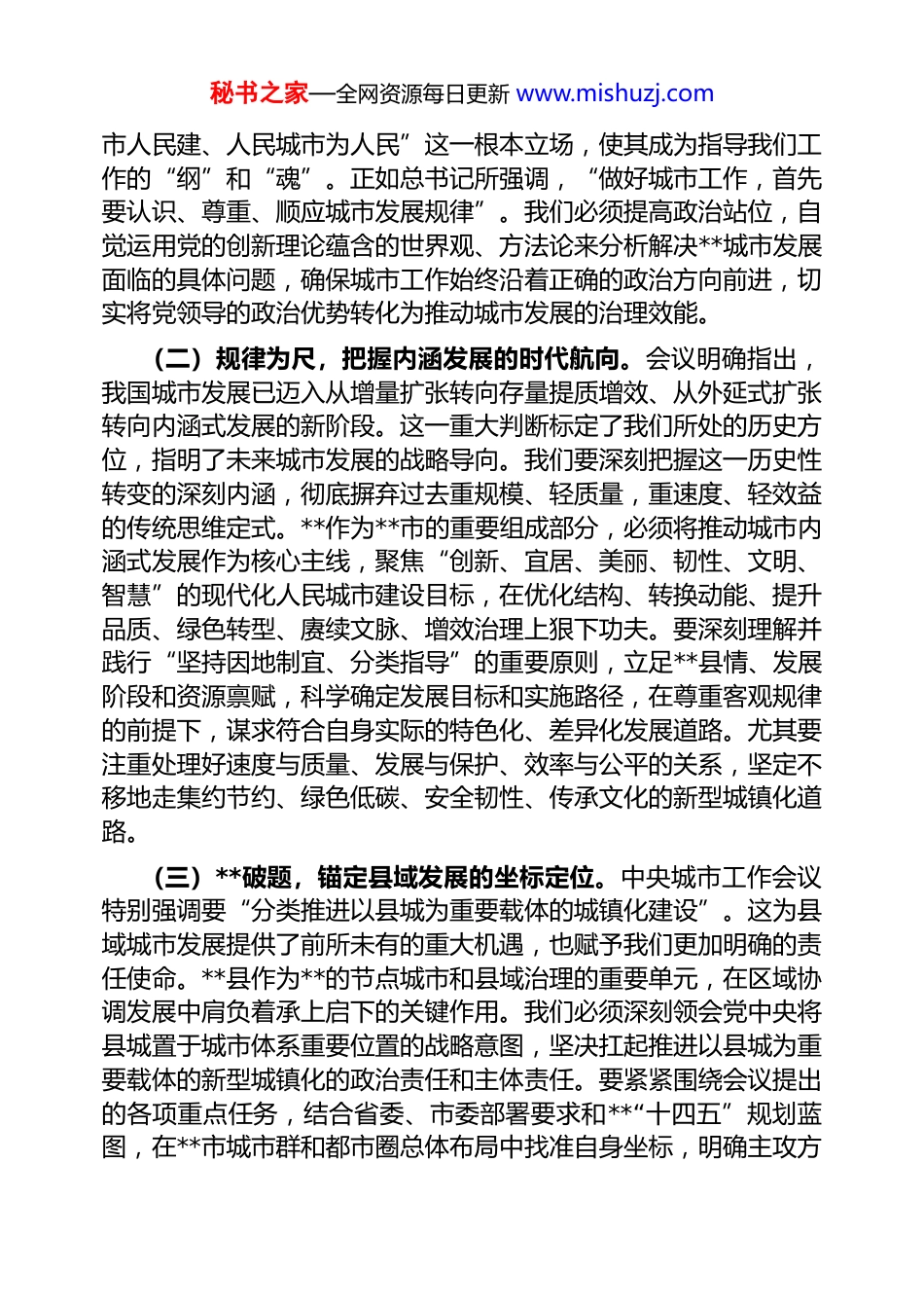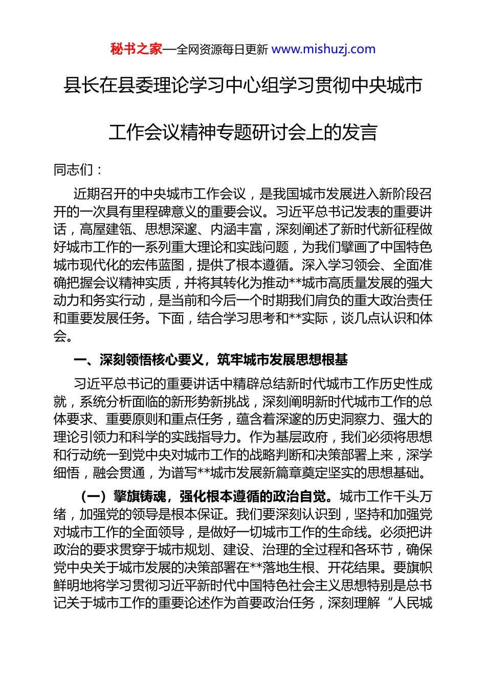 秘书之家—全网资源每日更新 www.mishuzj.com县长在县委理论学习中心组学习贯彻中央城市工作会议精神专题研讨会上的发言同志们:近期召开的中央城市工作会议,是我国城市发展进入新阶段召开的一次具有里程碑意义的重要会议。习近平总书记发表的重要讲话,高屋建瓴、思想深邃、内涵丰富,深刻阐述了新时代新征程做好城市工作的一系列重大理论和实践问题,为我们擘画了中国特色城市现代化的宏伟蓝图,提供了根本遵循。深入学习领会、全面准确把握会议精神实质,并将其转化为推动**城市高质量发展的强大动力和务实行动,是当前和今后一个时期我们肩负的重大政治责任和重要发展任务。下面,结合学习思考和**实际,谈几点认识和体会。一、深刻领悟核心要义,筑牢城市发展思想根基习近平总书记的重要讲话中精辟总结新时代城市工作历史性成就,系统分析面临的新形势新挑战,深刻阐明新时代城市工作的总体要求、重要原则和重点任务,蕴含着深邃的历史洞察力、强大的理论引领力和科学的实践指导力。作为基层政府,我们必须将思想和行动统一到党中央对城市工作的战略判断和决策部署上来,深学细悟,融会贯通,为谱写**城市发展新篇章奠定坚实的思想基础。(一)擎旗铸魂,强化根本遵循的政治自觉。城市工作千头万绪,加强党的领导是根本保证。我们要深刻认识到,坚持和加强党对城市工作的全面领导,是做好一切城市工作的生命线。必须把讲政治的要求贯穿于城市规划、建设、治理的全过程和各环节,确保党中央关于城市发展的决策部署在**落地生根、开花结果。要旗帜鲜明地将学习贯彻习近平新时代中国特色社会主义思想特别是总书记关于城市工作的重要论述作为首要政治任务,深刻理解“人民城秘书之家—全网资源每日更新 www.mishuzj.com市人民建、人民城市为人民”这一根本立场,使其成为指导我们工作的“纲”和“魂”。正如总书记所强调,“做好城市工作,首先要认识、尊重、顺应城市发展规律”。我们必须提高政治站位,自觉运用党的创新理论蕴含的世界观、方法论来分析解决**城市发展面临的具体问题,确保城市工作始终沿着正确的政治方向前进,切实将党领导的政治优势转化为推动城市发展的治理效能。(二)规律为尺,把握内涵发展的时代航向。会议明确指出,我国城市发展已迈入从增量扩张转向存量提质增效、从外延式扩张转向内涵式发展的新阶段。这一重大判断标定了我们所处的历史方位,指明了未来城市发展的战略导向。我们要深刻把握这一历史性转变的深刻内涵,彻底摒弃过去重规模、轻质量,重速度、轻效益的传统思维定式。**作为**市的重要组成部分,必须将推动城市内涵式发展作为核心主线,聚焦“创新、宜居、美丽、韧性、文明、智慧”的现代化人民城市建设目标,在优化结构、转换动能、提升品质、绿色转型、赓续文脉、增效治理上狠下功夫。要深刻理解并践行“坚持因地制宜、分类指导”的重要原则,立足**县情、发展阶段和资源禀赋,科学确定发展目标和实施路径,在尊重客观规律的前提下,谋求符合自身实际的特色化、差异化发展道路。尤其要注重处理好速度与质量、发展与保护、效率与公平的关系,坚定不移地走集约节约、绿色低碳、安全韧性、传承文化的新型城镇化道路。(三)**破题,锚定县域发展的坐标定位。中央城市工作会议特别强调要“分类推进以县城为重要载体的城镇化建设”。这为县域城市发展提供了前所未有的重大机遇,也赋予我们更加明确的责任使命。**县作为**的节点城市和县域治理的重要单元,在区域协调发展中肩负着承上启下的关键作用。我们必须深刻领会党中央将县城置于城市体系重要位置的战略意图,坚决扛起推进以县城为重要载体的新型城镇化的政治责任和主体责任。要紧紧围绕会议提出的各项重点任务,结合省委、市委部署要求和**“十四五”规划蓝图,在**市城市群和都市圈总体布局中找准自身坐标,明确主攻方秘书之家—全网资源每日更新 www.mishuzj.com向。当前,重中之重是将会议精神的学习成果转化为推动**县城功能完善、品质提升、产业升级、人口集聚的具体思路和工作方案,着力解决影响县城承载力和吸引力的短板弱项,全面提升县城综合服务功能和辐射带动乡村的能...