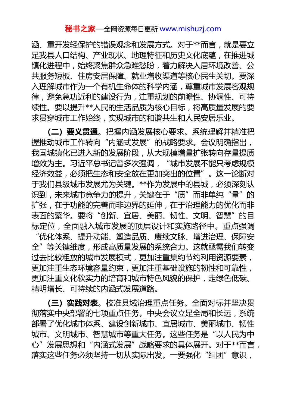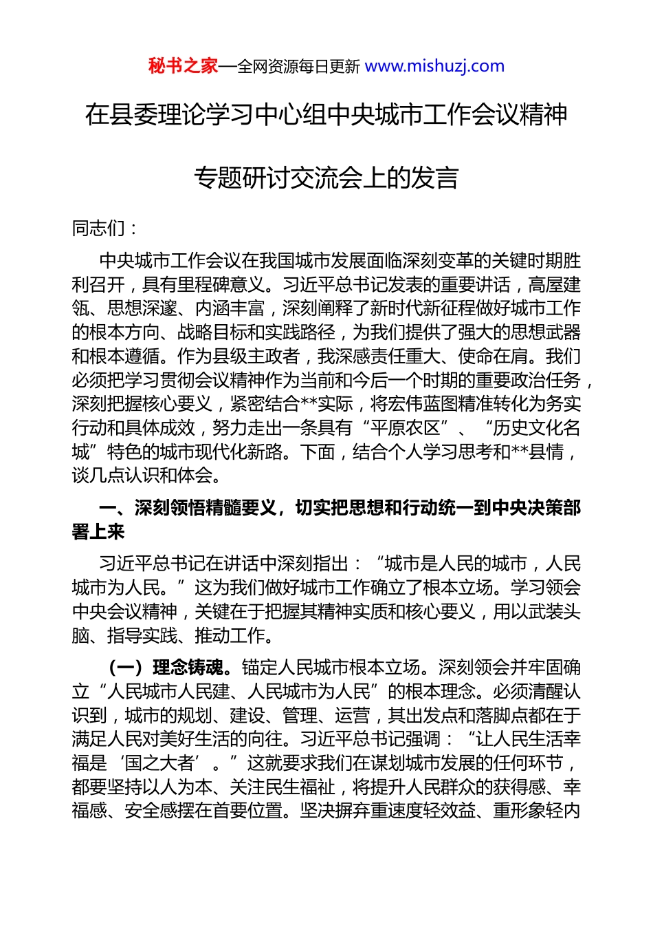 秘书之家—全网资源每日更新 www.mishuzj.com在县委理论学习中心组中央城市工作会议精神专题研讨交流会上的发言同志们:中央城市工作会议在我国城市发展面临深刻变革的关键时期胜利召开,具有里程碑意义。习近平总书记发表的重要讲话,高屋建瓴、思想深邃、内涵丰富,深刻阐释了新时代新征程做好城市工作的根本方向、战略目标和实践路径,为我们提供了强大的思想武器和根本遵循。作为县级主政者,我深感责任重大、使命在肩。我们必须把学习贯彻会议精神作为当前和今后一个时期的重要政治任务,深刻把握核心要义,紧密结合**实际,将宏伟蓝图精准转化为务实行动和具体成效,努力走出一条具有“平原农区”、“历史文化名城”特色的城市现代化新路。下面,结合个人学习思考和**县情,谈几点认识和体会。一、深刻领悟精髓要义,切实把思想和行动统一到中央决策部署上来习近平总书记在讲话中深刻指出:“城市是人民的城市,人民城市为人民。”这为我们做好城市工作确立了根本立场。学习领会中央会议精神,关键在于把握其精神实质和核心要义,用以武装头脑、指导实践、推动工作。(一)理念铸魂。锚定人民城市根本立场。深刻领会并牢固确立“人民城市人民建、人民城市为人民”的根本理念。必须清醒认识到,城市的规划、建设、管理、运营,其出发点和落脚点都在于满足人民对美好生活的向往。习近平总书记强调:“让人民生活幸福是‘国之大者’。”这就要求我们在谋划城市发展的任何环节,都要坚持以人为本、关注民生福祉,将提升人民群众的获得感、幸福感、安全感摆在首要位置。坚决摒弃重速度轻效益、重形象轻内秘书之家—全网资源每日更新 www.mishuzj.com涵、重开发轻保护的错误观念和发展方式。对于**而言,就是要立足我县人口结构、产业现状、地理特征和历史文化底蕴,在推进城镇化进程中,始终聚焦群众急难愁盼,着力解决人居环境改善、公共服务短板、住房安居保障、就业增收渠道等核心民生关切。要深入理解城市作为一个有机生命体的科学内涵,尊重城市发展客观规律,避免急功近利的建设行为,注重规划的前瞻性、协调性、可持续性。要以提升**人民的生活品质为核心目标,将高质量发展的要求贯穿城市工作始终,实现城市的和谐共生和人民安居乐业。(二)要义贯通。把握内涵发展核心要求。系统理解并精准把握推动城市工作转向“内涵式发展”的战略要求。会议明确指出,我国城镇化已进入新的发展阶段,从大规模增量扩张转向存量提质增效为主。习近平总书记曾多次强调,“城市发展不能只考虑规模经济效益,必须把生态和安全放在更加突出的位置”。这一论断对于我们县级城市发展尤为关键。**作为发展中的县城,必须深刻认识到,未来城市竞争力的提升,关键在于“质”而非单纯“量”的扩张,在于功能的完善而非边界的延伸,在于治理能力的优化而非表面的繁华。要将“创新、宜居、美丽、韧性、文明、智慧”的目标定位,全面融入城市发展的顶层设计和实施路径中。重点强调“优化体系、提升动能、塑造品质、赓续文脉、增进治理、保障安全”等关键维度,形成高质量发展的系统合力。这就亟需我们转变过去比较粗放的城市发展模式,更加注重集约节约利用资源要素,更加注重生态环境容量约束,更加注重基础设施的韧性和可靠性,更加注重文化软实力的培育和城市特色风貌的保护,走绿色低碳、精明增长、可持续的内涵式发展道路。(三)实践对表。校准县域治理重点任务。全面对标并坚决贯彻落实中央部署的七项重点任务。中央会议立足全局和长远,系统部署了优化城市体系、建设创新城市、宜居城市、美丽城市、韧性城市、文明城市、智慧城市等重大任务。这些任务是“以人民为中心”发展思想和“内涵式发展”战略要求的具体展开。对于**而言,落实这些任务必须坚持一切从实际出发。一要强化“组团”意识,秘书之家—全网资源每日更新 www.mishuzj.com深刻认识自身在**省城镇体系和**市域发展格局中的定位,既要主动融入区域协调联动,更要突出发展特色,精准把握“县城为重要载体”的战略机遇,在农业转移人口市民化、城乡融合发展中展现担当。二要突出“创新引领”,结合我县产业发展基础和优势,积...