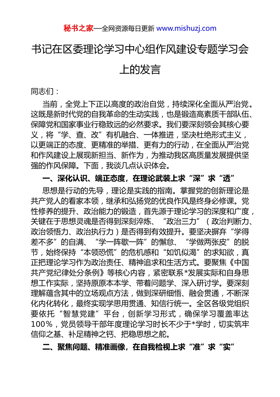 秘书之家—全网资源每日更新 www.mishuzj.com书记在区委理论学习中心组作风建设专题学习会上的发言同志们:当前,全党上下正以高度的政治自觉,持续深化全面从严治党。这既是新时代党的自我革命的生动实践,也是锻造高素质干部队伍、保障党和国家事业行稳致远的必然要求。我们要深刻领会其核心要义,将“学、查、改”有机融合、一体推进,坚决杜绝形式主义,以更端正的态度、更精准的举措、更有力的行动,在全面从严治党和作风建设上展现新担当、新作为,为推动我区高质量发展提供坚强的作风保障。下面,我谈几点认识体会。一、深化认识、端正态度,在理论武装上求“深”求“透”思想是行动的先导,理论是实践的指南。掌握党的创新理论是共产党人的看家本领,继承和弘扬党的优良作风是终身必修课。党性修养的提升、政治能力的锻造,首先源于理论学习的深度和广度,关键在于思想灵魂是否得到深刻淬炼、“政治三力”(政治判断力、政治领悟力、政治执行力)是否得到有效提升。要坚决摒弃“学得差不多”的自满、“学一阵歇一阵”的懈怠、“学做两张皮”的脱节,始终保持“本领恐慌”的危机感和“如饥似渴”的求知欲,真正把理论学习作为政治责任、精神追求和生活方式。要聚焦《中国共产党纪律处分条例》等核心内容,紧密联系*发展实际和自身思想工作实际,坚持原原本本学、带着问题学、深入研讨学。要深刻理解蕴含其中的立场观点方法,做到深研细悟、融会贯通,不断深化内化转化,最终实现学思用贯通、知信行统一。全区各级党组织要依托“智慧党建”平台,创新学习形式,确保学习覆盖率达100%,党员领导干部年度理论学习时长不少于*学时,切实筑牢信仰之基、补足精神之钙、把稳思想之舵。二、聚焦问题、精准画像,在自我检视上求“准”求“实”秘书之家—全网资源每日更新 www.mishuzj.com查摆问题是一场触及灵魂的自我革命,是检验作风成效的试金石,务必精准深入,绝不能避重就轻、浮于表面。全区党员干部要秉持“闻过则喜、知过不讳”的坦荡胸怀,发扬“最讲认真”的优良作风,严格对照各级纪律规定这面镜子,主动把自己摆进去、把职责摆进去、把工作摆进去。要坚持开门纳谏、广开言路,综合运用民主生活会、组织生活会、谈心谈话、调查研究、设立意见箱、网络平台等多种渠道,深入查找问题。既要诚恳接受上级点出的问题,也要主动对标对表查找自身差距;既要虚心听取同事的意见建议,更要敞开大门倾听群众反映强烈的急难愁盼问题,特别是涉及“放管服”改革、营商环境优化、民生保障等方面的堵点痛点。要聚焦思想认识是否到位、工作作风是否扎实、纪律执行是否严格、服务群众是否用心等关键维度,进行全方位、立体式的扫描体检,确保问题查摆有的放矢、精准聚焦、画像清晰。要注重运用反面典型案例开展警示教育,根据我区近三年梳理*条作风问题线索,查处的*起违反纪律规定精神问题,深刻剖析、举一反三,做到“一案一剖析、一事一反思”,把“别人的教训”变成“自己的镜子”,切实增强风险意识,做到防微杜渐。三、动真碰硬、务求实效,在整改落实上求“严”求“效”习近平总书记深刻指出:“作风问题核心是党同人民群众的关系问题。”问题的整改落实,直接体现党员干部的责任担当,直接关系党的执政根基和公信力。抓整改,必须将人民群众满意不满意作为根本标尺。今年,我们要将问题整改成效纳入高质量发展综合考核体系,权重不低于*%,推动形成一级抓一级、层层抓落实的整改责任闭环。在学习教育中,对于查摆出的问题,要逐项梳理、建立台账、深挖根源、明确责任、限定时限。要坚持“当下改”与“长久立”相结合,正确处理“快”与“稳”的关系,对于能够立即解决的问题,要立行立改、雷厉风行,展现“马上就办、真抓实干”的作风;对于涉及面广、成因复杂的深层次问题,要发扬钉钉子精神,稳扎稳打、步步为营,建立长效机制,防止问题反弹回潮。要建立健全问题整改动态跟踪、督查督办、评估反馈机制,严格实秘书之家—全网资源每日更新 www.mishuzj.com行整改销号管理,做到解决一个、销号一个、巩固一个,坚决杜绝“数字整改”“纸面整改”,避免急于“赶工期”、凑“...