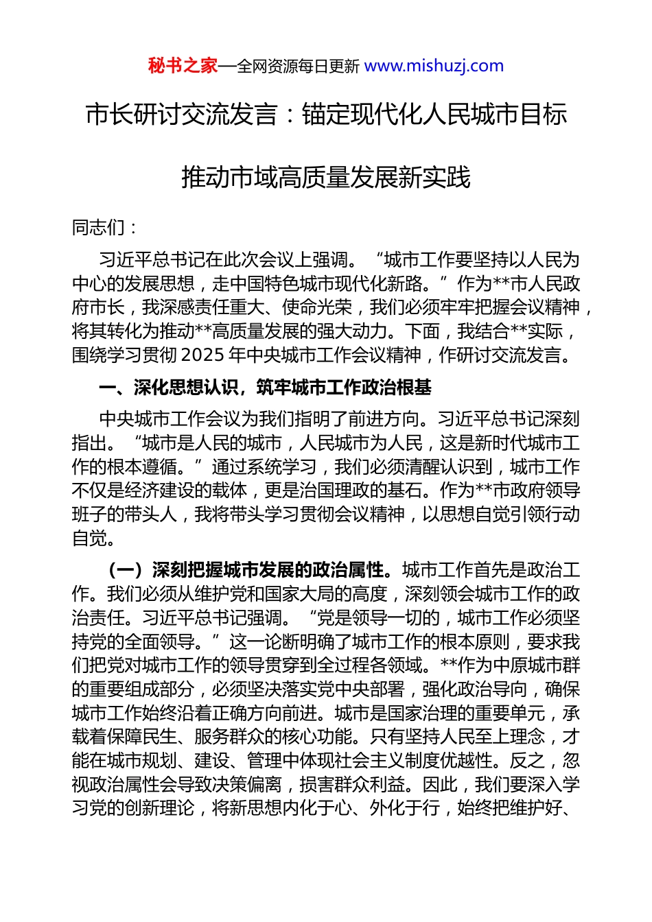 秘书之家—全网资源每日更新 www.mishuzj.com市长研讨交流发言:锚定现代化人民城市目标 推动市域高质量发展新实践同志们:习近平总书记在此次会议上强调。“城市工作要坚持以人民为中心的发展思想,走中国特色城市现代化新路。”作为**市人民政府市长,我深感责任重大、使命光荣,我们必须牢牢把握会议精神,将其转化为推动**高质量发展的强大动力。下面,我结合**实际,围绕学习贯彻 2025 年中央城市工作会议精神,作研讨交流发言。一、深化思想认识,筑牢城市工作政治根基中央城市工作会议为我们指明了前进方向。习近平总书记深刻指出。“城市是人民的城市,人民城市为人民,这是新时代城市工作的根本遵循。”通过系统学习,我们必须清醒认识到,城市工作不仅是经济建设的载体,更是治国理政的基石。作为**市政府领导班子的带头人,我将带头学习贯彻会议精神,以思想自觉引领行动自觉。(一)深刻把握城市发展的政治属性。城市工作首先是政治工作。我们必须从维护党和国家大局的高度,深刻领会城市工作的政治责任。习近平总书记强调。“党是领导一切的,城市工作必须坚持党的全面领导。”这一论断明确了城市工作的根本原则,要求我们把党对城市工作的领导贯穿到全过程各领域。**作为中原城市群的重要组成部分,必须坚决落实党中央部署,强化政治导向,确保城市工作始终沿着正确方向前进。城市是国家治理的重要单元,承载着保障民生、服务群众的核心功能。只有坚持人民至上理念,才能在城市规划、建设、管理中体现社会主义制度优越性。反之,忽视政治属性会导致决策偏离,损害群众利益。因此,我们要深入学习党的创新理论,将新思想内化于心、外化于行,始终把维护好、秘书之家—全网资源每日更新 www.mishuzj.com发展好人民根本利益作为一切工作的出发点和落脚点。只有这样,**才能在城市发展中坚守初心使命。各级干部必须强化理论武装,通过中心组学习等形式,深学细悟会议精神,以高度的政治责任感和历史使命感,推动**城市工作高质量发展。(二)全面理解城市现代化的内涵式发展。城市现代化不仅是规模扩张,更要坚持内涵式发展。习近平总书记强调。“城市发展要从增量扩张转向提质增效,走内涵式道路。”这一指示深刻揭示了我国城市转型的新趋势,要求我们摒弃粗放模式,聚焦结构优化和动能转换。内涵式发展强调质量优先、效益为先,是新时期城市工作的核心要求。对于**而言,必须围绕创新、宜居、美丽、韧性、文明、智慧的目标,推动城市整体品质提升。这一发展模式注重系统协同,要求我们把空间结构、产业结构、基础设施和公共服务统筹起来,避免碎片化治理。如果我们忽视内涵式发展,只追求速度而忽略质量,将无法适应经济社会高质量发展的需要。因此,**要以城市更新为抓手,强化精细化管理,在绿色低碳、文化传承、智慧治理等领域突破瓶颈。全市各级政府必须树立正确政绩观,通过建立健全城市发展评价体系,引导资源向短板领域倾斜,让**真正成为人民满意的现代化城市。(三)牢固树立安全发展底线思维。城市安全是发展的前提和保障。习近平总书记强调。“要牢牢守住城市安全底线,确保人民安居乐业。”这要求我们在城市工作中必须增强忧患意识,全面防范化解重大风险。城市安全涉及生命安全、生产安全、生态安全等多维层面,**作为黄河沿岸城市,面临着水患风险叠加产业转型的挑战,需要更加注重韧性建设。安全发展底线思维强调未雨绸缪,要求在规划阶段就将安全因素前置,严格实施基础设施生命线工程,强化自然灾害防治能力。如果我们麻痹松懈,一旦出现安全事件,必将造成不可逆的损失。因此,我们要加强安全监管体系建设,完善城市风险识别和应急处置机制,在防洪内涝治理、危旧房改造等工作中发力。党员干部要以身作则,弘扬责任担当精神,通过日常秘书之家—全网资源每日更新 www.mishuzj.com培训和实战演练,提升队伍专业能力。**将把安全文化融入城市建设血脉,为人民群众打造安全可靠的生存环境。二、精准谋划落实路径,优化城市发展体制机制在深化思想认识的基础上,我们必须把会议精神转化为具体实践。习近平总书记强调。“城市工作要着力提高落实各...