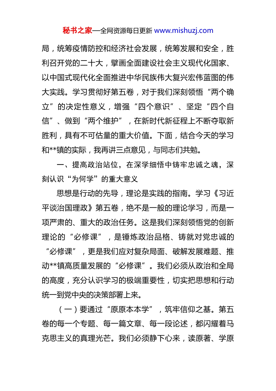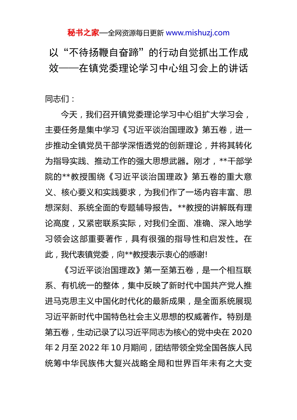 秘书之家—全网资源每日更新 www.mishuzj.com以“不待扬鞭自奋蹄”的行动自觉抓出工作成效——在镇党委理论学习中心组习会上的讲话 同志们:今天,我们召开镇党委理论学习中心组扩大学习会,主要任务是集中学习《习近平谈治国理政》第五卷,进一步推动全镇党员干部学深悟透党的创新理论,并将其转化为指导实践、推动工作的强大思想武器。刚才,**干部学院的**教授围绕《习近平谈治国理政》第五卷的重大意义、核心要义和实践要求,为我们作了一场内容丰富、思想深刻、系统全面的专题辅导报告。**教授的讲解既有理论高度,又紧密联系实际,对我们全面、准确、深入地学习领会这部重要著作,具有很强的指导性和启发性。在此,我代表镇党委,向**教授表示衷心的感谢!《习近平谈治国理政》第一至第五卷,是一个相互联系、有机统一的整体,集中反映了新时代中国共产党人推进马克思主义中国化时代化的最新成果,是全面系统展现习近平新时代中国特色社会主义思想的权威著作。特别是第五卷,生动记录了以习近平同志为核心的党中央在 2020年 2 月至 2022 年 10 月期间,团结带领全党全国各族人民统筹中华民族伟大复兴战略全局和世界百年未有之大变秘书之家—全网资源每日更新 www.mishuzj.com局,统筹疫情防控和经济社会发展,统筹发展和安全,胜利召开党的二十大,擘画全面建设社会主义现代化国家、以中国式现代化全面推进中华民族伟大复兴宏伟蓝图的伟大实践。学习贯彻好第五卷,对于我们深刻领悟“两个确立”的决定性意义,增强“四个意识”、坚定“四个自信”、做到“两个维护”,在新时代新征程上不断夺取新胜利,具有不可估量的重大价值。下面,结合今天的学习和**镇的实际,我再讲三点意见,与同志们共勉。一、提高政治站位,在深学细悟中铸牢忠诚之魂,深刻认识“为何学”的重大意义思想是行动的先导,理论是实践的指南。学习《习近平谈治国理政》第五卷,绝不是一般的理论学习,而是一项严肃的、重大的政治任务。这是我们深刻领悟党的创新理论的“必修课”,是锤炼政治品格、铸就对党忠诚的“必修课”,更是我们应对复杂局面、破解发展难题、推动**镇高质量发展的“必修课”。我们必须从政治和全局的高度,充分认识学习的极端重要性,切实把思想和行动统一到党中央的决策部署上来。(一)要通过“原原本本学”,筑牢信仰之基。第五卷的每一个专题、每一篇文章、每一段论述,都闪耀着马克思主义的真理光芒。我们必须静下心来,读原著、学原秘书之家—全网资源每日更新 www.mishuzj.com文、悟原理,逐篇研读、逐段领悟,切忌浅尝辄止、浮于表面。要深刻把握贯穿其中的历史逻辑、理论逻辑和实践逻辑,不仅要知其然,更要知其所以然,还要知其所以必然。要深刻理解其中关于“中国之问、世界之问、人民之问、时代之问”的深邃回答,真正掌握蕴含其中的马克思主义立场、观点、方法,把蕴含的道理学理哲理内化于心。只有这样,我们才能真正理解习近平新时代中国特色社会主义思想是如何在新时代的伟大斗争中形成并不断丰富发展的,才能更加坚定对马克思主义的信仰、对中国特色社会主义的信念、对实现中华民族伟大复兴的信心。(二)要通过“融会贯通学”,补足精神之钙。学习第五卷,不能孤立地看,要同学习第一、二、三、四卷贯通起来,同学习党的二十大精神和党中央近期作出的一系列重大决策部署结合起来。要深刻认识到,从第一卷到第五卷,贯穿着一条鲜明的主线,那就是坚持和发展中国特色社会主义。这是一个持续深化、不断拓展的理论体系。我们要从中深刻领会习近平总书记作为马克思主义政治家、思想家、战略家的恢弘视野、远见卓识和雄韬伟略。通过系统学习,我们要更加清晰地看到,第五卷所提出的许多新思想、新观点、新论断,既与前四卷一脉相承,又具有鲜明的创新性和时代性,是党的理论创新的最新成秘书之家—全网资源每日更新 www.mishuzj.com果。这种融会贯通的学习,能够帮助我们更全面、更系统地把握这一思想的科学体系和精神实质,从而不断精神之钙,把稳思想之舵。(三)要通过“联系实际学”,夯实成事之本。理论的价值在于指导实践,学习的成效要靠实践来检验。...