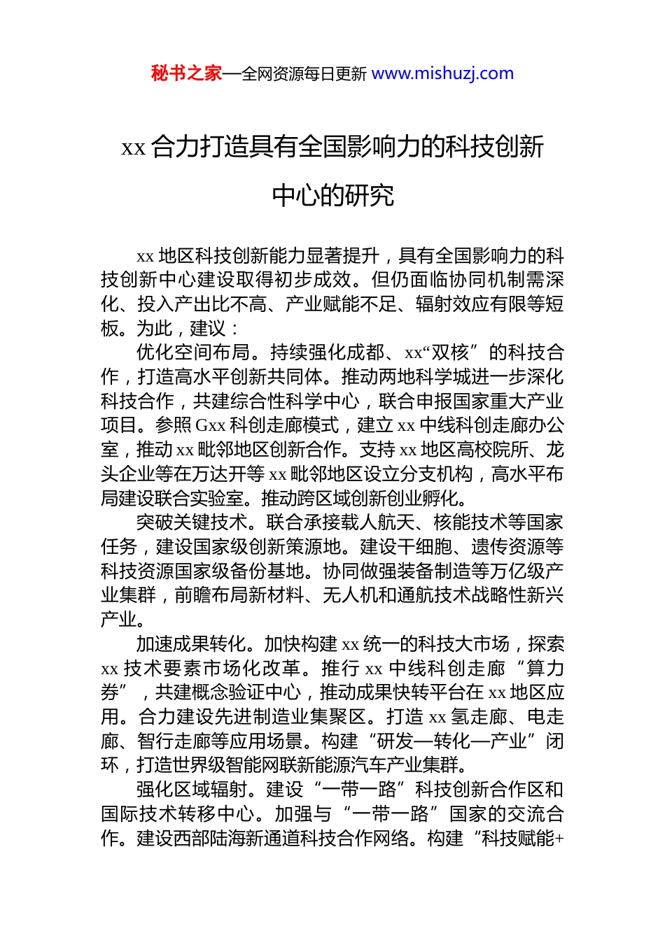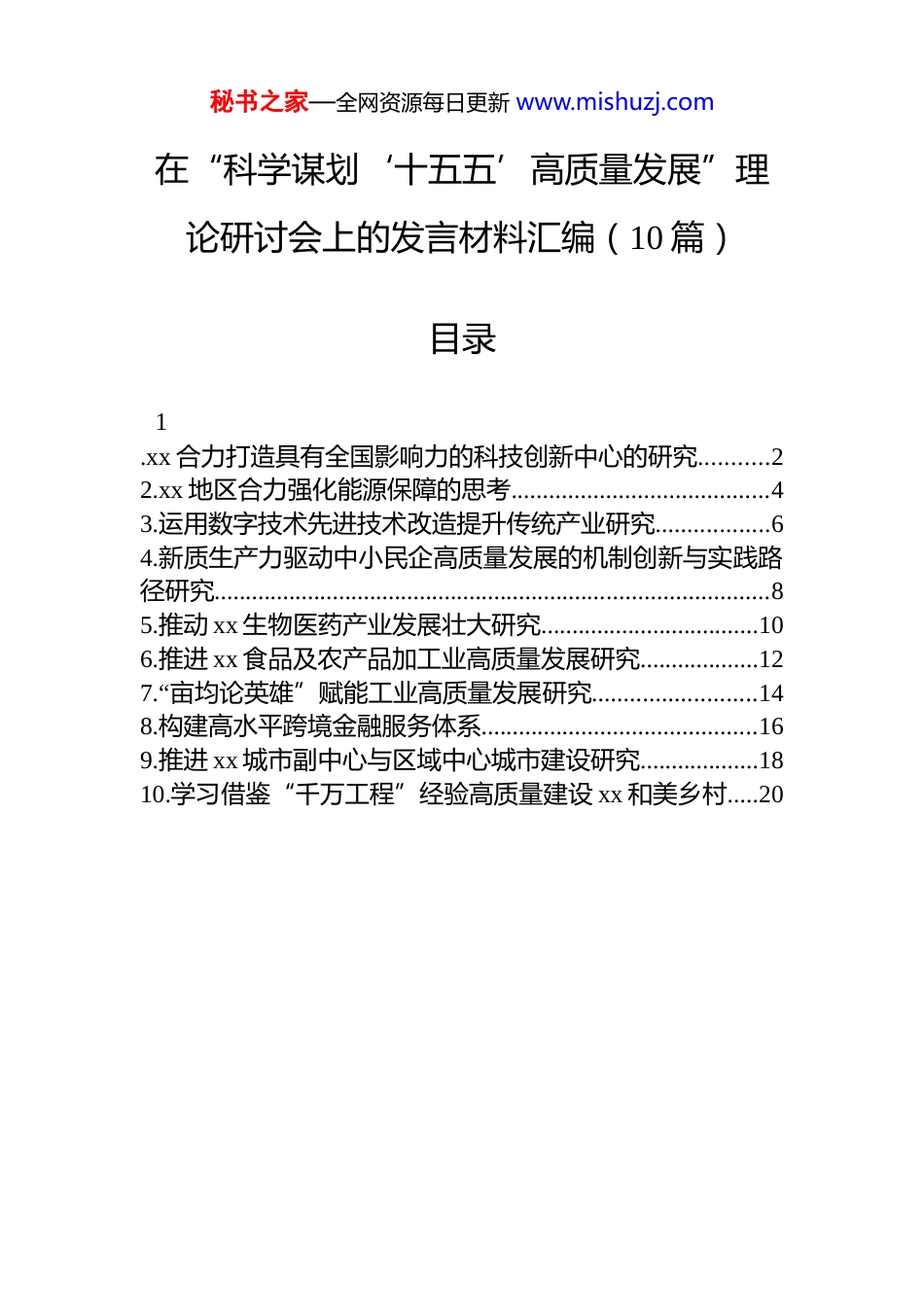 秘书之家—全网资源每日更新 www.mishuzj.com在“科学谋划‘十五五’高质量发展”理论研讨会上的发言材料汇编(10 篇)目录1.xx 合力打造具有全国影响力的科技创新中心的研究...........22.xx 地区合力强化能源保障的思考.........................................43.运用数字技术先进技术改造提升传统产业研究..................64.新质生产力驱动中小民企高质量发展的机制创新与实践路径研究.........................................................................................85.推动 xx 生物医药产业发展壮大研究...................................106.推进 xx 食品及农产品加工业高质量发展研究...................127.“亩均论英雄”赋能工业高质量发展研究..........................148.构建高水平跨境金融服务体系............................................169.推进 xx 城市副中心与区域中心城市建设研究...................1810.学习借鉴“千万工程”经验高质量建设 xx 和美乡村.....20秘书之家—全网资源每日更新 www.mishuzj.comxx 合力打造具有全国影响力的科技创新中心的研究xx 地区科技创新能力显著提升,具有全国影响力的科技创新中心建设取得初步成效。但仍面临协同机制需深化、投入产出比不高、产业赋能不足、辐射效应有限等短板。为此,建议:优化空间布局。持续强化成都、xx“双核”的科技合作,打造高水平创新共同体。推动两地科学城进一步深化科技合作,共建综合性科学中心,联合申报国家重大产业项目。参照 Gxx 科创走廊模式,建立 xx 中线科创走廊办公室,推动 xx 毗邻地区创新合作。支持 xx 地区高校院所、龙头企业等在万达开等 xx 毗邻地区设立分支机构,高水平布局建设联合实验室。推动跨区域创新创业孵化。突破关键技术。联合承接载人航天、核能技术等国家任务,建设国家级创新策源地。建设干细胞、遗传资源等科技资源国家级备份基地。协同做强装备制造等万亿级产业集群,前瞻布局新材料、无人机和通航技术战略性新兴产业。加速成果转化。加快构建 xx 统一的科技大市场,探索xx 技术要素市场化改革。推行 xx 中线科创走廊“算力券”,共建概念验证中心,推动成果快转平台在 xx 地区应用。合力建设先进制造业集聚区。打造 xx 氢走廊、电走廊、智行走廊等应用场景。构建“研发—转化—产业”闭环,打造世界级智能网联新能源汽车产业集群。强化区域辐射。建设“一带一路”科技创新合作区和国际技术转移中心。加强与“一带一路”国家的交流合作。建设西部陆海新通道科技合作网络。构建“科技赋能+秘书之家—全网资源每日更新 www.mishuzj.com资源互补”的跨域协同范式,将物流通道建设成为科技资源流动的高速路。强化与 xx 其他省域的科技创新联动。推进与 xx、xx、xx 等省区多元合作,打造创新共同体。秘书之家—全网资源每日更新 www.mishuzj.comxx 地区合力强化能源保障的思考近年来,xx 地区逐步成为天然气页岩气重要产储运枢纽,x 气东送、西电东送汇集外输区,同时 xx 也是我国西部的制造业重镇,还要为产业的不断发展提供能源保障。但 xx 地区在合力强化能源保障方面仍存在政策规划待支持、统筹协调待加强、设施建设待提升、链条建设待畅通等问题。为此,建议:聚焦节点定位支持,争取国家政策和项目支持。一是明确具体功能定位。争取纳入国家“十五五”能源发展规划,明确其作为国家能源安全保障重要节点的功能定位。二是争取先行先试。三是争取设立国家机构和平台。聚焦区域协作共建,推动强化统筹协调。一是强化区域协同政策。推动 xx 地区能源规划一体化,建立跨区域能源协同机制,推动区域能源市场互联,签订能源互助协议,实现能源资源优化配置。二是推动能源与产业深度耦合。争取建设国家级新能源装备制造基地,打造 xx 综合能源智慧走廊,加强两地在能源领域的合作。三是完善政策支持与保障机制。聚焦基础设施建设,谋划布局相关通道工程。一是进一步整合多式联运能源网络。整合长江黄金水道、中欧班列、天然气管网等物流通道,提高西气东输与 x 气出 x 管线之间...