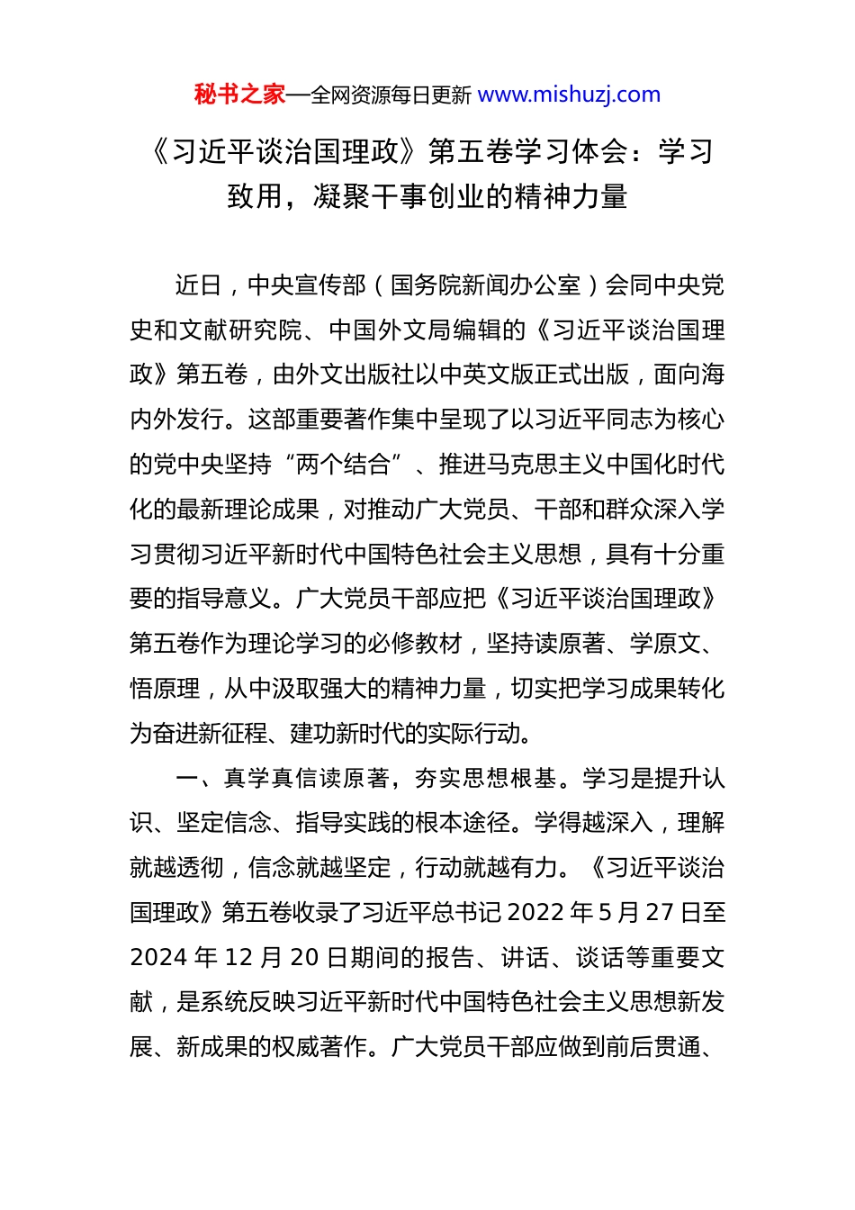 秘书之家—全网资源每日更新 www.mishuzj.com《习近平谈治国理政》第五卷学习体会:学习致用,凝聚干事创业的精神力量 近日,中央宣传部(国务院新闻办公室)会同中央党史和文献研究院、中国外文局编辑的《习近平谈治国理政》第五卷,由外文出版社以中英文版正式出版,面向海内外发行。这部重要著作集中呈现了以习近平同志为核心的党中央坚持“两个结合”、推进马克思主义中国化时代化的最新理论成果,对推动广大党员、干部和群众深入学习贯彻习近平新时代中国特色社会主义思想,具有十分重要的指导意义。广大党员干部应把《习近平谈治国理政》第五卷作为理论学习的必修教材,坚持读原著、学原文、悟原理,从中汲取强大的精神力量,切实把学习成果转化为奋进新征程、建功新时代的实际行动。一、真学真信读原著,夯实思想根基。学习是提升认识、坚定信念、指导实践的根本途径。学得越深入,理解就越透彻,信念就越坚定,行动就越有力。《习近平谈治国理政》第五卷收录了习近平总书记 2022 年 5 月 27 日至2024 年 12 月 20 日期间的报告、讲话、谈话等重要文献,是系统反映习近平新时代中国特色社会主义思想新发展、新成果的权威著作。广大党员干部应做到前后贯通、秘书之家—全网资源每日更新 www.mishuzj.com系统学习,将第五卷与前四卷有机结合起来,深刻把握其内在逻辑和理论脉络。该著作集中体现了党中央统筹“两个大局”,完整、准确、全面贯彻新发展理念,推动高质量发展,谋划和推进全面深化改革的生动历程。要通过学习,掌握贯穿其中的马克思主义立场、观点、方法,深化对“中国理念”“中国方案”和“中国智慧”的理解,持续刷新个人的理论认知体系。要坚持联系思想和工作实际,突出重点、学以致用,不断强化对党忠诚、坚定信念、增强自觉、压实担当、提升能力。要深刻领悟“两个确立”的决定性意义,在真学、真信、真懂、真用中筑牢信仰根基、补足精神之钙、锻造忠诚品格,为实现党的二十大描绘的宏伟蓝图凝聚奋斗力量。二、真心真情谋发展,恪守为民初心。人民就是江山,江山就是人民。《习近平谈治国理政》第五卷中,从“中国式现代化是全体人民共同富裕的现代化”到“发展全过程人民民主”,从“让每一个中国人都过上美好生活”到“促进高质量充分就业”,处处体现了习近平总书记深厚的人民情怀,生动诠释了我们党以人民为中心的发展思想。广大党员干部应从著作中深刻感悟为民服务的根本宗旨,掌握为民解忧、为民造福的路径方法。要牢固树立人民至上理念,始终站稳人民立场,永葆为民初心,做秘书之家—全网资源每日更新 www.mishuzj.com到无私奉献。要坚持把人民放在心中最高位置,把不断增进民生福祉作为发展的根本目标,紧扣保障和改善民生这一重点,聚焦群众最关心、最直接、最现实的利益问题,思民之所虑、行民之所盼。例如,在教育领域,要大力促进教育公平与质量提升;在就业方面,要积极拓展就业渠道、提升就业质量。要着力解决群众急难愁盼问题,努力提供更优质的教育、更稳定的工作、更满意的收入,让人民群众的生活持续改善,获得感、幸福感、安全感更加充实、更有保障、更可持续。三、真抓真干强作风,永葆清正廉洁。为政清廉才能取信于民,秉公用权才能赢得人心。在当前全党全国各族人民意气风发迈向第二个百年奋斗目标的关键时期,《习近平谈治国理政》第五卷的出版,对广大党员干部提出了新的更高要求。习近平总书记强调,“全党同志要把老一辈革命家和共产党人留下的光荣传统和优良作风传承好发扬好”,“要把纪律建设摆在更加突出位置,党规制定、党纪教育、执纪监督全过程都要贯彻严的要求,既让铁纪‘长牙’、发威,又让干部重视、警醒、知止”。在新的赶考之路上,广大党员干部要从《习近平谈治国理政》第五卷中感悟清廉淡泊之气,发扬艰苦奋斗优良传统,锤炼克己奉公的精神品格。要始终保持对人民、对组织、对法秘书之家—全网资源每日更新 www.mishuzj.com纪的敬畏之心,做到公正用权、依法用权、为民用权、廉洁用权,坚守共产党人清正廉洁的政治本色。要正确处理公与私、义与利、是与非、情与法、亲与清、俭与奢、苦与乐、得...