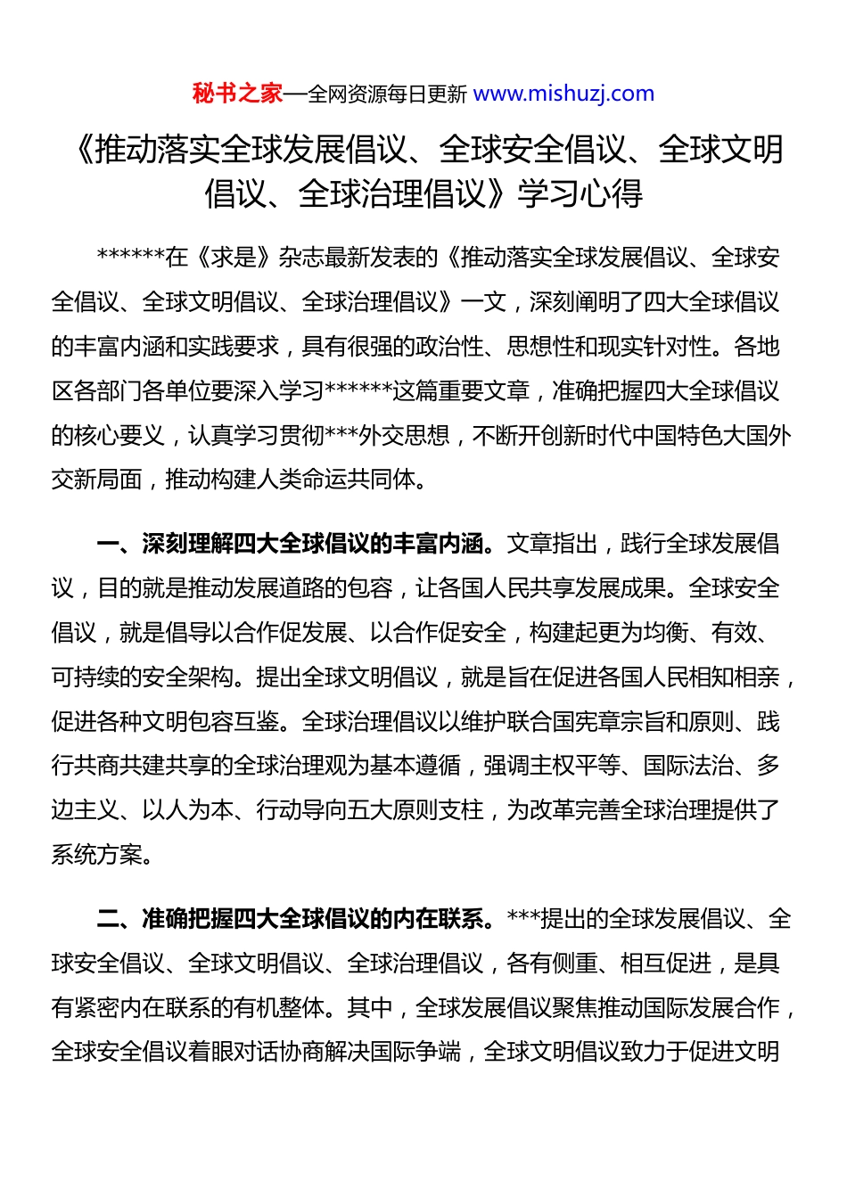 秘书之家—全网资源每日更新 www.mishuzj.com《推动落实全球发展倡议、全球安全倡议、全球文明倡议、全球治理倡议》学习心得******在《求是》杂志最新发表的《推动落实全球发展倡议、全球安全倡议、全球文明倡议、全球治理倡议》一文,深刻阐明了四大全球倡议的丰富内涵和实践要求,具有很强的政治性、思想性和现实针对性。各地区各部门各单位要深入学习******这篇重要文章,准确把握四大全球倡议的核心要义,认真学习贯彻***外交思想,不断开创新时代中国特色大国外交新局面,推动构建人类命运共同体。一、深刻理解四大全球倡议的丰富内涵。文章指出,践行全球发展倡议,目的就是推动发展道路的包容,让各国人民共享发展成果。全球安全倡议,就是倡导以合作促发展、以合作促安全,构建起更为均衡、有效、可持续的安全架构。提出全球文明倡议,就是旨在促进各国人民相知相亲,促进各种文明包容互鉴。全球治理倡议以维护联合国宪章宗旨和原则、践行共商共建共享的全球治理观为基本遵循,强调主权平等、国际法治、多边主义、以人为本、行动导向五大原则支柱,为改革完善全球治理提供了系统方案。二、准确把握四大全球倡议的内在联系。***提出的全球发展倡议、全球安全倡议、全球文明倡议、全球治理倡议,各有侧重、相互促进,是具有紧密内在联系的有机整体。其中,全球发展倡议聚焦推动国际发展合作,全球安全倡议着眼对话协商解决国际争端,全球文明倡议致力于促进文明秘书之家—全网资源每日更新 www.mishuzj.com交流互鉴,全球治理倡议锚定全球治理体制机制改革的方向、原则和路径。四大全球倡议从发展、安全、文明、治理四个维度,为共建美好世界注入强劲动能,为推动构建人类命运共同体提供战略引领,充分彰显了中国的全球视野、世界情怀和国际担当。三、争做四大全球倡议的笃行者践行者。从中国主张到国际共识,从合作理念到共同行动,四大全球倡议已经产生了日益广泛而深远的影响。中国是四大全球倡议的提出者,更是推动落实的行动派,各地区各部门各单位要认真学习贯彻***重要讲话精神,领会核心要义、把握实践要求,牢记四大全球倡议的初心使命,弘扬四大全球倡议,坚持合作共赢,以更坚定的信心、更有力的措施,携手高质量共建“一带一路”等倡议,高质量实施《区域全面经济伙伴关系协定》,做深化全球合作的行动派与人类命运共同体的笃行者,做推动四大全球倡议行稳致远的践行者。