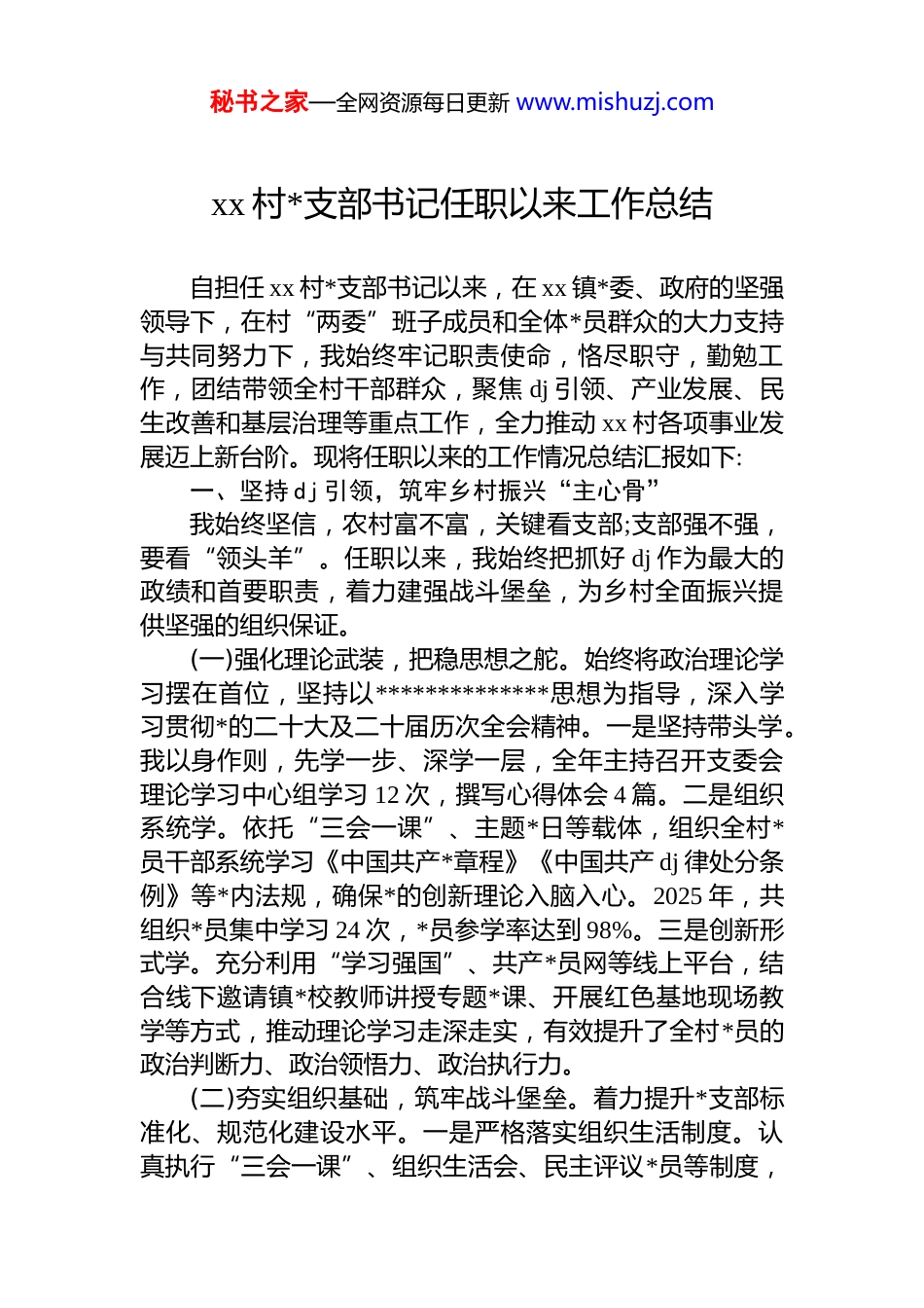 秘书之家—全网资源每日更新 www.mishuzj.comxx 村*支部书记任职以来工作总结自担任 xx 村*支部书记以来,在 xx 镇*委、政府的坚强领导下,在村“两委”班子成员和全体*员群众的大力支持与共同努力下,我始终牢记职责使命,恪尽职守,勤勉工作,团结带领全村干部群众,聚焦 dj 引领、产业发展、民生改善和基层治理等重点工作,全力推动 xx 村各项事业发展迈上新台阶。现将任职以来的工作情况总结汇报如下:一、坚持 dj 引领,筑牢乡村振兴“主心骨”我始终坚信,农村富不富,关键看支部;支部强不强,要看“领头羊”。任职以来,我始终把抓好 dj 作为最大的政绩和首要职责,着力建强战斗堡垒,为乡村全面振兴提供坚强的组织保证。(一)强化理论武装,把稳思想之舵。始终将政治理论学习摆在首位,坚持以**************思想为指导,深入学习贯彻*的二十大及二十届历次全会精神。一是坚持带头学。我以身作则,先学一步、深学一层,全年主持召开支委会理论学习中心组学习 12 次,撰写心得体会 4 篇。二是组织系统学。依托“三会一课”、主题*日等载体,组织全村*员干部系统学习《中国共产*章程》《中国共产 dj 律处分条例》等*内法规,确保*的创新理论入脑入心。2025 年,共组织*员集中学习 24 次,*员参学率达到 98%。三是创新形式学。充分利用“学习强国”、共产*员网等线上平台,结合线下邀请镇*校教师讲授专题*课、开展红色基地现场教学等方式,推动理论学习走深走实,有效提升了全村*员的政治判断力、政治领悟力、政治执行力。(二)夯实组织基础,筑牢战斗堡垒。着力提升*支部标准化、规范化建设水平。一是严格落实组织生活制度。认真执行“三会一课”、组织生活会、民主评议*员等制度,秘书之家—全网资源每日更新 www.mishuzj.com全年召开*员大会 4 次,支委会 12 次,讲授专题*课 4 次。通过严肃认真的*内政治生活,不断增强*组织的凝聚力和战斗力。二是丰富主题*日活动。围绕中心工作,精心设计活动载体,组织开展了“*旗在振兴一线高高飘扬”、“我为群众办实事”等系列主题*日活动 12 次,引导*员在产业发展、环境整治、文明创建等工作中亮身份、当先锋、作表率。三是加强阵地建设。投入资金 5 万元对村*群服务中心进行升级改造,完善了*员活动室、“三亮三比”墙等功能设施,使其成为服务*员、教育群众的坚实阵地。(三)加强队伍建设,激活源头活水。注重*员队伍的教育、管理和发展。一是严把*员“入口关”。坚持标准、严格程序,重点从农村致富带头人、返乡创业青年、退役军人等群体中发展*员。2025 年,共发展新*员 2 名,培养入*积极分子 4 名,为*组织注入了新鲜血液。二是搭建干事“练兵场”。建立*员设岗定责制度,设立政策宣传、民情收集、产业发展等 10 个*员先锋岗,让每位*员都有岗有责,在服务群众和推动发展中锤炼*性、增长才干。三是树立先进“风向标”。积极评选表彰“优秀共产*员”、“*员致富带众标兵”,并将其先进事迹在村务公开栏进行宣传,营造了学先进、赶先进、当先进的浓厚氛围。(四)擦亮 dj 品牌,彰显引领实效。通过持续有力的 dj工作,我村*支部的组织力、号召力和影响力显著提升。2025 年,我村*支部被 xx 市委授予“先进基层*组织”荣誉称号,同时被 xx 县委评为“人居环境整治工作先进*支部”,并成功入选“全市乡村治理‘过硬*支部’”名单。这些荣誉的取得,是对我们工作的肯定,更是对未来发展的鞭策。二、聚焦产业发展,激活经济增长“新引擎”发展是解决农村一切问题的基础和关键。我带领“两委”班子,立足本村资源禀赋,坚持市场导向,大力发展特色产业,千方百计拓宽村集体和村民的增收渠道。(一)做强特色产业,壮大集体经济。为破解村级集体经秘书之家—全网资源每日更新 www.mishuzj.com济薄弱的难题,我们深入调研论证,决定实施“造血”项目。一是成功落地 xx 村光伏发电与电商中心一体化项目。该项目自 2024 年 3 月启动,于 2025 年 6 月全面建成并网发电。项目总投资 xx 万元,其中积极争取上级扶持资金 xx 万元,村集体自筹及社会资本投入 xx 万元。项目建成...