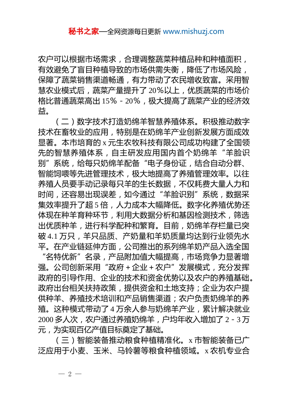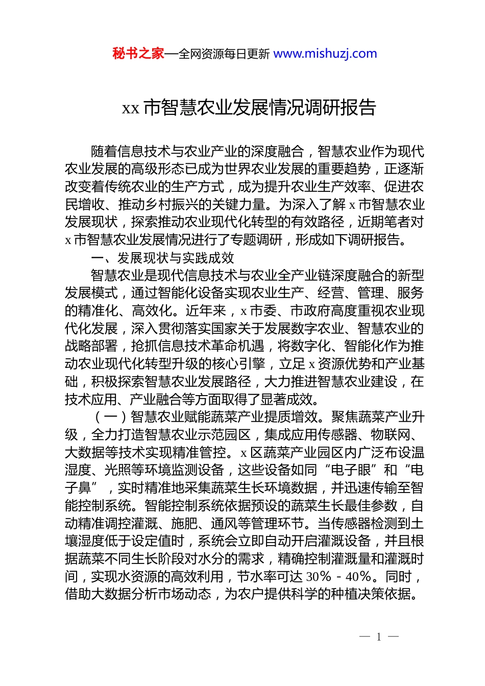 秘书之家—全网资源每日更新 www.mishuzj.comxx 市智慧农业发展情况调研报告随着信息技术与农业产业的深度融合,智慧农业作为现代农业发展的高级形态已成为世界农业发展的重要趋势,正逐渐改变着传统农业的生产方式,成为提升农业生产效率、促进农民增收、推动乡村振兴的关键力量。为深入了解 x 市智慧农业发展现状,探索推动农业现代化转型的有效路径,近期笔者对x 市智慧农业发展情况进行了专题调研,形成如下调研报告。一、发展现状与实践成效智慧农业是现代信息技术与农业全产业链深度融合的新型发展模式,通过智能化设备实现农业生产、经营、管理、服务的精准化、高效化。近年来,x 市委、市政府高度重视农业现代化发展,深入贯彻落实国家关于发展数字农业、智慧农业的战略部署,抢抓信息技术革命机遇,将数字化、智能化作为推动农业现代化转型升级的核心引擎,立足 x 资源优势和产业基础,积极探索智慧农业发展路径,大力推进智慧农业建设,在技术应用、产业融合等方面取得了显著成效。(一)智慧农业赋能蔬菜产业提质增效。聚焦蔬菜产业升级,全力打造智慧农业示范园区,集成应用传感器、物联网、大数据等技术实现精准管控。x 区蔬菜产业园区内广泛布设温湿度、光照等环境监测设备,这些设备如同“电子眼”和“电子鼻”,实时精准地采集蔬菜生长环境数据,并迅速传输至智能控制系统。智能控制系统依据预设的蔬菜生长最佳参数,自动精准调控灌溉、施肥、通风等管理环节。当传感器检测到土壤湿度低于设定值时,系统会立即自动开启灌溉设备,并且根据蔬菜不同生长阶段对水分的需求,精确控制灌溉量和灌溉时间,实现水资源的高效利用,节水率可达 30%-40%。同时,借助大数据分析市场动态,为农户提供科学的种植决策依据。— 1 —秘书之家—全网资源每日更新 www.mishuzj.com农户可以根据市场需求,合理调整蔬菜种植品种和种植面积,有效避免了盲目种植导致的市场供需失衡,降低了市场风险,保障了蔬菜销售渠道畅通,有力带动了农民增收致富。采用智慧农业模式后,蔬菜产量提升了 20%以上,优质蔬菜的市场价格比普通蔬菜高出 15%-20%,极大提高了蔬菜产业的经济效益。(二)数字技术打造奶绵羊智慧养殖体系。积极推动数字技术在畜牧业的应用,特别是在奶绵羊产业创新发展方面成效显著。本市培育的 x 元生农牧科技有限公司成功构建了全国领先的智慧养殖体系,自主研发应用国内首个奶绵羊“羊脸识别”系统,给每只奶绵羊配备“电子身份证,结合自动分群、智能饲喂等先进管理技术,极大地提高了养殖管理效率。以往养殖人员要手动记录每只羊的生长数据,不仅耗费大量人力和时间,还容易出现误差,如今通过“羊脸识别”系统,数据采集效率提升了超 5 倍,人力成本大幅降低。数字化养殖优势还体现在种羊育种环节,利用大数据分析和基因检测技术,筛选出优质种羊,进行科学配种和繁育。目前,奶绵羊存栏量已突破 4.1 万只,羊只品质、产奶量和羊奶质量均达到行业领先水平。在产业链延伸方面,公司推出的系列绵羊奶产品入选全国“名特优新”名录,产品附加值大幅提高,市场竞争力显著增强。公司创新采用“政府+企业+农户”发展模式,充分发挥政府的引导作用、企业的技术和资金优势以及农户的养殖基础。政府出台相关扶持政策,提供资金和土地支持;企业为农户提供种羊、养殖技术培训和产品销售渠道;农户负责奶绵羊的养殖。这种模式带动了 4 万余人参与奶绵羊产业,累计解决就业2000 多人次,农户通过养殖奶绵羊,户均年收入增加了 2-3 万元,为实现百亿产值目标奠定了基础。(三)智能装备推动粮食种植精准化。x 市智能装备已广泛应用于小麦、玉米、马铃薯等粮食种植领域。x 农机专业合— 2 —秘书之家—全网资源每日更新 www.mishuzj.com作社投入 120 台(套)智能化农机,借助北斗导航系统,多台智能播种机进行小麦、玉米、马铃薯单产提升示范田精准播种作业,种子播深、施肥位置、滴灌带铺设等参数通过操作屏实时监控,农机作业轨迹误差控制在 2 厘米内,实现”种肥同播“”一穴一粒“的精量播种,综合机械化率达 95%以上,耕作效率较...