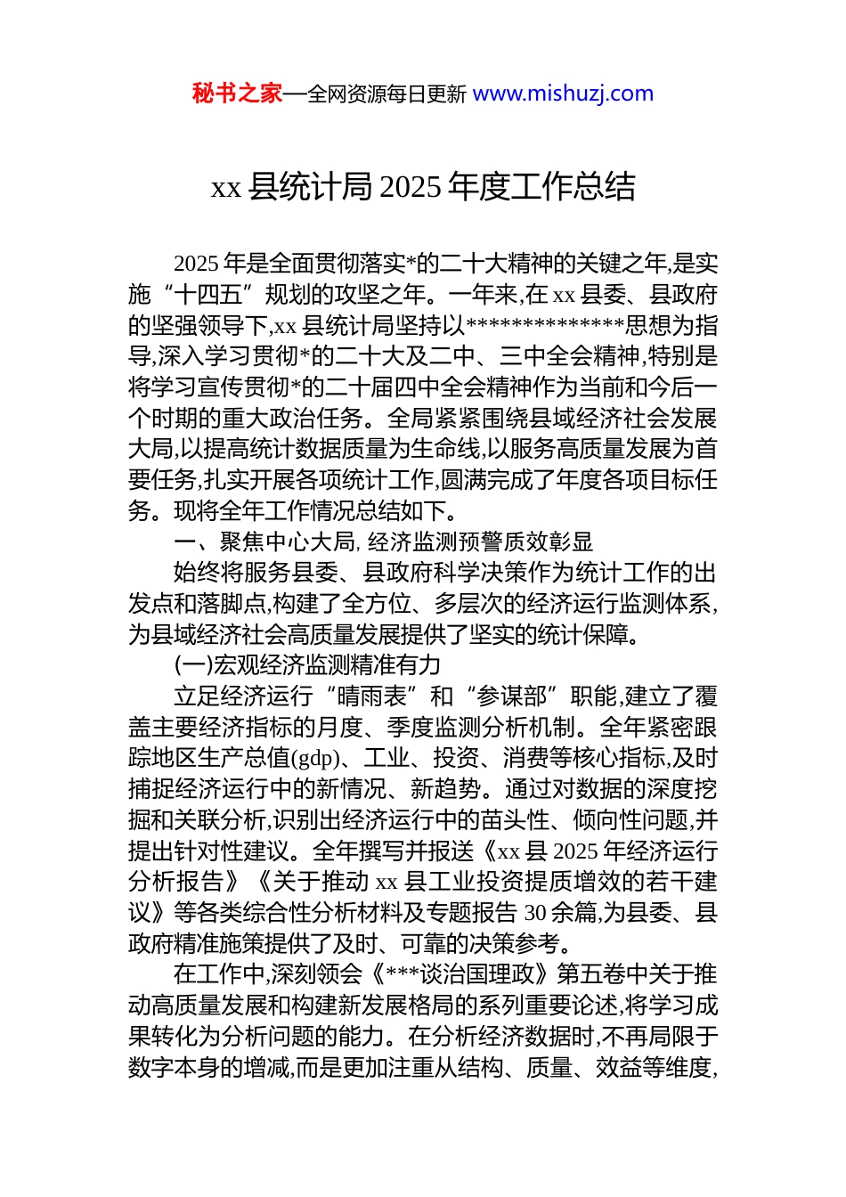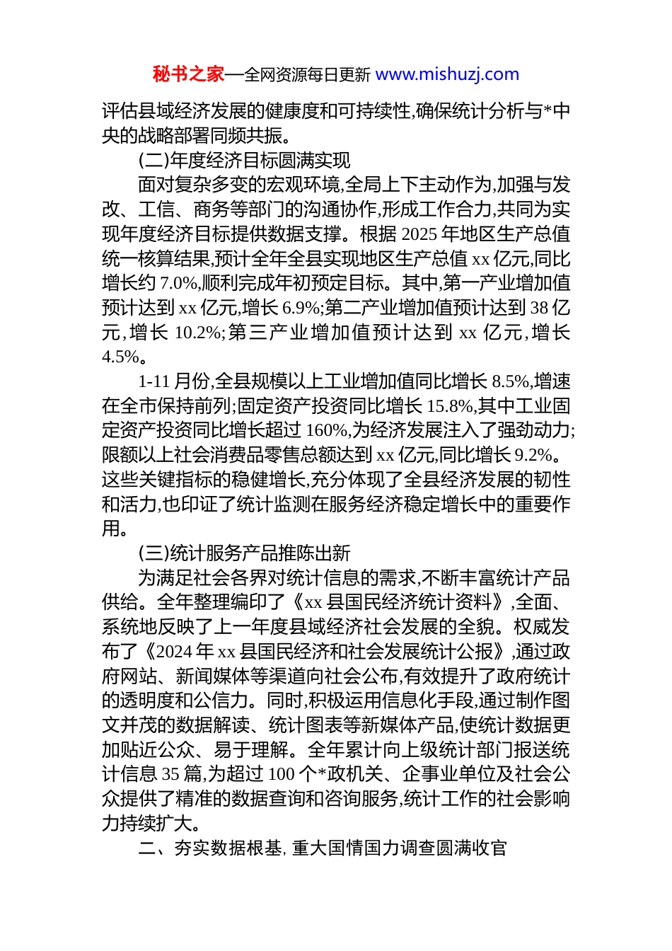 秘书之家—全网资源每日更新 www.mishuzj.comxx 县统计局 2025 年度工作总结2025 年是全面贯彻落实*的二十大精神的关键之年,是实施“十四五”规划的攻坚之年。一年来,在 xx 县委、县政府的坚强领导下,xx 县统计局坚持以**************思想为指导,深入学习贯彻*的二十大及二中、三中全会精神,特别是将学习宣传贯彻*的二十届四中全会精神作为当前和今后一个时期的重大政治任务。全局紧紧围绕县域经济社会发展大局,以提高统计数据质量为生命线,以服务高质量发展为首要任务,扎实开展各项统计工作,圆满完成了年度各项目标任务。现将全年工作情况总结如下。一、聚焦中心大局,经济监测预警质效彰显始终将服务县委、县政府科学决策作为统计工作的出发点和落脚点,构建了全方位、多层次的经济运行监测体系,为县域经济社会高质量发展提供了坚实的统计保障。(一)宏观经济监测精准有力立足经济运行“晴雨表”和“参谋部”职能,建立了覆盖主要经济指标的月度、季度监测分析机制。全年紧密跟踪地区生产总值(gdp)、工业、投资、消费等核心指标,及时捕捉经济运行中的新情况、新趋势。通过对数据的深度挖掘和关联分析,识别出经济运行中的苗头性、倾向性问题,并提出针对性建议。全年撰写并报送《xx 县 2025 年经济运行分析报告》《关于推动 xx 县工业投资提质增效的若干建议》等各类综合性分析材料及专题报告 30 余篇,为县委、县政府精准施策提供了及时、可靠的决策参考。在工作中,深刻领会《***谈治国理政》第五卷中关于推动高质量发展和构建新发展格局的系列重要论述,将学习成果转化为分析问题的能力。在分析经济数据时,不再局限于数字本身的增减,而是更加注重从结构、质量、效益等维度,秘书之家—全网资源每日更新 www.mishuzj.com评估县域经济发展的健康度和可持续性,确保统计分析与*中央的战略部署同频共振。(二)年度经济目标圆满实现面对复杂多变的宏观环境,全局上下主动作为,加强与发改、工信、商务等部门的沟通协作,形成工作合力,共同为实现年度经济目标提供数据支撑。根据 2025 年地区生产总值统一核算结果,预计全年全县实现地区生产总值 xx 亿元,同比增长约 7.0%,顺利完成年初预定目标。其中,第一产业增加值预计达到 xx 亿元,增长 6.9%;第二产业增加值预计达到 38 亿元,增长 10.2%;第三产业增加值预计达到 xx 亿元,增长4.5%。1-11 月份,全县规模以上工业增加值同比增长 8.5%,增速在全市保持前列;固定资产投资同比增长 15.8%,其中工业固定资产投资同比增长超过 160%,为经济发展注入了强劲动力;限额以上社会消费品零售总额达到 xx 亿元,同比增长 9.2%。这些关键指标的稳健增长,充分体现了全县经济发展的韧性和活力,也印证了统计监测在服务经济稳定增长中的重要作用。(三)统计服务产品推陈出新为满足社会各界对统计信息的需求,不断丰富统计产品供给。全年整理编印了《xx 县国民经济统计资料》,全面、系统地反映了上一年度县域经济社会发展的全貌。权威发布了《2024 年 xx 县国民经济和社会发展统计公报》,通过政府网站、新闻媒体等渠道向社会公布,有效提升了政府统计的透明度和公信力。同时,积极运用信息化手段,通过制作图文并茂的数据解读、统计图表等新媒体产品,使统计数据更加贴近公众、易于理解。全年累计向上级统计部门报送统计信息 35 篇,为超过 100 个*政机关、企事业单位及社会公众提供了精准的数据查询和咨询服务,统计工作的社会影响力持续扩大。二、夯实数据根基,重大国情国力调查圆满收官秘书之家—全网资源每日更新 www.mishuzj.com重大国情国力调查是和平时期重要的社会总动员,是摸清家底、服务规划的基础性工作。2025 年,全局集中力量,高标准、高质量地完成了多项重大调查任务。(一)第五次全国经济普查后续工作扎实有效进入 2025 年,第五次全国经济普查工作重心由现场登记转向数据审核、汇总和开发应用。上半年,根据“五经普”的核算结果,对 2023 年的常规年报数据进行了系统性比对分析,并依法依规对历史年度的 gdp 等关键数据进行了修订,确保了历史数据的科学性与可比性。这项工作不仅是对过去经济发展的精准画像,也为“十...