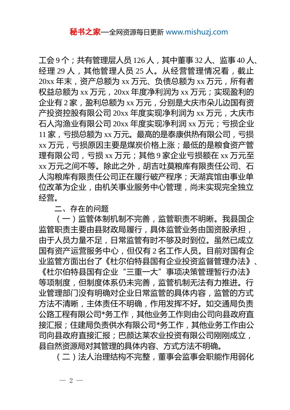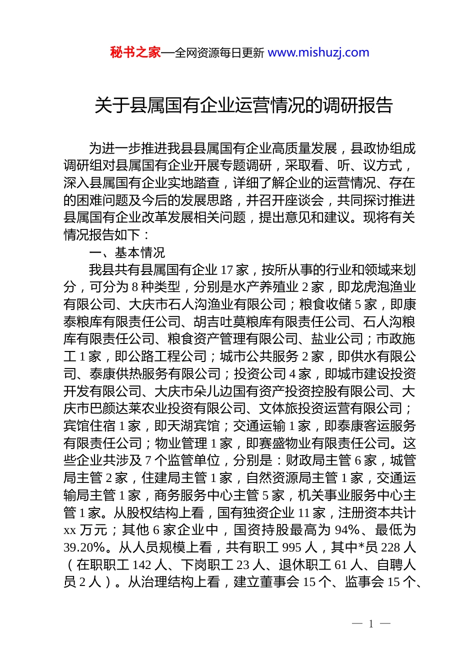 秘书之家—全网资源每日更新 www.mishuzj.com关于县属国有企业运营情况的调研报告为进一步推进我县县属国有企业高质量发展,县政协组成调研组对县属国有企业开展专题调研,采取看、听、议方式,深入县属国有企业实地踏查,详细了解企业的运营情况、存在的困难问题及今后的发展思路,并召开座谈会,共同探讨推进县属国有企业改革发展相关问题,提出意见和建议。现将有关情况报告如下:一、基本情况我县共有县属国有企业 17 家,按所从事的行业和领域来划分,可分为 8 种类型,分别是水产养殖业 2 家,即龙虎泡渔业有限公司、大庆市石人沟渔业有限公司;粮食收储 5 家,即康泰粮库有限责任公司、胡吉吐莫粮库有限责任公司、石人沟粮库有限责任公司、粮食资产管理有限公司、盐业公司;市政施工 1 家,即公路工程公司;城市公共服务 2 家,即供水有限公司、泰康供热服务有限公司;投资公司 4 家,即城市建设投资开发有限公司、大庆市朵儿边国有资产投资控股有限公司、大庆市巴颜达莱农业投资有限公司、文体旅投资运营有限公司;宾馆住宿 1 家,即天湖宾馆;交通运输 1 家,即泰康客运服务有限责任公司;物业管理 1 家,即赛盛物业有限责任公司。这些企业共涉及 7 个监管单位,分别是:财政局主管 6 家,城管局主管 2 家,住建局主管 1 家,自然资源局主管 1 家,交通运输局主管 1 家,商务服务中心主管 5 家,机关事业服务中心主管 1 家。从股权结构上看,国有独资企业 11 家,注册资本共计xx 万元;其他 6 家企业中,国资持股最高为 94%、最低为39.20%。从人员规模上看,共有职工 995 人,其中*员 228 人(在职职工 142 人、下岗职工 23 人、退休职工 61 人、自聘人员 2 人)。从治理结构上看,建立董事会 15 个、监事会 15 个、— 1 —秘书之家—全网资源每日更新 www.mishuzj.com工会 9 个;共有管理层人员 126 人,其中董事 32 人、监事 40 人、经理 29 人,其他管理人员 25 人。从经营管理情况看,截止20xx 年末,资产总额为 xx 万元、负债总额为 xx 万元,所有者权益总额为 xx 万元,20xx 年度净利润为 xx 万元;实现盈利的企业有 2 家,盈利总额为 xx 万元,分别是大庆市朵儿边国有资产投资控股有限公司 20xx 年度实现净利润为 xx 万元,大庆市石人沟渔业有限公司 20xx 年度实现净利润 xx 万元;亏损企业11 家,亏损总额为 xx 万元。最高的是泰康供热有限公司,亏损xx 万元,亏损原因主要是煤炭价格上涨;最低的是粮食资产管理有限公司,亏损 xx 万元;其他 9 家企业亏损额在 xx 万元至xx 万元之间不等。除此之外,胡吉吐莫粮库有限责任公司、石人沟粮库有限责任公司正在履行破产程序;天湖宾馆由事业单位改革为企业,由机关事业服务中心管理,尚未实现完全独立经营。二、存在的问题(一)监管体制机制不完善,监管职责不明晰。我县国企监管职责主要由县财政局履行,具体监管业务由国资股承担,由于人员力量不足,日常监管有时不够及时到位。虽然已成立国有资产运营服务中心,但仅有 2 名工作人员。目前对国有企业监管方面出台了《杜尔伯特县国有企业投资监督管理办法》、《杜尔伯特县国有企业“三重一大”事项决策管理暂行办法》等项制度,但制度体系仍未完善,监管机制无法有力推进。行业管理部门没有明确对企业日常监管的具体内容,监管的方式方法不清晰,主体责任不明确,作用发挥不好。如交通局负责公路工程有限公司*务工作,其他业务工作则由公司向县政府直接汇报;住建局负责供水有限公司*务工作,其他业务工作由公司向县政府直接汇报;巴颜达莱农业投资有限公司刚刚成立,县自然资源局对其管理的具体内容、方式方法不明确。(二)法人治理结构不完整,董事会监事会职能作用弱化— 2 —秘书之家—全网资源每日更新 www.mishuzj.com有 3 家企业都是以“负责人”的形式管理企业,主体身份尚未明确。城市建设投资开发有限公司由李兵负责管理,其工作关系仍保留在泰康供热服务有限公司;供水有限公司转制为国有企业后,未设企业董事会、监事会,按照事...