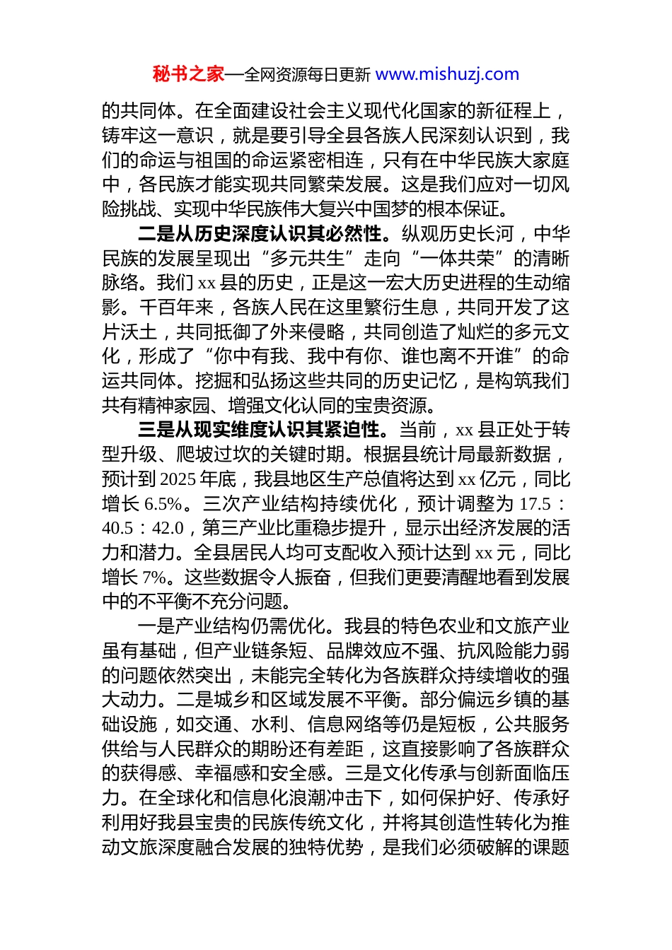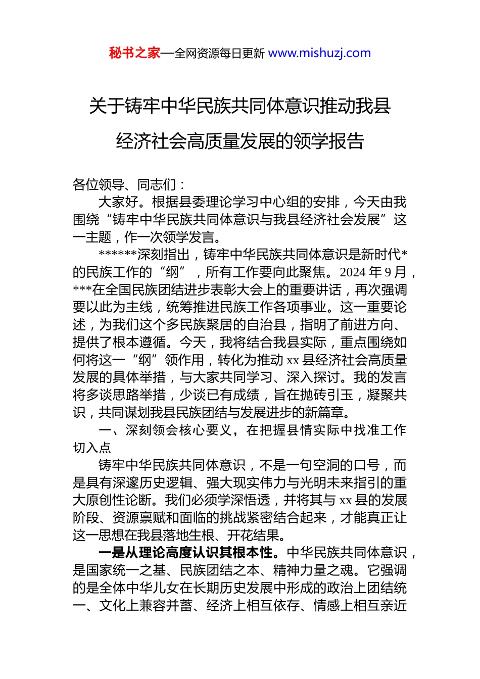 秘书之家—全网资源每日更新 www.mishuzj.com关于铸牢中华民族共同体意识推动我县经济社会高质量发展的领学报告各位领导、同志们:大家好。根据县委理论学习中心组的安排,今天由我围绕“铸牢中华民族共同体意识与我县经济社会发展”这一主题,作一次领学发言。******深刻指出,铸牢中华民族共同体意识是新时代*的民族工作的“纲”,所有工作要向此聚焦。2024 年 9 月,***在全国民族团结进步表彰大会上的重要讲话,再次强调要以此为主线,统筹推进民族工作各项事业。这一重要论述,为我们这个多民族聚居的自治县,指明了前进方向、提供了根本遵循。今天,我将结合我县实际,重点围绕如何将这一“纲”领作用,转化为推动 xx 县经济社会高质量发展的具体举措,与大家共同学习、深入探讨。我的发言将多谈思路举措,少谈已有成绩,旨在抛砖引玉,凝聚共识,共同谋划我县民族团结与发展进步的新篇章。一、深刻领会核心要义,在把握县情实际中找准工作切入点铸牢中华民族共同体意识,不是一句空洞的口号,而是具有深邃历史逻辑、强大现实伟力与光明未来指引的重大原创性论断。我们必须学深悟透,并将其与 xx 县的发展阶段、资源禀赋和面临的挑战紧密结合起来,才能真正让这一思想在我县落地生根、开花结果。一是从理论高度认识其根本性。中华民族共同体意识,是国家统一之基、民族团结之本、精神力量之魂。它强调的是全体中华儿女在长期历史发展中形成的政治上团结统一、文化上兼容并蓄、经济上相互依存、情感上相互亲近秘书之家—全网资源每日更新 www.mishuzj.com的共同体。在全面建设社会主义现代化国家的新征程上,铸牢这一意识,就是要引导全县各族人民深刻认识到,我们的命运与祖国的命运紧密相连,只有在中华民族大家庭中,各民族才能实现共同繁荣发展。这是我们应对一切风险挑战、实现中华民族伟大复兴中国梦的根本保证。二是从历史深度认识其必然性。纵观历史长河,中华民族的发展呈现出“多元共生”走向“一体共荣”的清晰脉络。我们 xx 县的历史,正是这一宏大历史进程的生动缩影。千百年来,各族人民在这里繁衍生息,共同开发了这片沃土,共同抵御了外来侵略,共同创造了灿烂的多元文化,形成了“你中有我、我中有你、谁也离不开谁”的命运共同体。挖掘和弘扬这些共同的历史记忆,是构筑我们共有精神家园、增强文化认同的宝贵资源。三是从现实维度认识其紧迫性。当前,xx 县正处于转型升级、爬坡过坎的关键时期。根据县统计局最新数据,预计到 2025 年底,我县地区生产总值将达到 xx 亿元,同比增长 6.5%。三次产业结构持续优化,预计调整为 17.5:40.5:42.0,第三产业比重稳步提升,显示出经济发展的活力和潜力。全县居民人均可支配收入预计达到 xx 元,同比增长 7%。这些数据令人振奋,但我们更要清醒地看到发展中的不平衡不充分问题。一是产业结构仍需优化。我县的特色农业和文旅产业虽有基础,但产业链条短、品牌效应不强、抗风险能力弱的问题依然突出,未能完全转化为各族群众持续增收的强大动力。二是城乡和区域发展不平衡。部分偏远乡镇的基础设施,如交通、水利、信息网络等仍是短板,公共服务供给与人民群众的期盼还有差距,这直接影响了各族群众的获得感、幸福感和安全感。三是文化传承与创新面临压力。在全球化和信息化浪潮冲击下,如何保护好、传承好利用好我县宝贵的民族传统文化,并将其创造性转化为推动文旅深度融合发展的独特优势,是我们必须破解的课题秘书之家—全网资源每日更新 www.mishuzj.com四是从挑战角度认识其艰巨性。我们必须正视,在铸牢中华民族共同体意识、推动高质量发展的道路上,依然面临诸多挑战。四是防范化解风险隐患的任务依然艰巨。意识形态领域的斗争复杂尖锐,境外敌对势力利用民族、**问题进行渗透破坏的风险始终存在,维护社会和谐稳定的任务不容丝毫懈怠。这些问题,既是发展的难题,也是影响民族团结的潜在风险点。因此,将铸牢中华民族共同体意识与解决这些实际问题结合起来,既是政治任务,更是现实需要。二、聚焦关键领域,以务实举措推动工作落地见效推动铸牢中华民族共同体意识走深走实,必须摒弃...
