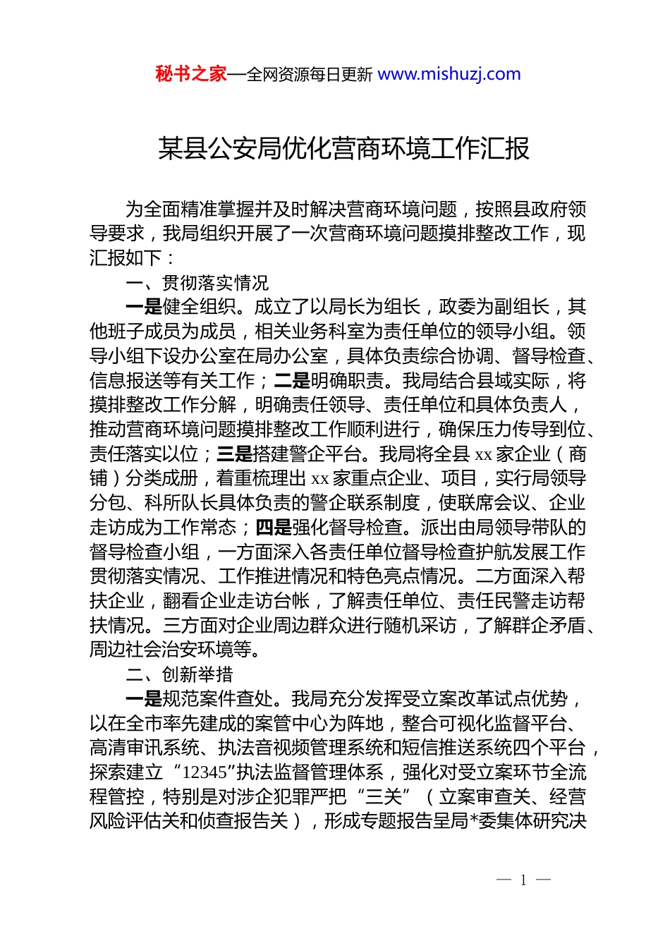 秘书之家—全网资源每日更新 www.mishuzj.com某县公安局优化营商环境工作汇报为全面精准掌握并及时解决营商环境问题,按照县政府领导要求,我局组织开展了一次营商环境问题摸排整改工作,现汇报如下:一、贯彻落实情况一是健全组织。成立了以局长为组长,政委为副组长,其他班子成员为成员,相关业务科室为责任单位的领导小组。领导小组下设办公室在局办公室,具体负责综合协调、督导检查、信息报送等有关工作;二是明确职责。我局结合县域实际,将摸排整改工作分解,明确责任领导、责任单位和具体负责人,推动营商环境问题摸排整改工作顺利进行,确保压力传导到位、责任落实以位;三是搭建警企平台。我局将全县 xx 家企业(商铺)分类成册,着重梳理出 xx 家重点企业、项目,实行局领导分包、科所队长具体负责的警企联系制度,使联席会议、企业走访成为工作常态;四是强化督导检查。派出由局领导带队的督导检查小组,一方面深入各责任单位督导检查护航发展工作贯彻落实情况、工作推进情况和特色亮点情况。二方面深入帮扶企业,翻看企业走访台帐,了解责任单位、责任民警走访帮扶情况。三方面对企业周边群众进行随机采访,了解群企矛盾、周边社会治安环境等。二、创新举措一是规范案件查处。我局充分发挥受立案改革试点优势,以在全市率先建成的案管中心为阵地,整合可视化监督平台、高清审讯系统、执法音视频管理系统和短信推送系统四个平台,探索建立“12345”执法监督管理体系,强化对受立案环节全流程管控,特别是对涉企犯罪严把“三关”(立案审查关、经营风险评估关和侦查报告关),形成专题报告呈局*委集体研究决— 1 —秘书之家—全网资源每日更新 www.mishuzj.com议,使案件查处更加规范,违法犯罪打击更加精准,护航发展更加稳健。二是拓展便捷服务。我局在集中办事服务中心建立了户政和出入境微信服务平台,企业人员和群众通过扫描二维码即知需备材料和手续,出入境成功开通自助受理出国(境)证件服务终端,提升了我局出入境管理信息化水平。此外,户政、出入境和辖区派出所将服务阵地前延,充分利用微信、微信等媒介与相关企业互动,在线提供业务指导、接受求助、业务预约等服务。对企业用工暂住人员上门集中办理,最大程度消除对企业日常经营的影响。并在集中办事服务中心和各辖区派出所均公布了非工作时间办理紧急事项的联系方式,及时办理企业急需事项。三是打击涉企犯罪。我局充分发挥群防群治作用,由辖区派出所牵头,组织工业园区安保力量和各村治保力量展开巡控工作,先后抓获多名盗窃企业物资犯罪嫌疑人、查处一批扰乱企业正常经营案件。我局严把“三关”,对涉企犯罪一案一议、全程掌控,实现了社会效果、企业效果、侦办效果和维稳效果四个统一。四是优化企业环境。在网格化排查中,我局将县域企业纳入网格,全部录入自主研发的“网格管理信息平台”,全面采集企业相关信息,并围绕企业存在的消防隐患、安全隐患、工薪矛盾和治安问题等召开联席会议妥善解决。辖区派出所多次联合园区消防队在相关企业开展灭火救援演练,有效提升协同作战能力、快速反应能力和灭火救援能力。并与工业园区管委会组成联合驻村工作组,进驻园区内派性严重的重点村开展治安整治、信访稳维、基层*组织建设等工作。对重点村扰乱园区办公秩序人员依法严厉打击。三、存在的问题一是严打高压态势与当前治安形势还不匹配。虽然开展一— 2 —秘书之家—全网资源每日更新 www.mishuzj.com系列严打整治行动和安保活动,但立案数同比下降幅度有限,破案数(特别是现案破案数)同比上升幅度不高。这固然有警力缺乏、经费紧张和整个社会治安大环境影响等因素,但最主要的还是精神状态不够好、注意力不够集中、新技法新战法钻研少、过于依赖技侦手段等,这是我们下步要重点研究解决的问题。二是应对处置力量与社会维稳压力还不匹配。迫于当前经济压力和多重矛盾叠加的现状,我县社会维稳和信访化解压力很大。但公安机关在警力、经费和优抚上存在问题。随着公安改革的落实落地,同工不同酬的落差感,付出与回报不成正比的失落感越来越大,通过正规渠道招录但未录警人员的心理波动带来...
