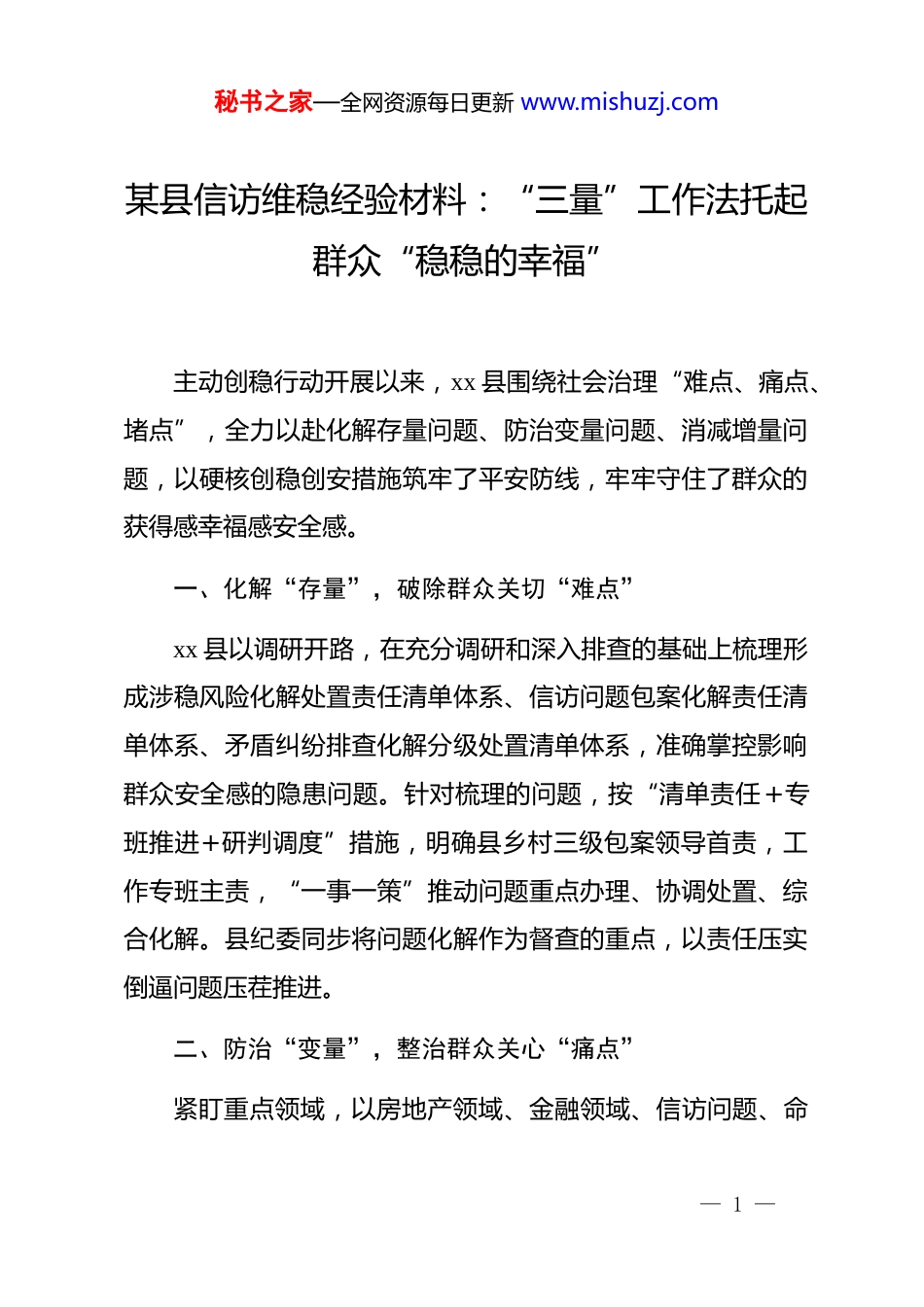 秘书之家—全网资源每日更新 www.mishuzj.com某县信访维稳经验材料:“三量”工作法托起群众“稳稳的幸福”主动创稳行动开展以来,xx 县围绕社会治理“难点、痛点、堵点”,全力以赴化解存量问题、防治变量问题、消减增量问题,以硬核创稳创安措施筑牢了平安防线,牢牢守住了群众的获得感幸福感安全感。一、化解“存量”,破除群众关切“难点”xx 县以调研开路,在充分调研和深入排查的基础上梳理形成涉稳风险化解处置责任清单体系、信访问题包案化解责任清单体系、矛盾纠纷排查化解分级处置清单体系,准确掌控影响群众安全感的隐患问题。针对梳理的问题,按“清单责任+专班推进+研判调度”措施,明确县乡村三级包案领导首责,工作专班主责,“一事一策”推动问题重点办理、协调处置、综合化解。县纪委同步将问题化解作为督查的重点,以责任压实倒逼问题压茬推进。二、防治“变量”,整治群众关心“痛点”紧盯重点领域,以房地产领域、金融领域、信访问题、命— 1 —秘书之家—全网资源每日更新 www.mishuzj.com案防范治理“四场”主动创稳攻坚战为切入点和突破口,全面开展影响群众安全感和幸福感隐患问题治理。住建、财政、信访等部门深入推进行业问题联合整治、综合整治、源头整治。公安、应急管理、市场监管等部门主动出击,严把治安综合治理关口,排查整改道路、交通、消防、市场安全隐患 176 个,破获“黄赌毒”“食药环”“盗抢骗”、电信网络诈骗、养老诈骗等违法犯罪 238 起,成功阻止 28 名群众网上支付,止损 41万元。政法部门组织 40 名领导干部和政法干警进企业、进车间,纾解困难问题,开展“法治体检”,有效防止问题演变激化,造成损失和诱发风险。三、消减“增量”,打通群众关注“堵点”确立“综治中心+网格化+信息化”治理思路,组织 113 名网格员进“网”入“格”熟悉人、地、事、物、情,扎实开展治安、矛盾、防火、防汛等问题全面排查和重点事项“吹哨”办理,创新县乡村综治中心“七步工作法”、司法所“六心工作法”等经验做法,进一步丰富综治中心矛盾联调、问题联治形式,推动“群众身边事”化解在萌芽状态。推行“开门接访、进门约访、登门走访、上门回访”四访制度,安排县乡主要接访,重点案件走访、干部登门排访,将信访工作延伸到“群众— 2 —秘书之家—全网资源每日更新 www.mishuzj.com家门口”。打通政务、警务、网络诉求收集、办理、反馈渠道,在线联通“12345”和“110”,积极推广 xx 网格 app 和“xx 随手拍”小程序“指尖上”运用,全面推动群众诉求直诉直办、即诉即办,前端化解,源头处置了一大批矛盾问题,有力维护了全县社会大局持续安全稳定。— 3 —