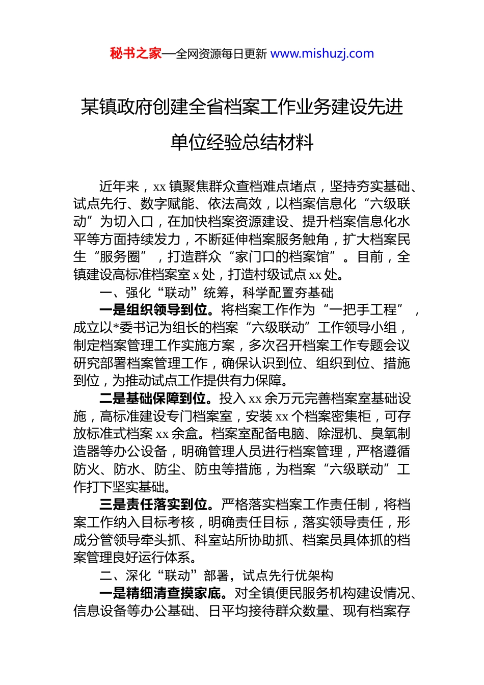 秘书之家—全网资源每日更新 www.mishuzj.com某镇政府创建全省档案工作业务建设先进单位经验总结材料近年来,xx 镇聚焦群众查档难点堵点,坚持夯实基础、试点先行、数字赋能、依法高效,以档案信息化“六级联动”为切入口,在加快档案资源建设、提升档案信息化水平等方面持续发力,不断延伸档案服务触角,扩大档案民生“服务圈”,打造群众“家门口的档案馆”。目前,全镇建设高标准档案室 x 处,打造村级试点 xx 处。一、强化“联动”统筹,科学配置夯基础一是组织领导到位。将档案工作作为“一把手工程”,成立以*委书记为组长的档案“六级联动”工作领导小组,制定档案管理工作实施方案,多次召开档案工作专题会议研究部署档案管理工作,确保认识到位、组织到位、措施到位,为推动试点工作提供有力保障。二是基础保障到位。投入 xx 余万元完善档案室基础设施,高标准建设专门档案室,安装 xx 个档案密集柜,可存放标准式档案 xx 余盒。档案室配备电脑、除湿机、臭氧制造器等办公设备,明确管理人员进行档案管理,严格遵循防火、防水、防尘、防虫等措施,为档案“六级联动”工作打下坚实基础。三是责任落实到位。严格落实档案工作责任制,将档案工作纳入目标考核,明确责任目标,落实领导责任,形成分管领导牵头抓、科室站所协助抓、档案员具体抓的档案管理良好运行体系。二、深化“联动”部署,试点先行优架构一是精细清查摸家底。对全镇便民服务机构建设情况、信息设备等办公基础、日平均接待群众数量、现有档案存秘书之家—全网资源每日更新 www.mishuzj.com放情况等开展充分调研,建立工作台账,全面掌握全镇村档案现状。同时,按照《档案工作办法》“应收尽收、应归尽归”的原则,扎实做好档案资料收集、归档、使用、保管等环节。目前,全镇共整理收录各门类档案 xx 卷件,达到了收集齐全、整理规范的要求。二是健全机构聚合力。完善由分管领导、部门负责人和岗位业务人员组成的档案管理体系,严格落实“三合一”制度,结合工作实际,科学划分档案门类,明确归档范围和保管期限,对收集的各类档案分门别类进行综合管理,确保档案完整准确归档,着力建设统一领导、统一管理、统一制度的高效档案管理机构。三是试点先行快推进。在充分调研、全面征求意见建议的基础上,确定 xx 个镇直单位、xx 个村为试点单位,更新配备政治素质高、原则性强、服务意识强的镇村专兼职档案管理员 xx 人,制定试点工作方案,明确建设标准和完成时限,健全镇、村齐抓共管、紧密协作的档案工作网络架构,细化职责、有序配合、协调推进,着力打造试点工作 xx 模式。三、细化“联动”流程,科学管档提水平一是健全档案管理制度。进一步健全和规范档案工作人员岗位职责、档案**、档案查阅、借阅登记、档案鉴定销毁等制度,确保档案管理和利用制度化、标准化和规范化。二是强化档案数字赋能。做好纸质档案整理、归档,加快对室存档案的数字化进程,借助县档案馆馆室一体化系统,加快实现“纸质档案+数字档案”线上线下的同步归档、同步更新。同时,充分发挥档案查阅利用平台,以数字化、网络化打破时空壁垒束缚,为群众提供更加优质便捷的服务。三是优化档案查阅流程。认真梳理优化从受理申请,到查找档案、传输资料的全部流程,形成工作人员操作指秘书之家—全网资源每日更新 www.mishuzj.com南,将准备工作做深、做实、做细,为群众提供更加到位的申请指导、更加暖心的查档体验。四、优化“联动”宣传,提升效能强服务一是细化宣传,提高知晓率。制作山东省档案查询利用平台使用手册、明白纸、“六级联动”查档标识牌,并在政务集中服务场所、便民服务机构等投放。引导各村充分利用微信群、广播等渠道宣传推广。每年国际档案日期间通过悬挂条幅、发放宣传资料、设立咨询台等方式开展集中宣传,努力营造人人关心档案工作、人人参与档案工作的良好氛围。二是深化培训,提高规范率。组织专兼职档案员认真学习《中华人民共和国档案法》等法律法规,邀请专业人士进行授课,组成专门的技术指导小组,深入村进行一对一指导,按照“特色引导、分类施策”的方针,有力提升档案工作人员...