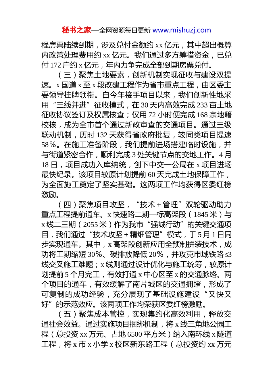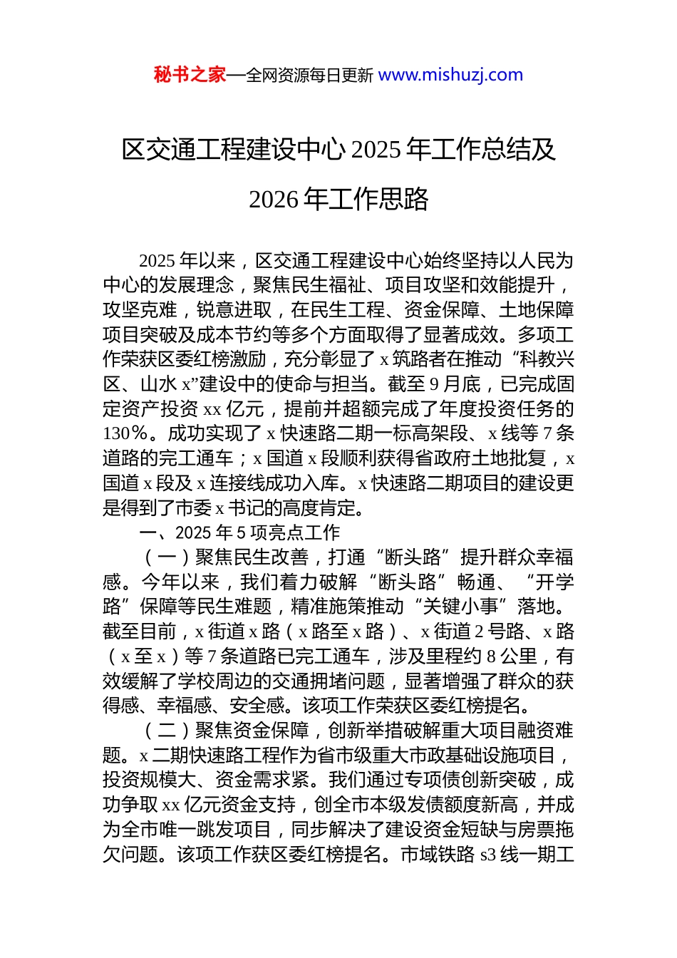 秘书之家—全网资源每日更新 www.mishuzj.com区交通工程建设中心 2025 年工作总结及2026 年工作思路2025 年以来,区交通工程建设中心始终坚持以人民为中心的发展理念,聚焦民生福祉、项目攻坚和效能提升,攻坚克难,锐意进取,在民生工程、资金保障、土地保障项目突破及成本节约等多个方面取得了显著成效。多项工作荣获区委红榜激励,充分彰显了 x 筑路者在推动“科教兴区、山水 x”建设中的使命与担当。截至 9 月底,已完成固定资产投资 xx 亿元,提前并超额完成了年度投资任务的130%。成功实现了 x 快速路二期一标高架段、x 线等 7 条道路的完工通车;x 国道 x 段顺利获得省政府土地批复,x国道 x 段及 x 连接线成功入库。x 快速路二期项目的建设更是得到了市委 x 书记的高度肯定。一、2025 年 5 项亮点工作(一)聚焦民生改善,打通“断头路”提升群众幸福感。今年以来,我们着力破解“断头路”畅通、“开学路”保障等民生难题,精准施策推动“关键小事”落地。截至目前,x 街道 x 路(x 路至 x 路)、x 街道 2 号路、x 路(x 至 x)等 7 条道路已完工通车,涉及里程约 8 公里,有效缓解了学校周边的交通拥堵问题,显著增强了群众的获得感、幸福感、安全感。该项工作荣获区委红榜提名。(二)聚焦资金保障,创新举措破解重大项目融资难题。x 二期快速路工程作为省市级重大市政基础设施项目,投资规模大、资金需求紧。我们通过专项债创新突破,成功争取 xx 亿元资金支持,创全市本级发债额度新高,并成为全市唯一跳发项目,同步解决了建设资金短缺与房票拖欠问题。该项工作获区委红榜提名。市域铁路 s3 线一期工秘书之家—全网资源每日更新 www.mishuzj.com程房票陆续到期,涉及兑付金额约 xx 亿元,其中超出概算内政策处理费用约 xx 亿元。我们通过多方筹措资金,已兑付 172 户约 x 亿元,年内力争完成全部到期房票兑付。(三)聚焦土地要素,创新机制实现征收与建设双提速。x 国道 x 至 x 段改建工程作为省市重点工程,由区委主要领导挂牌领衔。自今年接手项目以来,我们创新性地采用“三线并进”征收模式,在 30 天内高效完成 233 亩土地征收协议签订及权属核查;仅用 72 小时便完成 168 宗地籍校核,成为全市首个通过新政审查的交通项目。通过三级联动机制,历时 132 天获得省政府批复,较同类项目提速58%。在施工准备阶段,我们提前进场搭建临时设施,并与街道紧密合作,顺利完成 3 处关键节点的交地工作。4 月18 日,项目成功入库纳统,创下中交一公局在 x 项目进场最快纪录。该项目较原计划提前 60 天完成土地保障工作,为全面施工奠定了坚实基础。这两项工作均获得区委红榜激励。(四)聚焦项目攻坚,“技术+管理”双轮驱动助力重点工程提前通车。x 快速路二期一标高架段(1845 米)与x 线二三期(2055 米)作为我市“强城行动”的关键交通项目,我们通过“技术攻坚+精细管理”模式,于 5 月 1 日同步实现通车。其中,x 高架段创新应用全预制拼装技术,成功将工期缩短 30%、碳排放降低 20%,并攻克市域铁路 s3线交叉施工难题;x 线则通过设计优化与施工统筹,较原计划提前 5 个月完工,有效打通 x 中心区至 x 的交通脉络。两个项目的通车,有效缓解了南片城区的交通拥堵,形成了可复制的成功经验,充分展现了基础设施建设“又快又好”的示范效应。该两项工作均荣获区委红榜激励。(五)聚焦成本管控,实现集约化高效利用,释放交通社会效益。通过实施项目捆绑机制,将 x 线三角地公园工程(总投资 xx 万元、占地 6500 平方米)纳入南环线 x 隧道工程,将 x 市 x 小学 x 校区新东路工程(总投资约 xx 万元秘书之家—全网资源每日更新 www.mishuzj.com占地 1755 平方米)纳入霞北路工程,从而减少项目立项、初设、招标等流程,有效缩短前期工作时间。同时,采用以大带小模式优化资金配置,通过共享施工资源、优化采购渠道、统筹施工工序,实现资金集约化使用,加速民生项目落地。针对南环线 x 隧道两侧连接线工程进度滞后的情况,担当...