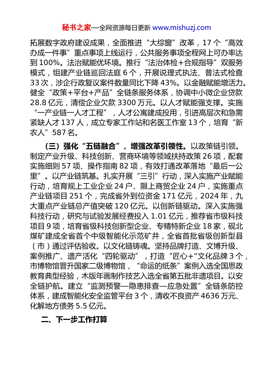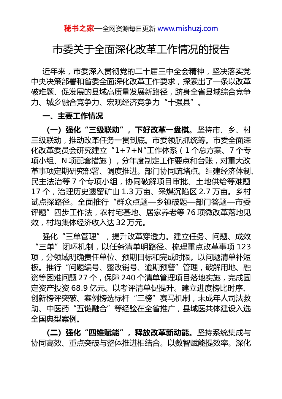 秘书之家—全网资源每日更新 www.mishuzj.com市委关于全面深化改革工作情况的报告近年来,市委深入贯彻党的二十届三中全会精神,坚决落实党中央决策部署和省委全面深化改革工作要求,探索出了一条以改革破难题、促发展的县域高质量发展新路径,跻身全省县域综合竞争力、城乡融合竞争力、宏观经济竞争力“十强县”。一、主要工作情况(一)强化“三级联动”,下好改革一盘棋。坚持市、乡、村三级联动,推动改革任务一贯到底。市委领航抓统筹。市委全面深化改革委员会研究建立“1+7+N”工作体系(1 个总方案、7 个专项小组、N 项配套措施),分年度制定工作要点和台账,对重大改革事项定期研究部署、调度推进。部门协同疏堵点。组建经济体制、民主法治等 7 个专项小组,协同破解项目审批、土地供给等难题17 个,治理历史遗留矿山 1.3 万亩、采煤沉陷区 2.7 万亩。乡村试点探路径。全面推行“群众点题—乡镇破题—部门答题—市委评题”四步工作法,农村宅基地、居家养老等 76 项微改革落地见效,村均集体经济收入达 32 万元。强化“三单管理”,提升改革穿透力。建立任务、问题、成效“三单”闭环机制,以任务清单明路径。梳理重点改革事项 123项,分领域明确责任单位、预期目标和完成时限。以问题清单补短板。推行“问题编号、整改销号、逾期预警”管理,破解用地、融资等困难问题 27 个,保障 240 个清单管理项目落地实施,完成固定资产投资 68.9 亿元。以考评清单促提升。建立进度榜比时序、创新榜评突破、案例榜选标杆“三榜”赛马机制,未成年人司法救助、中医药“五链融合”等经验在全省推广,县域医共体建设入选全国典型案例。(二)强化“四维赋能”,释放改革新动能。坚持系统集成与协同高效、重点突破与整体推进相结合。以数智赋能提效率。深化秘书之家—全网资源每日更新 www.mishuzj.com拓展数字政府建设成果,全面推进“大综窗”改革,17 个“高效办成一件事”重点事项上线运行,公共服务事项全程网上可办率达到 100%。法治赋能优环境。推行“法治体检+合规指导”双服务模式,组建产业链巡回法庭 6 个,开展说理式执法、普法式检查33 次,涉企行政复议案件数量同比下降 43%。以金融赋能增活力。健全“政策+平台+产品”全链条服务体系,协调中小微企业贷款28.8 亿元,清偿企业欠款 3300 万元。以人才赋能强支撑。实施“一产业链一人才工程”,人才公寓建成投用,引进高层次和急需紧缺人才 137 人,成立专家工作站和名医工作室 13 个,培育“新农人”587 名。(三)强化“五链融合”,增强改革引领性。以政策链引领。制定产业升级、科技创新、营商环境等领域扶持政策 26 项,配套实施细则 57 项、操作指南 82 项,有效打通改革落地“最后一公里”。以产业链筑基。扎实开展“三引”行动,深入实施产业赋能行动,培育规上工业企业 24 户、限上商贸企业 24 户,实施重点产业链项目 251 个,完成省外到位资金 171 亿元,2024 年,九大重点产业链总产值突破 120 亿元。以创新链驱动。深入实施强科技行动,研究与试验发展经费投入 1.01 亿元,推荐省市级科技项目 9 项,培育省级科技创新型企业、专精特新企业 18 家,砚北煤矿建成全省首个中级智能化示范矿井,全省首批省级创新型县(市)通过评估验收。以文化链铸魂。坚持品牌打造、文博升级、案例推广、遗产活化“四轮驱动”,打造“匠心+”文化品牌 3 个,市博物馆晋升国家二级博物馆,“命运的纸条”案例入选全国思政教育典型经验,木版年画制作技艺入选全省第五批非遗项目。以安全链护航。建立“监测预警—隐患排查—应急处置”全链条防控体系,建成智能化安全监管平台 3 个,清收不良资产 4636 万元、化解地方债务 5.5 亿元。二、下一步工作打算秘书之家—全网资源每日更新 www.mishuzj.com下一步,市委将紧紧紧围绕省委重大战略部署,立足“工业主导型”和“城市服务型”功能定位,锚定建成煤电化产业发展高地、旅游康养福地、城乡现代化融合发展示范市“两地一市”,打造“全省工业样板市”奋斗目标,发挥进一步全面深化改革的破局引领作用,不断...