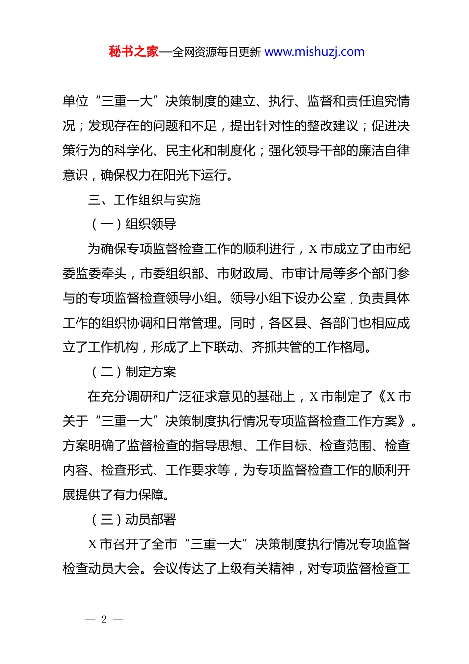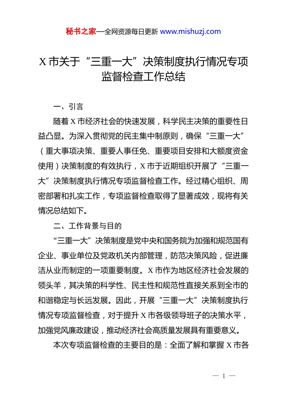 秘书之家—全网资源每日更新 www.mishuzj.comX 市关于“三重一大”决策制度执行情况专项监督检查工作总结一、引言随着 X 市经济社会的快速发展,科学民主决策的重要性日益凸显。为深入贯彻党的民主集中制原则,确保“三重一大”(重大事项决策、重要人事任免、重要项目安排和大额度资金使用)决策制度的有效执行,X 市于近期组织开展了“三重一大”决策制度执行情况专项监督检查工作。经过精心组织、周密部署和扎实工作,专项监督检查取得了显著成效,现将有关情况总结如下。二、工作背景与目的“三重一大”决策制度是党中央和国务院为加强和规范国有企业、事业单位及党政机关内部管理,防范决策风险,促进廉洁从业而制定的一项重要制度。X 市作为地区经济社会发展的领头羊,其决策的科学性、民主性和规范性直接关系到全市的和谐稳定与长远发展。因此,开展“三重一大”决策制度执行情况专项监督检查,对于提升 X 市各级领导班子的决策水平,加强党风廉政建设,推动经济社会高质量发展具有重要意义。本次专项监督检查的主要目的是:全面了解和掌握 X 市各— 1 —秘书之家—全网资源每日更新 www.mishuzj.com单位“三重一大”决策制度的建立、执行、监督和责任追究情况;发现存在的问题和不足,提出针对性的整改建议;促进决策行为的科学化、民主化和制度化;强化领导干部的廉洁自律意识,确保权力在阳光下运行。三、工作组织与实施(一)组织领导为确保专项监督检查工作的顺利进行,X 市成立了由市纪委监委牵头,市委组织部、市财政局、市审计局等多个部门参与的专项监督检查领导小组。领导小组下设办公室,负责具体工作的组织协调和日常管理。同时,各区县、各部门也相应成立了工作机构,形成了上下联动、齐抓共管的工作格局。(二)制定方案在充分调研和广泛征求意见的基础上,X 市制定了《X 市关于“三重一大”决策制度执行情况专项监督检查工作方案》。方案明确了监督检查的指导思想、工作目标、检查范围、检查内容、检查形式、工作要求等,为专项监督检查工作的顺利开展提供了有力保障。(三)动员部署X 市召开了全市“三重一大”决策制度执行情况专项监督检查动员大会。会议传达了上级有关精神,对专项监督检查工— 2 —秘书之家—全网资源每日更新 www.mishuzj.com作进行了全面部署和动员。要求各级各部门要高度重视,加强领导,精心组织,确保专项监督检查工作取得实效。(四)自查自纠各区县、各部门按照工作方案的要求,认真开展了自查自纠工作。通过查阅资料、召开座谈会、问卷调查等方式,对本单位“三重一大”决策制度的建立和执行情况进行了全面梳理和排查。针对发现的问题和不足,制定了具体的整改措施和计划。(五)现场检查专项监督检查领导小组办公室组织专业检查组,对各区县各部门的自查自纠情况进行了现场检查。检查组通过听取汇报、查阅资料、实地查看、个别谈话等方式,深入了解了各单位“三重一大”决策制度的执行情况。同时,对自查自纠中发现的问题进行了重点核查和督促整改。四、主要成效与经验(一)主要成效制度建设更加完善。通过专项监督检查,X 市各级各部门进一步健全和完善了“三重一大”决策制度及其配套措施。明确了决策范围、决策程序、决策执行、决策监督等关键环节的具体要求,为科学民主决策提供了制度保障。— 3 —秘书之家—全网资源每日更新 www.mishuzj.com决策行为更加规范。各单位在决策过程中更加注重民主集中制的贯彻落实,充分听取各方意见,广泛凝聚共识。决策程序更加规范透明,决策结果更加科学合理。有效避免了个人独断专行和决策失误现象的发生。监督力度明显加强。各级纪检监察机关和相关部门切实履行监督职责,加强对“三重一大”决策过程的监督检查。通过建立健全监督机制、完善监督手段、强化监督问责等措施,有效提升了监督的针对性和实效性。整改成效显著。针对专项监督检查中发现的问题和不足,各单位认真制定整改措施和计划,并逐一落实整改责任。通过加强内部管理、完善制度建设、强化教育培训等措施,有效解决了存在的问题和隐患。(二)经验做法强化组织领导。X 市在专项监督检查工作...