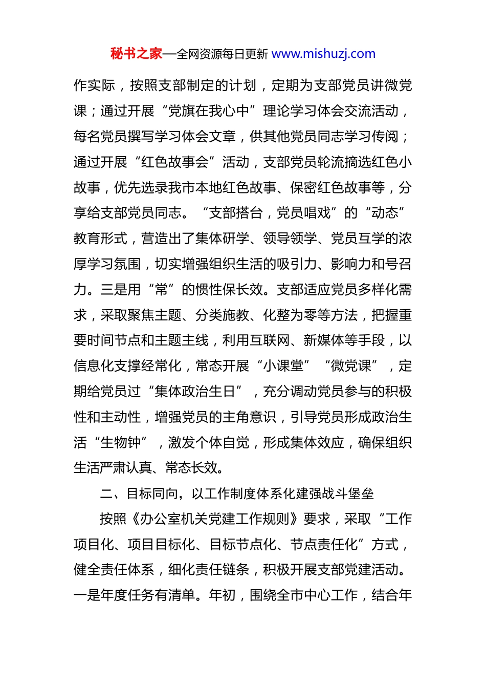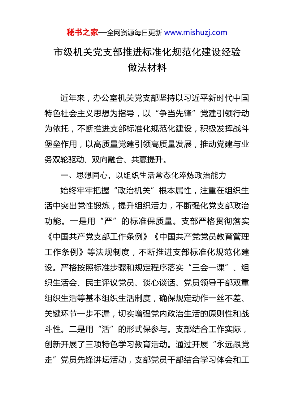 秘书之家—全网资源每日更新 www.mishuzj.com市级机关党支部推进标准化规范化建设经验做法材料 近年来,办公室机关党支部坚持以习近平新时代中国特色社会主义思想为指导,以“争当先锋”党建引领行动为依托,不断推进支部标准化规范化建设,积极发挥战斗堡垒作用,以高质量党建引领高质量发展,推动党建与业务双轮驱动、双向融合、共赢提升。一、思想同心,以组织生活常态化淬炼政治能力始终牢牢把握“政治机关”根本属性,注重在组织生活中突出党性锻炼,提升组织活力,不断强化党支部政治功能。一是用“严”的标准保质量。支部严格贯彻落实《中国共产党支部工作条例》《中国共产党党员教育管理工作条例》等法规制度,不断推进支部标准化规范化建设。严格按照标准步骤和规定程序落实“三会一课”、组织生活会、民主评议党员、谈心谈话、党员领导干部双重组织生活等基本组织生活制度,确保规定动作一丝不差、关键环节一步不漏,切实增强党内政治生活的原则性和战斗性。二是用“活”的形式保参与。支部结合工作实际,创新开展了三项特色学习教育活动。通过开展“永远跟党走”党员先锋讲坛活动,支部党员干部结合学习体会和工秘书之家—全网资源每日更新 www.mishuzj.com作实际,按照支部制定的计划,定期为支部党员讲微党课;通过开展“党旗在我心中”理论学习体会交流活动,每名党员撰写学习体会文章,供其他党员同志学习传阅;通过开展“红色故事会”活动,支部党员轮流摘选红色小故事,优先选录我市本地红色故事、保密红色故事等,分享给支部党员同志。“支部搭台,党员唱戏”的“动态”教育形式,营造出了集体研学、领导领学、党员互学的浓厚学习氛围,切实增强组织生活的吸引力、影响力和号召力。三是用“常”的惯性保长效。支部适应党员多样化需求,采取聚焦主题、分类施教、化整为零等方法,把握重要时间节点和主题主线,利用互联网、新媒体等手段,以信息化支撑经常化,常态开展“小课堂”“微党课”,定期给党员过“集体政治生日”,充分调动党员参与的积极性和主动性,增强党员的主角意识,引导党员形成政治生活“生物钟”,激发个体自觉,形成集体效应,确保组织生活严肃认真、常态长效。二、目标同向,以工作制度体系化建强战斗堡垒按照《办公室机关党建工作规则》要求,采取“工作项目化、项目目标化、目标节点化、节点责任化”方式,健全责任体系,细化责任链条,积极开展支部党建活动。一是年度任务有清单。年初,围绕全市中心工作,结合年秘书之家—全网资源每日更新 www.mishuzj.com度党建工作要点、年度学习教育安排,将全年工作进行任务分解,将抓党建工作需要履行的班子建设、组织覆盖、学习教育等职责以项目化形式进行细化、量化、具体化,制度工作和学习计划,逐项明确任务、夯实责任、确定时限、强化措施,制定“支部年度党建任务清单”,实施挂图作战。二是工作纪实更规范。工作纪实是对支部开展工作细化、规范、刚性的操作指南,有利于总结梳理、督查整改,提高工作的严肃性和实效性。支部根据实际情况,灵活选取“线上+线下”方式开展日常纪实管理。在线上,利用“云上党建”“学习强国”等平台,对党员参加组织生活、学习教育等情况进行量化;在线下,党支部会议活动本、党小组记录本,根据活动情况及时填写,并采取照片、影像等多种形式,记录组织生活和党员活动情况。三是党员评议可量化。不断提升党员教育管理的精细化、制度化、科学化水平。推行党员量化考评机制,对支委班子、党小组、党员个人进行量化考评,对党建工作参与情况、参加“三会一课”等情况进行评价,也对其业务技能、工作成效等进行评分。积分情况与民主评议、评先评优、年度考核挂钩,有效激励全体党员充分发挥先锋模范作用,增强党支部组织力、凝聚力、执行力。三、落实同步,以融合双促精细化服务中心大局秘书之家—全网资源每日更新 www.mishuzj.com坚持“围绕中心抓党建,抓好党建促发展”,聚焦“办文、办事、办会”和“服务群众、服务发展、服务决策”,通过“点、线、面、体”四维工作法不断提升党建服务水平。一是双向融合共促,找准党建业务“结合点”。坚持把党建融...