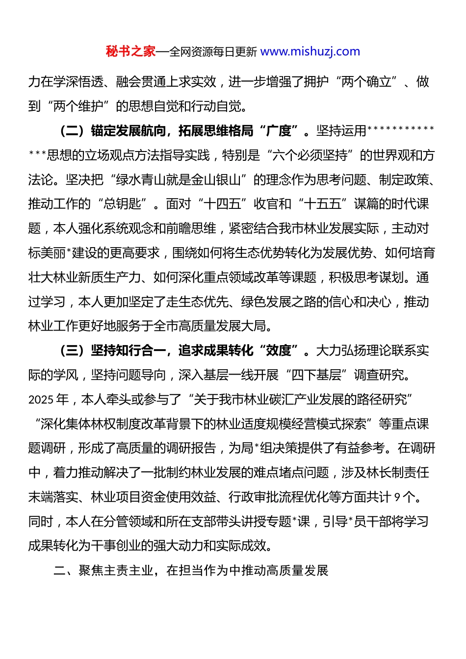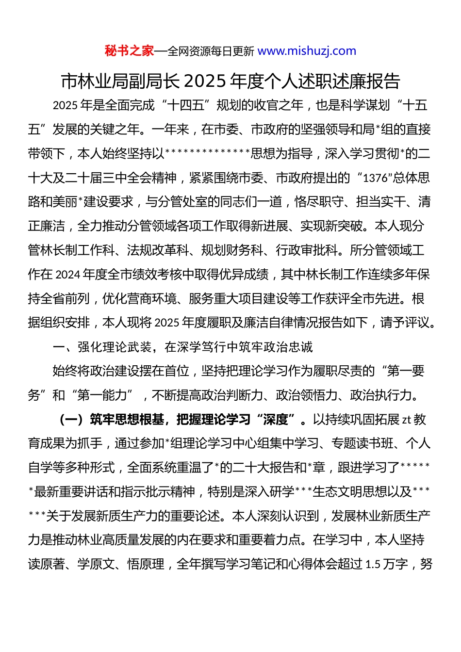 秘书之家—全网资源每日更新 www.mishuzj.com市林业局副局长 2025 年度个人述职述廉报告2025 年是全面完成“十四五”规划的收官之年,也是科学谋划“十五五”发展的关键之年。一年来,在市委、市政府的坚强领导和局*组的直接带领下,本人始终坚持以**************思想为指导,深入学习贯彻*的二十大及二十届三中全会精神,紧紧围绕市委、市政府提出的“1376”总体思路和美丽*建设要求,与分管处室的同志们一道,恪尽职守、担当实干、清正廉洁,全力推动分管领域各项工作取得新进展、实现新突破。本人现分管林长制工作科、法规改革科、规划财务科、行政审批科。所分管领域工作在 2024 年度全市绩效考核中取得优异成绩,其中林长制工作连续多年保持全省前列,优化营商环境、服务重大项目建设等工作获评全市先进。根据组织安排,本人现将 2025 年度履职及廉洁自律情况报告如下,请予评议。一、强化理论武装,在深学笃行中筑牢政治忠诚始终将政治建设摆在首位,坚持把理论学习作为履职尽责的“第一要务”和“第一能力”,不断提高政治判断力、政治领悟力、政治执行力。(一)筑牢思想根基,把握理论学习“深度”。以持续巩固拓展 zt 教育成果为抓手,通过参加*组理论学习中心组集中学习、专题读书班、个人自学等多种形式,全面系统重温了*的二十大报告和*章,跟进学习了******最新重要讲话和指示批示精神,特别是深入研学***生态文明思想以及******关于发展新质生产力的重要论述。本人深刻认识到,发展林业新质生产力是推动林业高质量发展的内在要求和重要着力点。在学习中,本人坚持读原著、学原文、悟原理,全年撰写学习笔记和心得体会超过 1.5 万字,努秘书之家—全网资源每日更新 www.mishuzj.com力在学深悟透、融会贯通上求实效,进一步增强了拥护“两个确立”、做到“两个维护”的思想自觉和行动自觉。(二)锚定发展航向,拓展思维格局“广度”。坚持运用**************思想的立场观点方法指导实践,特别是“六个必须坚持”的世界观和方法论。坚决把“绿水青山就是金山银山”的理念作为思考问题、制定政策、推动工作的“总钥匙”。面对“十四五”收官和“十五五”谋篇的时代课题,本人强化系统观念和前瞻思维,紧密结合我市林业发展实际,主动对标美丽*建设的更高要求,围绕如何将生态优势转化为发展优势、如何培育壮大林业新质生产力、如何深化重点领域改革等课题,积极思考谋划。通过学习,本人更加坚定了走生态优先、绿色发展之路的信心和决心,推动林业工作更好地服务于全市高质量发展大局。(三)坚持知行合一,追求成果转化“效度”。大力弘扬理论联系实际的学风,坚持问题导向,深入基层一线开展“四下基层”调查研究。2025 年,本人牵头或参与了“关于我市林业碳汇产业发展的路径研究”“深化集体林权制度改革背景下的林业适度规模经营模式探索”等重点课题调研,形成了高质量的调研报告,为局*组决策提供了有益参考。在调研中,着力推动解决了一批制约林业发展的难点堵点问题,涉及林长制责任末端落实、林业项目资金使用效益、行政审批流程优化等方面共计 9 个。同时,本人在分管领域和所在支部带头讲授专题*课,引导*员干部将学习成果转化为干事创业的强大动力和实际成效。二、聚焦主责主业,在担当作为中推动高质量发展秘书之家—全网资源每日更新 www.mishuzj.com本人始终牢记职责使命,紧扣年度目标任务,以钉钉子精神狠抓落实,推动分管工作在服务大局中展现新作为。(一)纵深推进林长制改革,擦亮生态文明建设“*名片”持续巩固提升我市林长制工作在全省的标杆地位。一是健全完善工作体系。在 2023 年、2024 年连续获得全省林长制工作考核“优秀”等次的基础上,推动 2025 年林长制工作向纵深发展。提请市委、市政府高规格召开全市林长会议,主持举办全市林长制工作部署暨业务培训会,进一步压实各级林长责任。创新和深化“林长+检察长”“林长+警长”等协作机制,形成强大保护合力。2025 年,聚焦古树名木保护、重点区域生物多样性保护等关键领域,提请市级林长签发林长令 3 道,有效解决了数个长期存在的生态管护难题。二是强化督查...