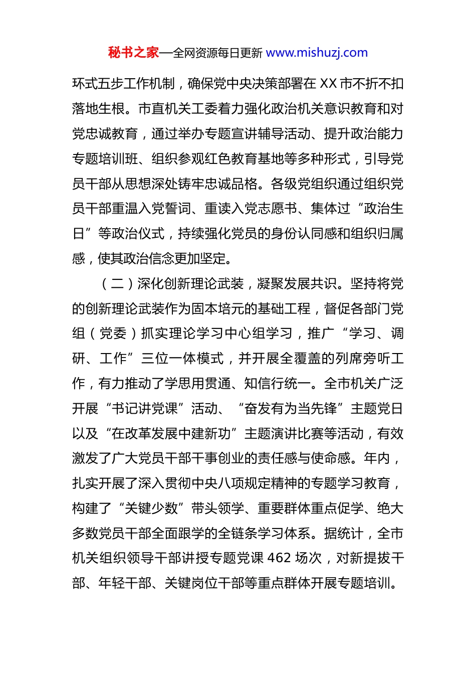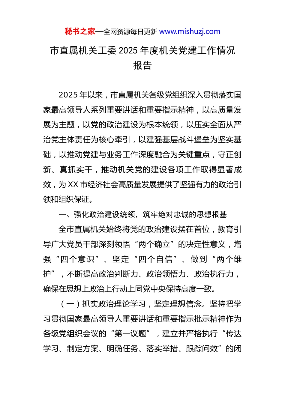 秘书之家—全网资源每日更新 www.mishuzj.com市直属机关工委 2025 年度机关党建工作情况报告 2025 年以来,市直属机关各级党组织深入贯彻落实国家最高领导人系列重要讲话和重要指示精神,以高质量发展为主题,以党的政治建设为根本统领,以压实全面从严治党主体责任为核心牵引,以建强基层战斗堡垒为坚实基础,以推动党建与业务工作深度融合为关键重点,守正创新、真抓实干,推动机关党的建设各项工作取得显著成效,为 XX 市经济社会高质量发展提供了坚强有力的政治引领和组织保证。一、强化政治建设统领,筑牢绝对忠诚的思想根基全市直属机关始终将党的政治建设摆在首位,教育引导广大党员干部深刻领悟“两个确立”的决定性意义,增强“四个意识”、坚定“四个自信”、做到“两个维护”,不断提高政治判断力、政治领悟力、政治执行力,确保在思想上政治上行动上同党中央保持高度一致。(一)抓实政治理论学习,坚定理想信念。坚持把学习贯彻国家最高领导人重要讲话和重要指示批示精神作为各级党组织会议的“第一议题”,建立并严格执行“传达学习、制定方案、明确任务、落实举措、跟踪问效”的闭秘书之家—全网资源每日更新 www.mishuzj.com环式五步工作机制,确保党中央决策部署在 XX 市不折不扣落地生根。市直机关工委着力强化政治机关意识教育和对党忠诚教育,通过举办专题宣讲辅导活动、提升政治能力专题培训班、组织参观红色教育基地等多种形式,引导党员干部从思想深处铸牢忠诚品格。各级党组织通过组织党员干部重温入党誓词、重读入党志愿书、集体过“政治生日”等政治仪式,持续强化党员的身份认同感和组织归属感,使其政治信念更加坚定。(二)深化创新理论武装,凝聚发展共识。坚持将党的创新理论武装作为固本培元的基础工程,督促各部门党组(党委)抓实理论学习中心组学习,推广“学习、调研、工作”三位一体模式,并开展全覆盖的列席旁听工作,有力推动了学思用贯通、知信行统一。全市机关广泛开展“书记讲党课”活动、“奋发有为当先锋”主题党日以及“在改革发展中建新功”主题演讲比赛等活动,有效激发了广大党员干部干事创业的责任感与使命感。年内,扎实开展了深入贯彻中央八项规定精神的专题学习教育,构建了“关键少数”带头领学、重要群体重点促学、绝大多数党员干部全面跟学的全链条学习体系。据统计,全市机关组织领导干部讲授专题党课 462 场次,对新提拔干部、年轻干部、关键岗位干部等重点群体开展专题培训。秘书之家—全网资源每日更新 www.mishuzj.com在学习教育中,各单位领导班子对标对表,深挖细查突出问题,并以动真碰硬的态度推动问题整改落实,取得了阶段性成效。(三)强化业务能力练兵,提升履职本领。始终把干部能力作风建设作为一项长期性、基础性工作来抓,紧密围绕市委、市政府部署的优化营商环境、降低全社会物流成本、现代农业产业发展等“三个一号工程”,精心设计了一系列特色培训课程。其中包括依托本地高校资源的“XX 共建”名师特色课、发挥传帮带作用的领导骨干帮带课,以及聚焦专业领域的“淬炼赋能”重点领域专业课,举办跨部门、跨系统的联学讲堂,有效拓宽了干部视野。同时,根据不同行业、部门及岗位的实际需求,聚焦社会治理、应急处置、项目建设等重点工作,显著提升了干部队伍的专业素养和实战能力。二、夯实基层组织基础,提升机关党建的整体效能全市直属机关牢固树立大抓基层的鲜明导向,坚持问题导向和目标导向相结合,持续用力推动基层党组织在标准化、规范化建设上取得新突破,实现全面进步、全面过硬。(一)压实贯通到底的党建责任体系。为解决机关党建“上热中温下冷”问题,研究建立了知责明责、履责尽秘书之家—全网资源每日更新 www.mishuzj.com责、督责考责的闭环式工作机制,有力推动了各部门党组(党委)切实当好主角、抓好主业、履行好主责。工委制定印发了《市直机关部门党组(党委)落实机关党建主体责任指引清单》,清晰界定了 4 类责任主体和 22 项主要职责任务,为各级党组织履责提供了明确依据,推动了知责于心、担责于身、履责于行。同时,不断完善新任职党组织书记任前谈话、...