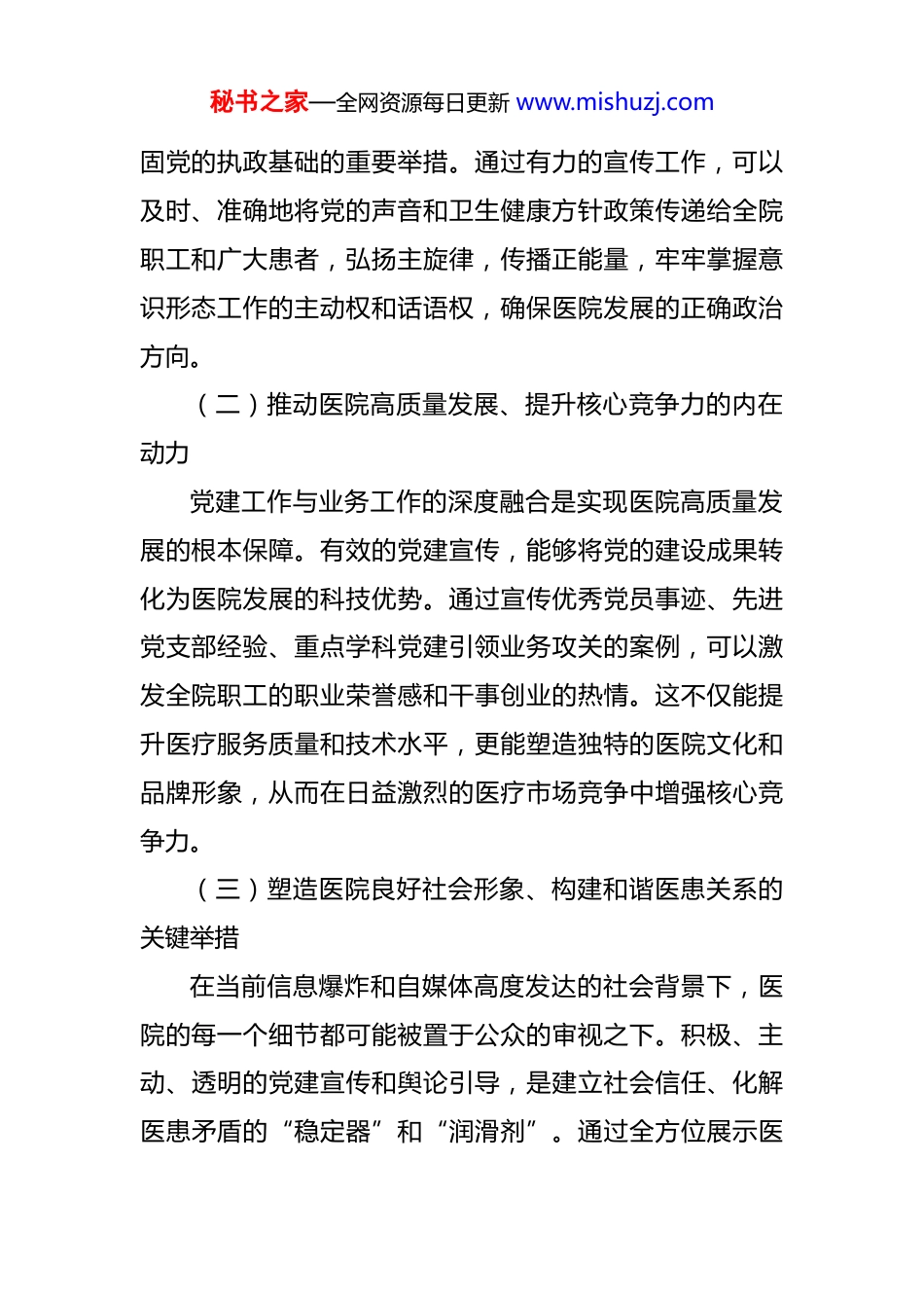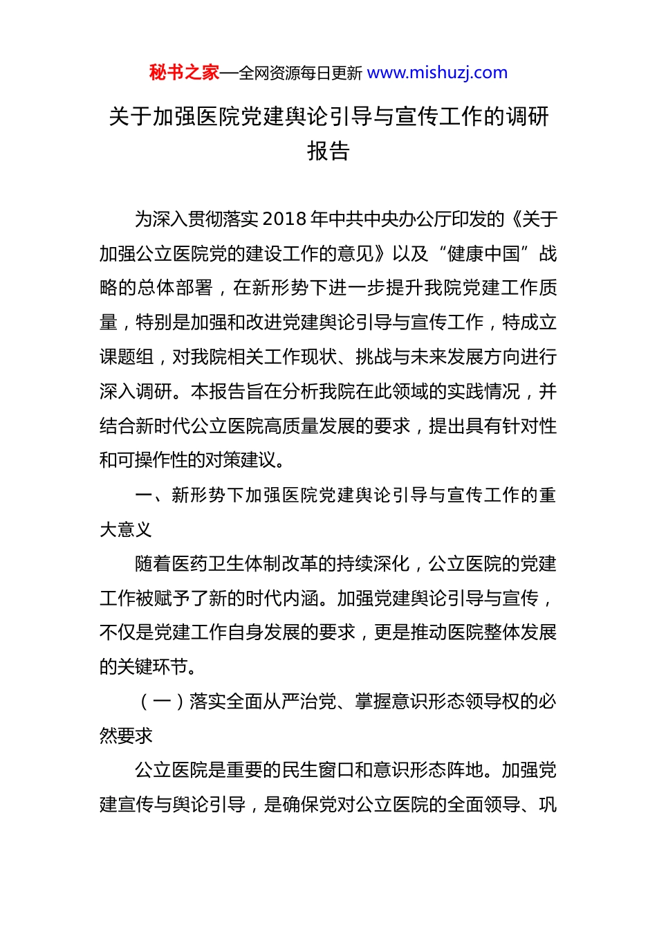 秘书之家—全网资源每日更新 www.mishuzj.com关于加强医院党建舆论引导与宣传工作的调研报告 为深入贯彻落实 2018 年中共中央办公厅印发的《关于加强公立医院党的建设工作的意见》以及“健康中国”战略的总体部署,在新形势下进一步提升我院党建工作质量,特别是加强和改进党建舆论引导与宣传工作,特成立课题组,对我院相关工作现状、挑战与未来发展方向进行深入调研。本报告旨在分析我院在此领域的实践情况,并结合新时代公立医院高质量发展的要求,提出具有针对性和可操作性的对策建议。一、新形势下加强医院党建舆论引导与宣传工作的重大意义随着医药卫生体制改革的持续深化,公立医院的党建工作被赋予了新的时代内涵。加强党建舆论引导与宣传,不仅是党建工作自身发展的要求,更是推动医院整体发展的关键环节。(一)落实全面从严治党、掌握意识形态领导权的必然要求公立医院是重要的民生窗口和意识形态阵地。加强党建宣传与舆论引导,是确保党对公立医院的全面领导、巩秘书之家—全网资源每日更新 www.mishuzj.com固党的执政基础的重要举措。通过有力的宣传工作,可以及时、准确地将党的声音和卫生健康方针政策传递给全院职工和广大患者,弘扬主旋律,传播正能量,牢牢掌握意识形态工作的主动权和话语权,确保医院发展的正确政治方向。(二)推动医院高质量发展、提升核心竞争力的内在动力党建工作与业务工作的深度融合是实现医院高质量发展的根本保障。有效的党建宣传,能够将党的建设成果转化为医院发展的科技优势。通过宣传优秀党员事迹、先进党支部经验、重点学科党建引领业务攻关的案例,可以激发全院职工的职业荣誉感和干事创业的热情。这不仅能提升医疗服务质量和技术水平,更能塑造独特的医院文化和品牌形象,从而在日益激烈的医疗市场竞争中增强核心竞争力。(三)塑造医院良好社会形象、构建和谐医患关系的关键举措在当前信息爆炸和自媒体高度发达的社会背景下,医院的每一个细节都可能被置于公众的审视之下。积极、主动、透明的党建宣传和舆论引导,是建立社会信任、化解医患矛盾的“稳定器”和“润滑剂”。通过全方位展示医秘书之家—全网资源每日更新 www.mishuzj.com院在党建引领下改善医疗服务、关心关爱患者、勇担社会责任等方面的作为与成效,能够有效对冲负面舆情,增进公众对医院工作的理解与支持,营造尊医重卫的良好社会氛围,构建和谐稳定的医患关系。二、*医院党建舆论引导与宣传工作现状与挑战我院作为一家集医疗、教学、科研于一体的非营利性二级甲等综合医院,党建工作基础扎实。医院实行党委书记、院长分设,设立党委及纪委,下辖 10 个党支部,实现了党组织在所有科室的全面覆盖。全院在岗人员 884 人,共有在职党员 148 人,占在职职工比例为 21.0%。党员队伍结构合理,其中 35 岁及以下青年党员 38 人,为宣传工作注入了活力。然而,在党建舆论引导与宣传方面,仍面临一些挑战。(一)组织领导有力,但宣传工作统筹协调机制有待完善我院党委高度重视党建工作,党务工作机构设置基本符合规定。但在宣传工作层面,尚未形成“党委统一领导、宣传部门牵头抓总、各支部协同落实、全员共同参与”的“大宣传”格局。宣传工作多由党办或院办兼管,与其他职能科室、临床科室的联动不足,导致宣传内容局限于会议报道、活动通知等,未能充分挖掘各支部、各科秘书之家—全网资源每日更新 www.mishuzj.com室的宣传资源。中层以上 84 名干部中党员仅 35 人,虽然体现了干部选拔的开放性,但也对党建宣传工作在各科室的贯彻执行提出更高要求。(二)宣传阵地初步建立,但内容创新与传播效能不足目前,我院已开通官方网站、微信公众号等宣传平台,为党建宣传提供了基本载体。但与一些先进医院相比,我院的宣传工作存在明显的“两张皮”现象,即党建工作与业务工作在宣传上相互脱节。内容上,多为对上级文件和会议精神的“复印式”传达,缺少对医院自身党建特色、党员风采、医患故事的深度挖掘和生动呈现。形式上,仍以图文为主,缺乏像徐州医科大学附属医院那样运用微电影、漫画、Vlog 等更具吸引力和传播力的全媒体手段。这导致我院的...