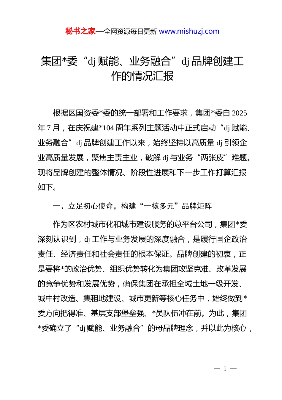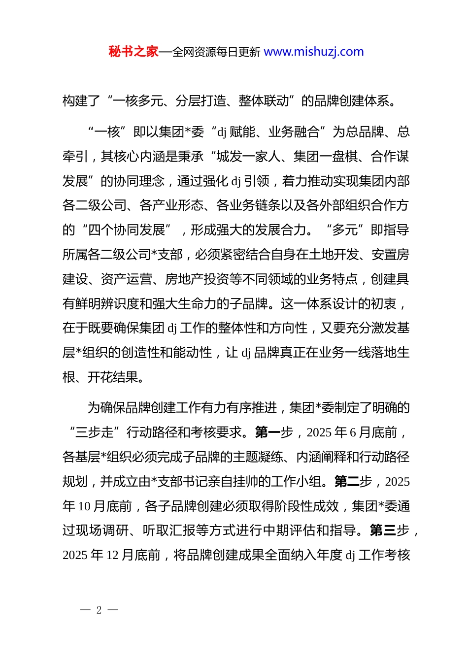 秘书之家—全网资源每日更新 www.mishuzj.com集团*委“dj 赋能、业务融合”dj 品牌创建工作的情况汇报根据区国资委*委的统一部署和工作要求,集团*委自 2025年 7 月,在庆祝建*104 周年系列主题活动中正式启动“dj 赋能、业务融合”dj 品牌创建工作以来,始终坚持以高质量 dj 引领企业高质量发展,聚焦主责主业,破解 dj 与业务“两张皮”难题。现将品牌创建的整体情况、阶段性进展和下一步工作打算汇报如下。一、立足初心使命,构建“一核多元”品牌矩阵作为区农村城市化和城市建设服务的总平台公司,集团*委深刻认识到,dj 工作与业务发展的深度融合,是履行国企政治责任、经济责任和社会责任的根本保证。品牌创建的初衷,正是要将*的政治优势、组织优势转化为集团攻坚克难、改革发展的竞争优势和发展优势,确保集团在承担全域土地一级开发、城中村改造、集租地建设、城市更新等核心任务中,始终做到*委方向把得准、基层支部堡垒强、*员队伍冲在前。为此,集团*委确立了“dj 赋能、业务融合”的母品牌理念,并以此为核心,— 1 —秘书之家—全网资源每日更新 www.mishuzj.com构建了“一核多元、分层打造、整体联动”的品牌创建体系。“一核”即以集团*委“dj 赋能、业务融合”为总品牌、总牵引,其核心内涵是秉承“城发一家人、集团一盘棋、合作谋发展”的协同理念,通过强化 dj 引领,着力推动实现集团内部各二级公司、各产业形态、各业务链条以及各外部组织合作方的“四个协同发展”,形成强大的发展合力。“多元”即指导所属各二级公司*支部,必须紧密结合自身在土地开发、安置房建设、资产运营、房地产投资等不同领域的业务特点,创建具有鲜明辨识度和强大生命力的子品牌。这一体系设计的初衷,在于既要确保集团 dj 工作的整体性和方向性,又要充分激发基层*组织的创造性和能动性,让 dj 品牌真正在业务一线落地生根、开花结果。为确保品牌创建工作有力有序推进,集团*委制定了明确的“三步走”行动路径和考核要求。第一步,2025 年 6 月底前,各基层*组织必须完成子品牌的主题凝练、内涵阐释和行动路径规划,并成立由*支部书记亲自挂帅的工作小组。第二步,2025年 10 月底前,各子品牌创建必须取得阶段性成效,集团*委通过现场调研、听取汇报等方式进行中期评估和指导。第三步,2025 年 12 月底前,将品牌创建成果全面纳入年度 dj 工作考核— 2 —秘书之家—全网资源每日更新 www.mishuzj.com和基层*组织书记抓 dj 述职评议,以刚性约束倒逼责任落实。整个创建过程,强调*组织战斗堡垒作用和*员先锋模范作用的发挥,要求*组织的工作必须延伸至生产现场、项目一线、攻坚前沿,通过深化*员干部“揭榜挂帅”、组建*员先锋队等机制,做到哪里有急难险重任务,哪里就有*组织坚强领导、就有*员带头冲锋,从而将品牌创建的“软实力”转化为推动年度目标高质量完成的“硬支撑”。二、聚焦精准赋能,推动品牌创建走深走实自品牌创建工作启动以来,集团*委与各二级公司*支部上下联动、同向发力,品牌创建的理念正逐步转化为破解难题、促进发展的生动实践。集团层面强化顶层设计与资源协同,基层支部则深耕业务一线,探索特色路径,形成了“头雁领航、雁阵齐飞”的良好局面。首先,在集团层面,*委注重加强统筹指导和外部联动,为品牌创建“蓄势赋能”。一方面,集团*委于 2025 年 9 月组织召开了品牌创建工作推进调度会,听取各支部工作进展汇报,针对各子品牌推进过程中遇到的共性问题和个性难题,现场“会诊把脉”,提出指导意见,确保创建工作不偏向、不走样。另一方面,为践行“合作谋发展”的协同理念,集团*委主动— 3 —秘书之家—全网资源每日更新 www.mishuzj.com“走出去”,先后与 xx 智地、xx 新城等行业标杆企业的*组织开展了 3 次 dj 联学活动。通过实地参观、经验交流、项目研讨等形式,不仅学习了对方在“dj+工程管理”、“dj+科技创新”等方面的先进做法,更在交流中探寻业务合作的契机,将dj 联建平台拓展为资源共享、优势互补的业务促进平台,有效提升了品牌创建的视野和格局。其次,在二级公司层面,各*...