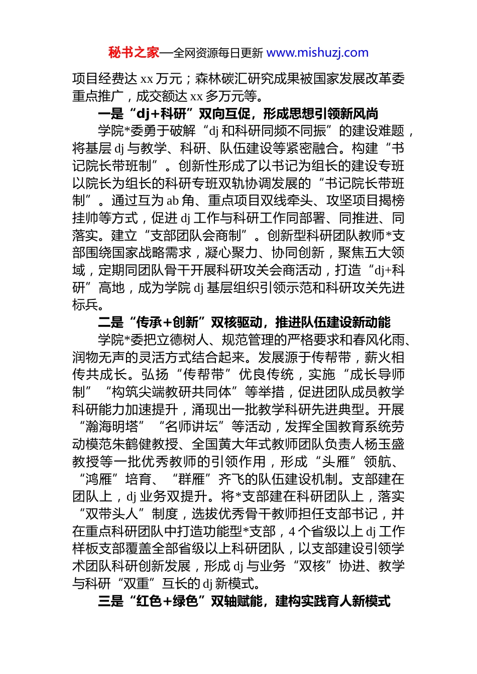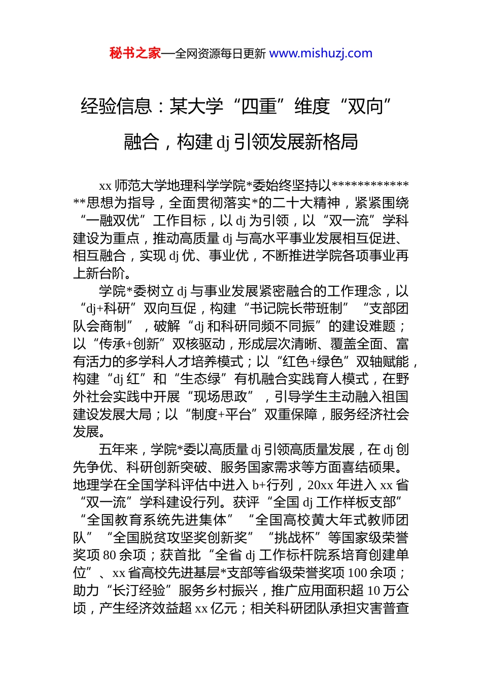 秘书之家—全网资源每日更新 www.mishuzj.com经验信息:某大学“四重”维度“双向”融合,构建 dj 引领发展新格局xx 师范大学地理科学学院*委始终坚持以**************思想为指导,全面贯彻落实*的二十大精神,紧紧围绕“一融双优”工作目标,以 dj 为引领,以“双一流”学科建设为重点,推动高质量 dj 与高水平事业发展相互促进、相互融合,实现 dj 优、事业优,不断推进学院各项事业再上新台阶。学院*委树立 dj 与事业发展紧密融合的工作理念,以“dj+科研”双向互促,构建“书记院长带班制”“支部团队会商制”,破解“dj 和科研同频不同振”的建设难题;以“传承+创新”双核驱动,形成层次清晰、覆盖全面、富有活力的多学科人才培养模式;以“红色+绿色”双轴赋能,构建“dj 红”和“生态绿”有机融合实践育人模式,在野外社会实践中开展“现场思政”,引导学生主动融入祖国建设发展大局;以“制度+平台”双重保障,服务经济社会发展。五年来,学院*委以高质量 dj 引领高质量发展,在 dj 创先争优、科研创新突破、服务国家需求等方面喜结硕果。地理学在全国学科评估中进入 b+行列,20xx 年进入 xx 省“双一流”学科建设行列。获评“全国 dj 工作样板支部”“全国教育系统先进集体”“全国高校黄大年式教师团队”“全国脱贫攻坚奖创新奖”“挑战杯”等国家级荣誉奖项 80 余项;获首批“全省 dj 工作标杆院系培育创建单位”、xx 省高校先进基层*支部等省级荣誉奖项 100 余项;助力“长汀经验”服务乡村振兴,推广应用面积超 10 万公顷,产生经济效益超 xx 亿元;相关科研团队承担灾害普查秘书之家—全网资源每日更新 www.mishuzj.com项目经费达 xx 万元;森林碳汇研究成果被国家发展改革委重点推广,成交额达 xx 多万元等。一是“dj+科研”双向互促,形成思想引领新风尚学院*委勇于破解“dj 和科研同频不同振”的建设难题,将基层 dj 与教学、科研、队伍建设等紧密融合。构建“书记院长带班制”。创新性形成了以书记为组长的建设专班以院长为组长的科研专班双轨协调发展的“书记院长带班制”。通过互为 ab 角、重点项目双线牵头、攻坚项目揭榜挂帅等方式,促进 dj 工作与科研工作同部署、同推进、同落实。建立“支部团队会商制”。创新型科研团队教师*支部围绕国家战略需求,凝心聚力、协同创新,聚焦五大领域,定期同团队骨干开展科研攻关会商活动,打造“dj+科研”高地,成为学院 dj 基层组织引领示范和科研攻关先进标兵。二是“传承+创新”双核驱动,推进队伍建设新动能学院*委把立德树人、规范管理的严格要求和春风化雨、润物无声的灵活方式结合起来。发展源于传帮带,薪火相传共成长。弘扬“传帮带”优良传统,实施“成长导师制”“构筑尖端教研共同体”等举措,促进团队成员教学科研能力加速提升,涌现出一批教学科研先进典型。开展“瀚海明塔”“名师讲坛”等活动,发挥全国教育系统劳动模范朱鹤健教授、全国黄大年式教师团队负责人杨玉盛教授等一批优秀教师的引领作用,形成“头雁”领航、“鸿雁”培育、“群雁”齐飞的队伍建设机制。支部建在团队上,dj 业务双提升。将*支部建在科研团队上,落实“双带头人”制度,选拔优秀骨干教师担任支部书记,并在重点科研团队中打造功能型*支部,4 个省级以上 dj 工作样板支部覆盖全部省级以上科研团队,以支部建设引领学术团队科研创新发展,形成 dj 与业务“双核”协进、教学与科研“双重”互长的 dj 新模式。三是“红色+绿色”双轴赋能,建构实践育人新模式秘书之家—全网资源每日更新 www.mishuzj.com学院*委始终以实践育人为载体,倡导知行合一,全力推进*员创新实践能力的培养,形成“红色+绿色”实践育人模式。“dj 红”引领“生态绿”。深入挖掘八闽大地丰富的思政教育资源,利用红色资源,组织学生前往上杭古田会议会址等多地开展现场思政教育;成立学生红色理论宣讲团,以身边人讲身边事的方式开展“菜单式”理论宣讲,结合国家生态文明建设战略规划,引导学生主动融入祖国建设发展大局。“生态绿”促进“dj 红”。把课程开设在闽江河口湿地、三明野外站等...