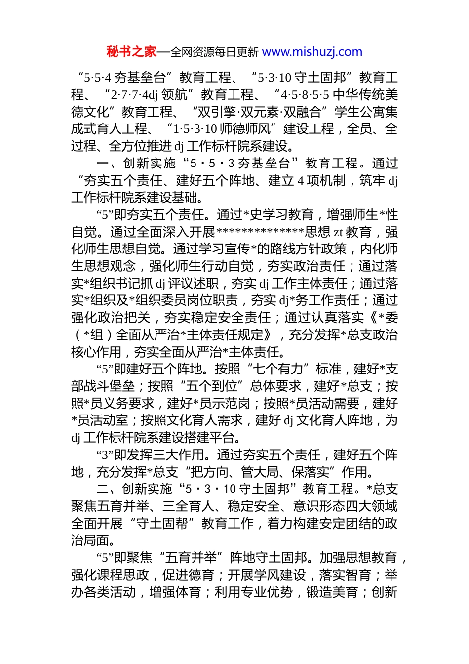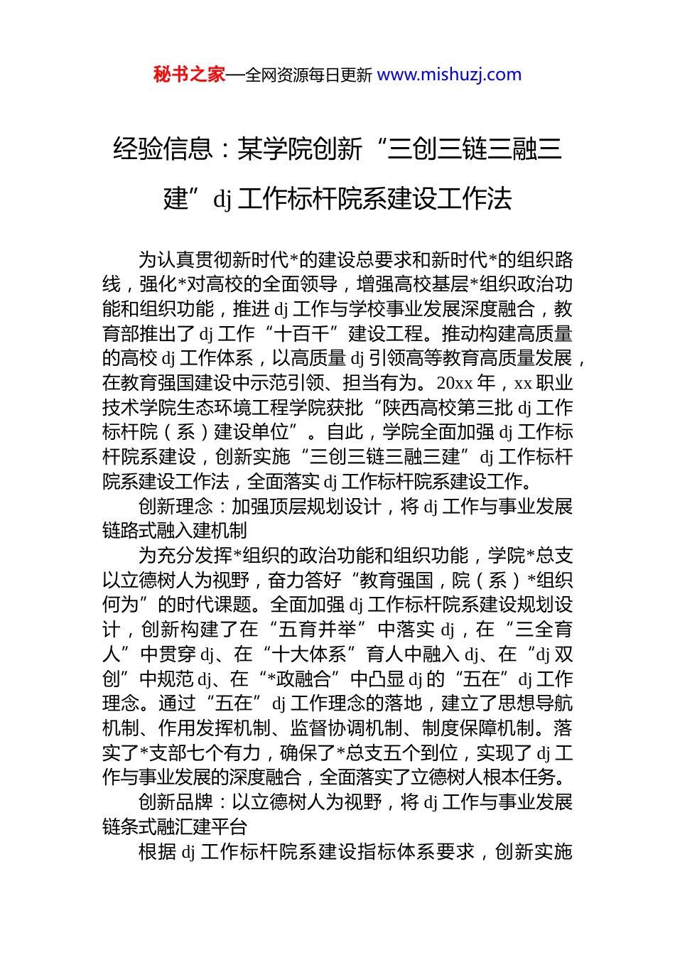 秘书之家—全网资源每日更新 www.mishuzj.com经验信息:某学院创新“三创三链三融三建”dj 工作标杆院系建设工作法为认真贯彻新时代*的建设总要求和新时代*的组织路线,强化*对高校的全面领导,增强高校基层*组织政治功能和组织功能,推进 dj 工作与学校事业发展深度融合,教育部推出了 dj 工作“十百千”建设工程。推动构建高质量的高校 dj 工作体系,以高质量 dj 引领高等教育高质量发展,在教育强国建设中示范引领、担当有为。20xx 年,xx 职业技术学院生态环境工程学院获批“陕西高校第三批 dj 工作标杆院(系)建设单位”。自此,学院全面加强 dj 工作标杆院系建设,创新实施“三创三链三融三建”dj 工作标杆院系建设工作法,全面落实 dj 工作标杆院系建设工作。创新理念:加强顶层规划设计,将 dj 工作与事业发展链路式融入建机制为充分发挥*组织的政治功能和组织功能,学院*总支以立德树人为视野,奋力答好“教育强国,院(系)*组织何为”的时代课题。全面加强 dj 工作标杆院系建设规划设计,创新构建了在“五育并举”中落实 dj,在“三全育人”中贯穿 dj、在“十大体系”育人中融入 dj、在“dj 双创”中规范 dj、在“*政融合”中凸显 dj 的“五在”dj 工作理念。通过“五在”dj 工作理念的落地,建立了思想导航机制、作用发挥机制、监督协调机制、制度保障机制。落实了*支部七个有力,确保了*总支五个到位,实现了 dj 工作与事业发展的深度融合,全面落实了立德树人根本任务。创新品牌:以立德树人为视野,将 dj 工作与事业发展链条式融汇建平台根据 dj 工作标杆院系建设指标体系要求,创新实施秘书之家—全网资源每日更新 www.mishuzj.com“5·5·4 夯基垒台”教育工程、“5·3·10 守土固邦”教育工程、“2·7·7·4dj 领航”教育工程、“4·5·8·5·5 中华传统美德文化”教育工程、“双引擎·双元素·双融合”学生公寓集成式育人工程、“1·5·3·10 师德师风”建设工程,全员、全过程、全方位推进 dj 工作标杆院系建设。一、创新实施“5·5·3 夯基垒台”教育工程。通过“夯实五个责任、建好五个阵地、建立 4 项机制,筑牢 dj工作标杆院系建设基础。“5”即夯实五个责任。通过*史学习教育,增强师生*性自觉。通过全面深入开展**************思想 zt 教育,强化师生思想自觉。通过学习宣传*的路线方针政策,内化师生思想观念,强化师生行动自觉,夯实政治责任;通过落实*组织书记抓 dj 评议述职,夯实 dj 工作主体责任;通过落实*组织及*组织委员岗位职责,夯实 dj*务工作责任;通过强化政治把关,夯实稳定安全责任;通过认真落实《*委(*组)全面从严治*主体责任规定》,充分发挥*总支政治核心作用,夯实全面从严治*主体责任。“5”即建好五个阵地。按照“七个有力”标准,建好*支部战斗堡垒;按照“五个到位”总体要求,建好*总支;按照*员义务要求,建好*员示范岗;按照*员活动需要,建好*员活动室;按照文化育人需求,建好 dj 文化育人阵地,为dj 工作标杆院系建设搭建平台。“3”即发挥三大作用。通过夯实五个责任,建好五个阵地,充分发挥*总支“把方向、管大局、保落实”作用。二、创新实施“5·3·10 守土固邦”教育工程。*总支聚焦五育并举、三全育人、稳定安全、意识形态四大领域全面开展“守土固帮”教育工作,着力构建安定团结的政治局面。“5”即聚焦“五育并举”阵地守土固邦。加强思想教育,强化课程思政,促进德育;开展学风建设,落实智育;举办各类活动,增强体育;利用专业优势,锻造美育;创新秘书之家—全网资源每日更新 www.mishuzj.com劳动课教育教学实施场景,落地劳育。将*的路线方针政策要求及时送达“五育并举”教育阵地,筑牢“五育并举”阵地政治思想根基。“3”即聚焦“三全育人”场所守土固邦。以 dj 为引领、拓展育人阵地、深化育人内涵、整合育人力量、更新育人理念、创新育人品牌,构建“学校、学院、家庭、社会、学生实习就业企业和学生”六方联动机制,适时将思想政治要求送达“三全育人”实施场所,确保“三全育人”实施场所的政治性、思想性和安全性。“10”...