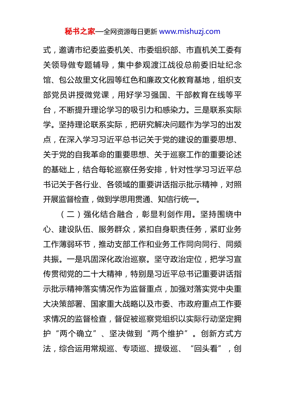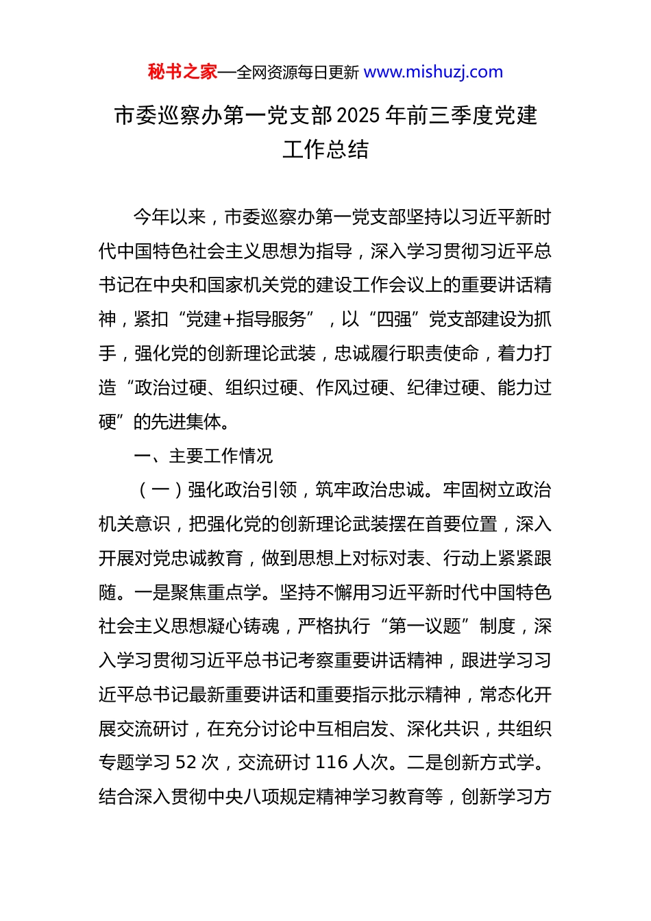 秘书之家—全网资源每日更新 www.mishuzj.com市委巡察办第一党支部 2025 年前三季度党建工作总结 今年以来,市委巡察办第一党支部坚持以习近平新时代中国特色社会主义思想为指导,深入学习贯彻习近平总书记在中央和国家机关党的建设工作会议上的重要讲话精神,紧扣“党建+指导服务”,以“四强”党支部建设为抓手,强化党的创新理论武装,忠诚履行职责使命,着力打造“政治过硬、组织过硬、作风过硬、纪律过硬、能力过硬”的先进集体。一、主要工作情况(一)强化政治引领,筑牢政治忠诚。牢固树立政治机关意识,把强化党的创新理论武装摆在首要位置,深入开展对党忠诚教育,做到思想上对标对表、行动上紧紧跟随。一是聚焦重点学。坚持不懈用习近平新时代中国特色社会主义思想凝心铸魂,严格执行“第一议题”制度,深入学习贯彻习近平总书记考察重要讲话精神,跟进学习习近平总书记最新重要讲话和重要指示批示精神,常态化开展交流研讨,在充分讨论中互相启发、深化共识,共组织专题学习 52 次,交流研讨 116 人次。二是创新方式学。结合深入贯彻中央八项规定精神学习教育等,创新学习方秘书之家—全网资源每日更新 www.mishuzj.com式,邀请市纪委监委机关、市委组织部、市直机关工委有关领导做专题辅导,集中参观渡江战役总前委旧址纪念馆、包公故里文化园等红色和廉政文化教育基地,组织支部党员讲授微党课,用好学习强国、干部教育在线等平台,不断提升理论学习的吸引力和感染力。三是联系实际学。坚持理论联系实际,把研究解决问题作为学习的出发点,在深入学习习近平总书记关于党的建设的重要思想、关于党的自我革命的重要思想、关于巡察工作的重要论述的基础上,结合每轮巡察任务安排,针对性学习习近平总书记关于各行业、各领域的重要讲话指示批示精神,对照开展监督检查,做到学思用贯通、知信行统一。(二)强化结合融合,彰显利剑作用。坚持围绕中心、建设队伍、服务群众,紧扣自身职责任务,紧盯业务工作薄弱环节,推动支部工作和业务工作同向同行、同频共振。一是巩固深化政治巡察。坚守政治定位,把学习宣传贯彻党的二十大精神,特别是习近平总书记重要讲话指示批示精神落实情况作为监督重点,加强对落实党中央重大决策部署、国家重大战略以及市委、市政府重点工作要求情况的监督检查,督促被巡察党组织以实际行动坚定拥护“两个确立”、坚决做到“两个维护”。创新方式方法,综合运用常规巡、专项巡、提级巡、“回头看”,创秘书之家—全网资源每日更新 www.mishuzj.com新采取“市委巡察组直接巡+授权市辖市交叉巡”等组织方式,高质量有节奏推进全覆盖,目前市委巡察对象 322 个已巡察 253 个,覆盖进度 78.6%。紧盯“关键少数”,突出加强对“一把手”的监督,累计对 330 名现任和原任被巡察党组织“一把手”履职用权、担当作为、廉洁自律等情况形成专题材料。强化指导协调,把“党建+指导服务”贯穿巡察全过程。巡前,指导巡察组规范成立临时党支部,协调相关单位向巡察组介绍情况。巡中,深入巡察组驻地开展中期调研和组办会商,慰问一线巡察干部,了解巡察进展和党建情况,现场解决问题。撤点后,组建专班对巡察文稿进行审核把关,提出修改建议 3300 余条。二是持续提升巡察质效。完善制度机制,先后制定《关于推进市县巡察工作高质量发展的若干意见》《关于推进市直单位巡察工作高质量发展的若干措施》等制度文件,不断健全巡察工作制度体系。细化分类指导,深入 90 多个市县巡察机构、50 多家市直单位现场调研座谈,帮助解决实际困难,推动 87 个市县成立巡察信息中心,举办 4 期市县新任职巡察干部和市直单位巡察干部培训班,手把手传授经验做法,促进履职能力提升。积极探索创新,完善“背包式”“巡察+协作区”“镇村同巡”“提级交叉”等有效方法,打造“巡乡带村”升级版,深化对村(社区)巡察。秘书之家—全网资源每日更新 www.mishuzj.com加强统筹指导,指导 16 个市辖市组建 305 个巡察组,聚焦“校园食品安全、农村‘三资’管理、高标准农田建设、安置房分配、农村饮用水安全和殡葬服务”等六大领域,对 203 个党...