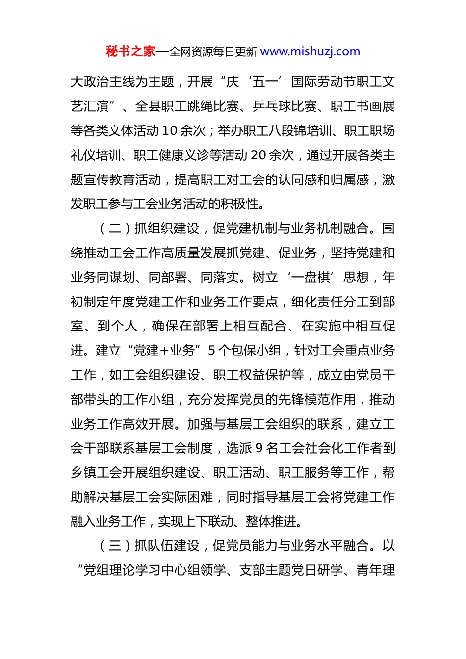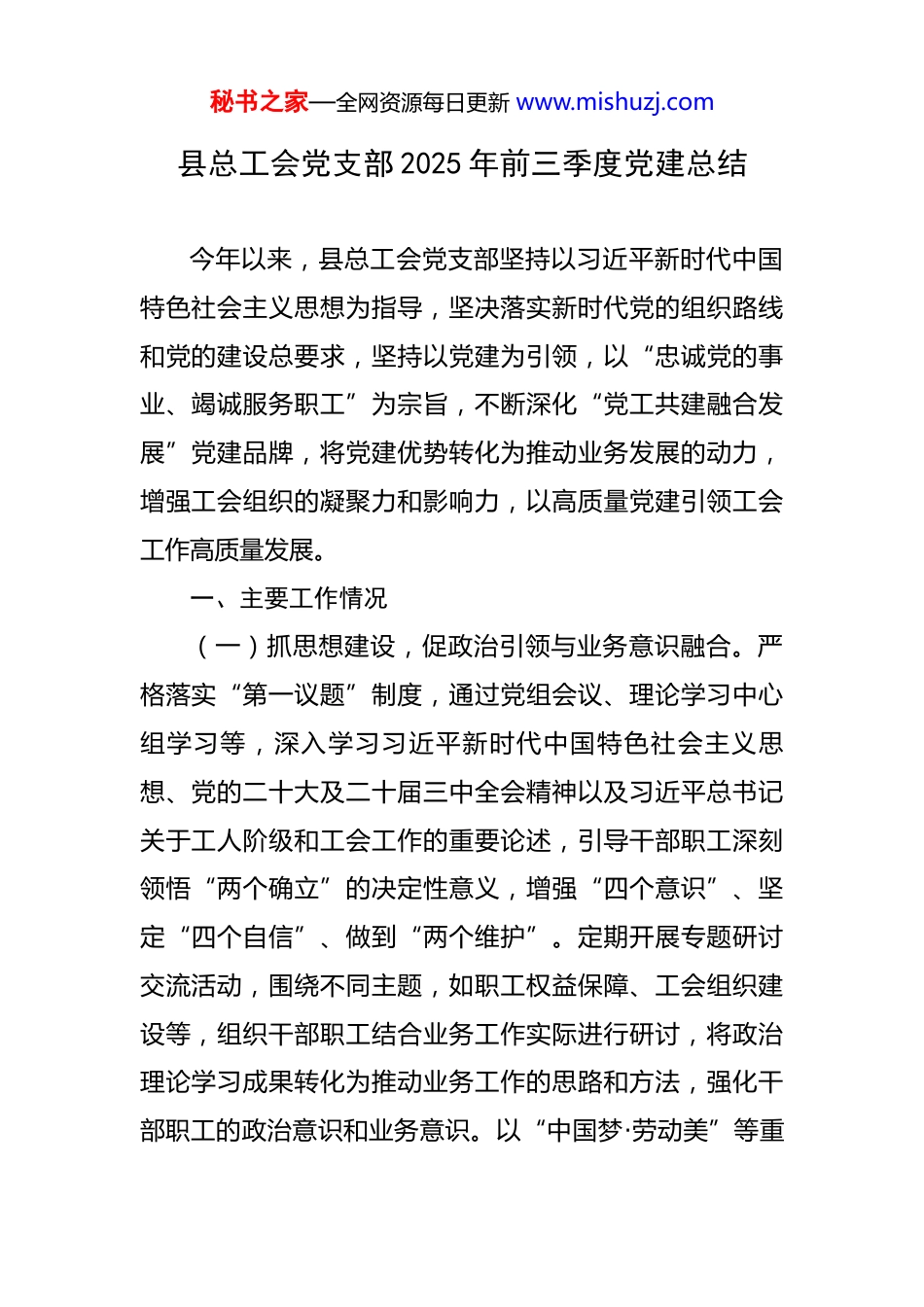 秘书之家—全网资源每日更新 www.mishuzj.com县总工会党支部 2025 年前三季度党建总结 今年以来,县总工会党支部坚持以习近平新时代中国特色社会主义思想为指导,坚决落实新时代党的组织路线和党的建设总要求,坚持以党建为引领,以“忠诚党的事业、竭诚服务职工”为宗旨,不断深化“党工共建融合发展”党建品牌,将党建优势转化为推动业务发展的动力,增强工会组织的凝聚力和影响力,以高质量党建引领工会工作高质量发展。一、主要工作情况(一)抓思想建设,促政治引领与业务意识融合。严格落实“第一议题”制度,通过党组会议、理论学习中心组学习等,深入学习习近平新时代中国特色社会主义思想、党的二十大及二十届三中全会精神以及习近平总书记关于工人阶级和工会工作的重要论述,引导干部职工深刻领悟“两个确立”的决定性意义,增强“四个意识”、坚定“四个自信”、做到“两个维护”。定期开展专题研讨交流活动,围绕不同主题,如职工权益保障、工会组织建设等,组织干部职工结合业务工作实际进行研讨,将政治理论学习成果转化为推动业务工作的思路和方法,强化干部职工的政治意识和业务意识。以“中国梦·劳动美”等重秘书之家—全网资源每日更新 www.mishuzj.com大政治主线为主题,开展“庆‘五一’国际劳动节职工文艺汇演”、全县职工跳绳比赛、乒乓球比赛、职工书画展等各类文体活动 10 余次;举办职工八段锦培训、职工职场礼仪培训、职工健康义诊等活动 20 余次,通过开展各类主题宣传教育活动,提高职工对工会的认同感和归属感,激发职工参与工会业务活动的积极性。(二)抓组织建设,促党建机制与业务机制融合。围绕推动工会工作高质量发展抓党建、促业务,坚持党建和业务同谋划、同部署、同落实。树立‘一盘棋’思想,年初制定年度党建工作和业务工作要点,细化责任分工到部室、到个人,确保在部署上相互配合、在实施中相互促进。建立“党建+业务”5 个包保小组,针对工会重点业务工作,如工会组织建设、职工权益保护等,成立由党员干部带头的工作小组,充分发挥党员的先锋模范作用,推动业务工作高效开展。加强与基层工会组织的联系,建立工会干部联系基层工会制度,选派 9 名工会社会化工作者到乡镇工会开展组织建设、职工活动、职工服务等工作,帮助解决基层工会实际困难,同时指导基层工会将党建工作融入业务工作,实现上下联动、整体推进。(三)抓队伍建设,促党员能力与业务水平融合。以“党组理论学习中心组领学、支部主题党日研学、青年理秘书之家—全网资源每日更新 www.mishuzj.com论学习小组互学”为抓手,累计开展学习研讨 30 余次,确保学习覆盖到每一名干部职工。结合工会系统“我的业务我来讲”活动,鼓励干部职工从“台下听众”转变为“台上讲师”,通过分享业务知识、工作经验、实操技巧,倒逼干部职工深学细研,提升综合能力,营造出“比学赶超、奋勇争先”的浓厚学习氛围。在实践中锻炼党员干部,以“我为群众办实事”实践活动为抓手,组建“职愿为您”志愿服务队,下沉企业车间、社区开展政策宣讲、技能培训、法律援助等服务 20 余次,提供法律咨询 300余人次,进一步了解职工需求,解决实际问题,在实践中锤炼党员干部的工作能力和服务意识,提升业务水平。二、主要工作成效(一)工会组织凝聚力和影响力显著增强。通过党建引领,县总工会在组织建设、服务职工等方面取得了显著成效,工会组织的凝聚力和影响力不断提升。全县新建基层工会 10 家,新增会员 1293 人,指导全县 7 家基层工会组织完成换届。创新职工普惠服务体系,举办春送岗位招聘会,提供 3300 个岗位,实现 1200 余名劳动者稳岗就业;开展线上招聘会 4 次,发布招聘信息 600 余条;开展“夏送清凉”系列活动,为 22 家企业一线发放防暑降温物资,惠及 10000 多名一线职工。秘书之家—全网资源每日更新 www.mishuzj.com(二)职工群众获得感、幸福感、安全感不断提升。县总工会通过一系列党建与业务融合的举措,切实解决了职工群众的实际问题,职工群众的获得感、幸福感、安全感不断提升。在困难职工帮扶方面,投入 28.32 万元,为500...