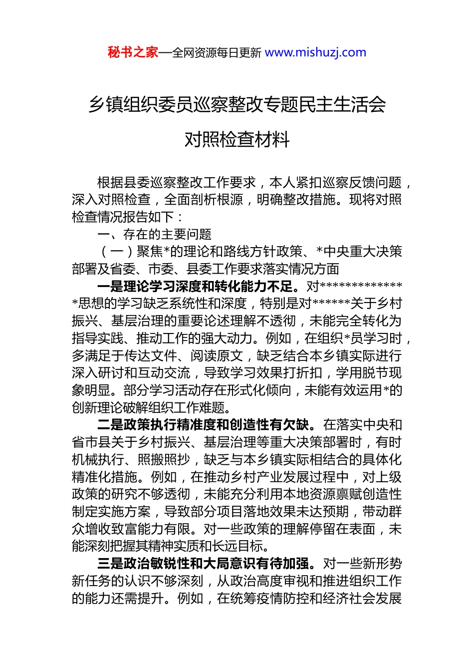 秘书之家—全网资源每日更新 www.mishuzj.com乡镇组织委员巡察整改专题民主生活会对照检查材料根据县委巡察整改工作要求,本人紧扣巡察反馈问题,深入对照检查,全面剖析根源,明确整改措施。现将对照检查情况报告如下:一、存在的主要问题(一)聚焦*的理论和路线方针政策、*中央重大决策部署及省委、市委、县委工作要求落实情况方面一是理论学习深度和转化能力不足。对**************思想的学习缺乏系统性和深度,特别是对******关于乡村振兴、基层治理的重要论述理解不透彻,未能完全转化为指导实践、推动工作的强大动力。例如,在组织*员学习时,多满足于传达文件、阅读原文,缺乏结合本乡镇实际进行深入研讨和互动交流,导致学习效果打折扣,学用脱节现象明显。部分学习活动存在形式化倾向,未能有效运用*的创新理论破解组织工作难题。二是政策执行精准度和创造性有欠缺。在落实中央和省市县关于乡村振兴、基层治理等重大决策部署时,有时机械执行、照搬照抄,缺乏与本乡镇实际相结合的具体化精准化措施。例如,在推动乡村产业发展过程中,对上级政策的研究不够透彻,未能充分利用本地资源禀赋创造性制定实施方案,导致部分项目落地效果未达预期,带动群众增收致富能力有限。对一些政策的理解停留在表面,未能深刻把握其精神实质和长远目标。三是政治敏锐性和大局意识有待加强。对一些新形势新任务的认识不够深刻,从政治高度审视和推进组织工作的能力还需提升。例如,在统筹疫情防控和经济社会发展秘书之家—全网资源每日更新 www.mishuzj.com防范化解重大风险等关键时刻,组织动员基层*组织和*员发挥作用的机制不够健全,响应速度和组织效能有待进一步提高。有时未能完全将组织工作放在全县、全乡发展大局中去谋划和推进,存在一定的本位主义思想。(二)聚焦群众身边不正之风和腐败问题情况一是联系服务群众不够深入扎实。下基层调研有时存在“走马观花”现象,未能真正沉下去倾听群众呼声,对群众反映强烈的突出问题跟踪解决不力。例如,对部分村(社区)干部办事不公、优亲厚友等问题的监督检查不够深入,未能及时有效发现和纠正一些苗头性、倾向性问题主动靠前服务意识不强,对群众的急难愁盼问题回应不够及时、解决不够彻底。二是工作作风存在形式主义、官僚主义倾向。一些工作过于注重形式和台账,忽视了实际效果和群众获得感。例如,在推动基层 dj 工作中,有时过于追求“材料美化”和“样板打造”,但在提升基层*组织整体功能、发挥实质作用上功夫下得不够深。会风文风有待改进,一些会议和文件未能做到精简高效,增加了基层负担。三是廉洁自律和风险防控意识需进一步强化。对分管领域和挂钩联系的村(社区)的廉政风险排查不够全面细致,警示教育针对性不强。例如,对农村“三资”管理、工程项目建设等关键领域的监督监管参与度不够,未能完全扎紧制度的笼子,存在一定的廉政风险隐患。对*员干部的日常监督管理偏重工作业绩,对“八小时以外”的生活圈、社交圈关注不够。(三)聚焦基层*组织领导班子和干部队伍建设情况一是 dj 工作责任制落实不够到位。对基层 dj 工作的整体谋划和系统推进不足,压力传导层层递减。例如,对个别村(社区)*组织书记履职不力、班子软弱涣散等问题,未能及时采取有效措施进行整顿提升,影响了基层*组织战斗力的发挥。对“三会一课”、组织生活会等基本制度的秘书之家—全网资源每日更新 www.mishuzj.com执行督促检查不够严格,存在不规范、不严肃的现象。二是干部队伍建设和人才培养存在短板。对乡镇年轻干部、后备干部的培养选拔缺乏长远规划和有效机制,干部队伍结构优化和能力提升措施不够有力。例如,在村(社区)“两委”干部队伍建设上,对能力素质培训不足部分干部存在“本领恐慌”,难以适应新形势新任务的要求。在激发干部队伍活力、担当作为方面,激励约束机制不够完善。三是*内政治生活不够严肃规范。民主生活会、组织生活会的“辣味”不足,批评与自我批评有时流于形式,未能真正达到“红脸出汗、排毒治病”的效果。例如,在自我批评时有时避重就轻,对他人批评时存在“老好人”思想,担心影响团结,未能直指...