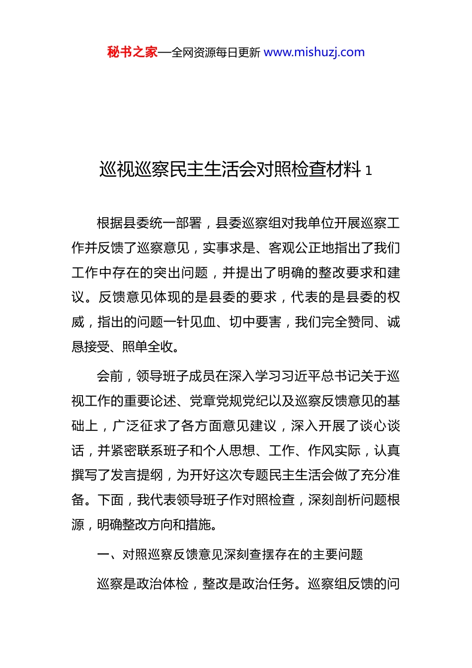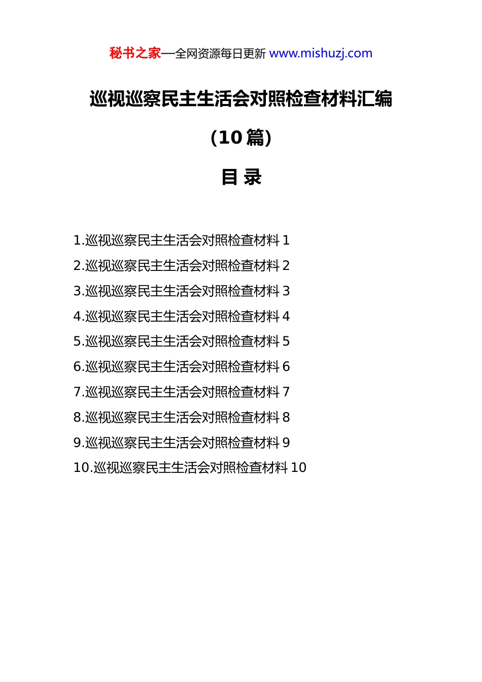 秘书之家—全网资源每日更新 www.mishuzj.com巡视巡察民主生活会对照检查材料汇编(10 篇)目 录1.巡视巡察民主生活会对照检查材料 12.巡视巡察民主生活会对照检查材料 23.巡视巡察民主生活会对照检查材料 34.巡视巡察民主生活会对照检查材料 45.巡视巡察民主生活会对照检查材料 56.巡视巡察民主生活会对照检查材料 67.巡视巡察民主生活会对照检查材料 78.巡视巡察民主生活会对照检查材料 89.巡视巡察民主生活会对照检查材料 910.巡视巡察民主生活会对照检查材料 10秘书之家—全网资源每日更新 www.mishuzj.com巡视巡察民主生活会对照检查材料 1根据县委统一部署,县委巡察组对我单位开展巡察工作并反馈了巡察意见,实事求是、客观公正地指出了我们工作中存在的突出问题,并提出了明确的整改要求和建议。反馈意见体现的是县委的要求,代表的是县委的权威,指出的问题一针见血、切中要害,我们完全赞同、诚恳接受、照单全收。会前,领导班子成员在深入学习习近平总书记关于巡视工作的重要论述、党章党规党纪以及巡察反馈意见的基础上,广泛征求了各方面意见建议,深入开展了谈心谈话,并紧密联系班子和个人思想、工作、作风实际,认真撰写了发言提纲,为开好这次专题民主生活会做了充分准备。下面,我代表领导班子作对照检查,深刻剖析问题根源,明确整改方向和措施。一、对照巡察反馈意见深刻查摆存在的主要问题巡察是政治体检,整改是政治任务。巡察组反馈的问秘书之家—全网资源每日更新 www.mishuzj.com题,从根本上反映出我们领导班子在政治站位、思想建设、履职担当、工作作风、纪律执行等方面还存在不小的差距和不足。在“贯彻落实党的理论和路线方针政策以及上级决策部署不到位”方面,我们深刻反思,认识到领导班子在政治判断力、政治领悟力、政治执行力上仍有欠缺。有时对中央和省市县委的重大决策部署,学习领会不够深入透彻,满足于传达学习,但在结合本单位实际创造性地抓落实上思考不深、办法不多、力度不够,存在一定的“中梗阻”现象。例如,在推动某项重大发展战略在本单位落地时,前期调研论证不够充分,未能完全吃透上情、把握下情,导致制定的实施方案针对性、操作性不够强,推进过程中遇到了一些预料之外的困难,效果未能完全达到预期。对一些长期性、基础性工作,缺乏“功成不必在我”的境界和“钉钉子”精神,抓工作的韧劲和狠劲有所不足,有时存在前紧后松的情况。在“群众身边腐败问题和不正之风依然存在”方面,我们清醒地看到,领导班子践行以人民为中心的发展思想还不够牢固,形式主义、官僚主义问题仍未根除。有时忙于事务性工作,主动深入基层、深入群众听取意见建议不够经常,对群众反映强烈的“急难愁盼”问题,虽然也安秘书之家—全网资源每日更新 www.mishuzj.com排了解决,但跟踪问效不够,部分问题未能彻底解决,群众的满意度有待提高。例如,在办理某项民生服务事项时,流程优化不到位,让群众多跑了腿;对于个别窗口工作人员服务态度生硬的问题,未能及时发现并有效纠治。在艰苦奋斗、勤俭节约方面,意识有所淡化,虽然大的违规开支没有,但在一些公务接待、物资采购等方面,有时存在把关不严、标准执行不够严格的问题。在“基层党组织领导班子和干部队伍建设有短板”方面,我们认识到,领导班子在履行管党治党政治责任、狠抓基层党组织建设上还不够有力。存在“重业务、轻党建”的倾向,对基层党支部的指导、督促、检查不够深入细致,个别党支部组织生活不够规范,“三会一课”质量不高,战斗堡垒作用发挥不充分。在干部队伍建设上,系统谋划和长远规划不足,年轻干部的培养选拔力度有待加大,干部日常管理监督存在“宽松软”的现象,严管和厚爱结合得不够好,激励干部担当作为的机制还不够完善。民主集中制执行有时不够严格,在一些非重大事项上,个别班子成员事先沟通酝酿不充分,会上讨论不够深入。在“对巡视、审计等监督发现问题整改落实不到位”方面,这尤其反映出我们领导班子的斗争精神和一抓到底的狠劲不足。对于上次巡察或审计指出的部分问题,虽然秘书之家—全网资源每日更新 www.mishuzj.com制定了整改方案,...