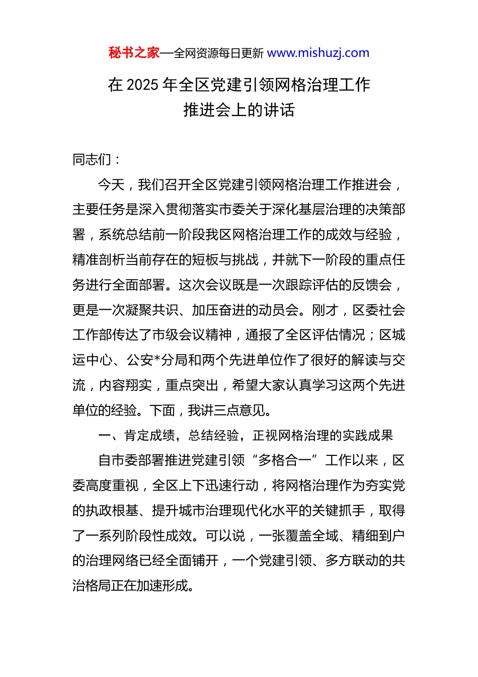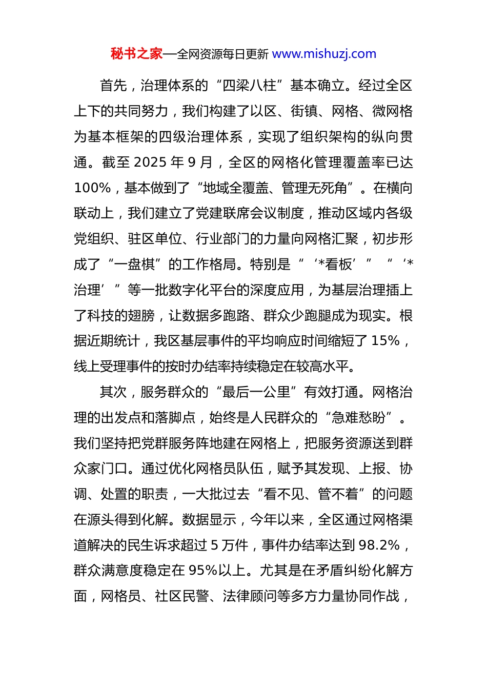 秘书之家—全网资源每日更新 www.mishuzj.com在 2025 年全区党建引领网格治理工作推进会上的讲话 同志们:今天,我们召开全区党建引领网格治理工作推进会,主要任务是深入贯彻落实市委关于深化基层治理的决策部署,系统总结前一阶段我区网格治理工作的成效与经验,精准剖析当前存在的短板与挑战,并就下一阶段的重点任务进行全面部署。这次会议既是一次跟踪评估的反馈会,更是一次凝聚共识、加压奋进的动员会。刚才,区委社会工作部传达了市级会议精神,通报了全区评估情况;区城运中心、公安*分局和两个先进单位作了很好的解读与交流,内容翔实,重点突出,希望大家认真学习这两个先进单位的经验。下面,我讲三点意见。一、肯定成绩,总结经验,正视网格治理的实践成果自市委部署推进党建引领“多格合一”工作以来,区委高度重视,全区上下迅速行动,将网格治理作为夯实党的执政根基、提升城市治理现代化水平的关键抓手,取得了一系列阶段性成效。可以说,一张覆盖全域、精细到户的治理网络已经全面铺开,一个党建引领、多方联动的共治格局正在加速形成。秘书之家—全网资源每日更新 www.mishuzj.com首先,治理体系的“四梁八柱”基本确立。经过全区上下的共同努力,我们构建了以区、街镇、网格、微网格为基本框架的四级治理体系,实现了组织架构的纵向贯通。截至 2025 年 9 月,全区的网格化管理覆盖率已达100%,基本做到了“地域全覆盖、管理无死角”。在横向联动上,我们建立了党建联席会议制度,推动区域内各级党组织、驻区单位、行业部门的力量向网格汇聚,初步形成了“一盘棋”的工作格局。特别是“‘*看板’”“‘*治理’”等一批数字化平台的深度应用,为基层治理插上了科技的翅膀,让数据多跑路、群众少跑腿成为现实。根据近期统计,我区基层事件的平均响应时间缩短了 15%,线上受理事件的按时办结率持续稳定在较高水平。其次,服务群众的“最后一公里”有效打通。网格治理的出发点和落脚点,始终是人民群众的“急难愁盼”。我们坚持把党群服务阵地建在网格上,把服务资源送到群众家门口。通过优化网格员队伍,赋予其发现、上报、协调、处置的职责,一大批过去“看不见、管不着”的问题在源头得到化解。数据显示,今年以来,全区通过网格渠道解决的民生诉求超过 5 万件,事件办结率达到 98.2%,群众满意度稳定在 95%以上。尤其是在矛盾纠纷化解方面,网格员、社区民警、法律顾问等多方力量协同作战,秘书之家—全网资源每日更新 www.mishuzj.com矛盾纠纷调解成功率超过 99%,有效维护了社区的和谐稳定,将大量不稳定因素化解在萌芽状态。再者,破解难题的“攻坚堡垒”作用日益凸显。基层治理中的许多难题,本质上是“三跨”问题,即跨部门、跨层级、跨区域的治理顽疾。这些问题单一部门难以解决,是长期困扰基层的“硬骨头”。我们以党建为引领,通过建立更高层级的协调机制,有力地破解了一批历史遗留问题。例如,针对部分老旧小区与新建商品房小区之间因停车资源不均引发的长期矛盾,*镇通过成立片区联合党组织,联动交警、城管、房管等多个部门,统筹规划停车位、引入市场化管理机制,成功化解了这一持续多年的难题。又如,针对*工业园区周边存在的跨区域偷倒垃圾问题,*街道牵头,联合周边街镇及环保、公安等部门,建立了联动巡查和联合执法机制,有效遏制了违法行为。据不完全统计,自启动“三跨”问题专项攻坚以来,我区相关领域的工单量同比下降超过 60%这充分证明了党建引领下的协同治理模式具有强大的生命力和战斗力。这些成绩的取得,根本在于市委的坚强领导,在于全区各级党组织和广大党员干部的辛勤付出。实践证明,坚持和加强党的全面领导,是做好网格治理工作的根本保证;坚持以人民为中心的发展思想,是网格治理获得群众秘书之家—全网资源每日更新 www.mishuzj.com支持的力量源泉;坚持系统观念和改革创新,是提升网格治理效能的关键路径。在肯定成绩的同时,我们更要清醒地看到工作中存在的不足和挑战,这也是我们今天会议需要重点研究和解决的问题。二、深化认识,对标对表,剖析网格治理的瓶颈问题在前期市级跟踪评估和我们自身组...