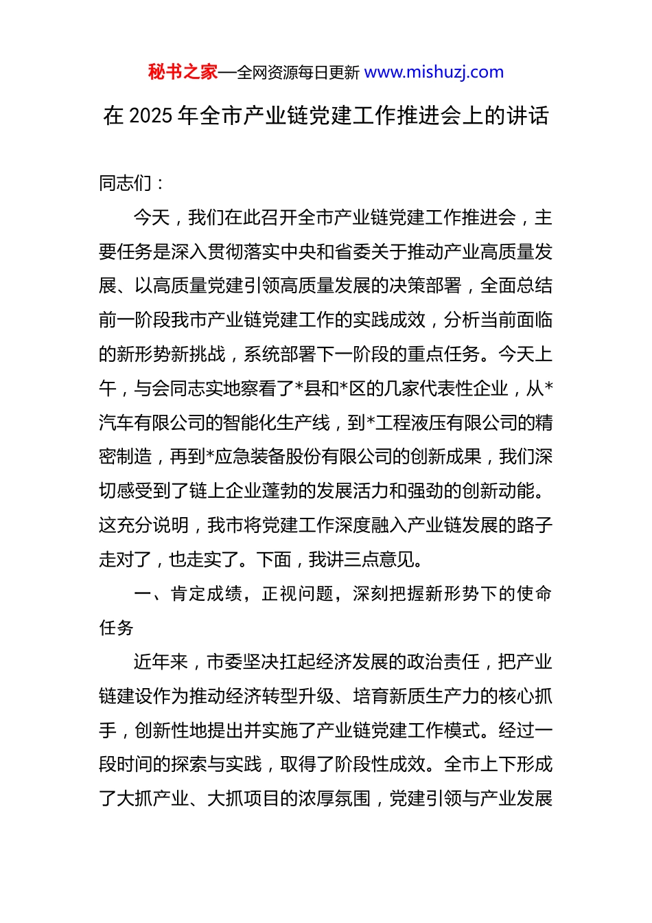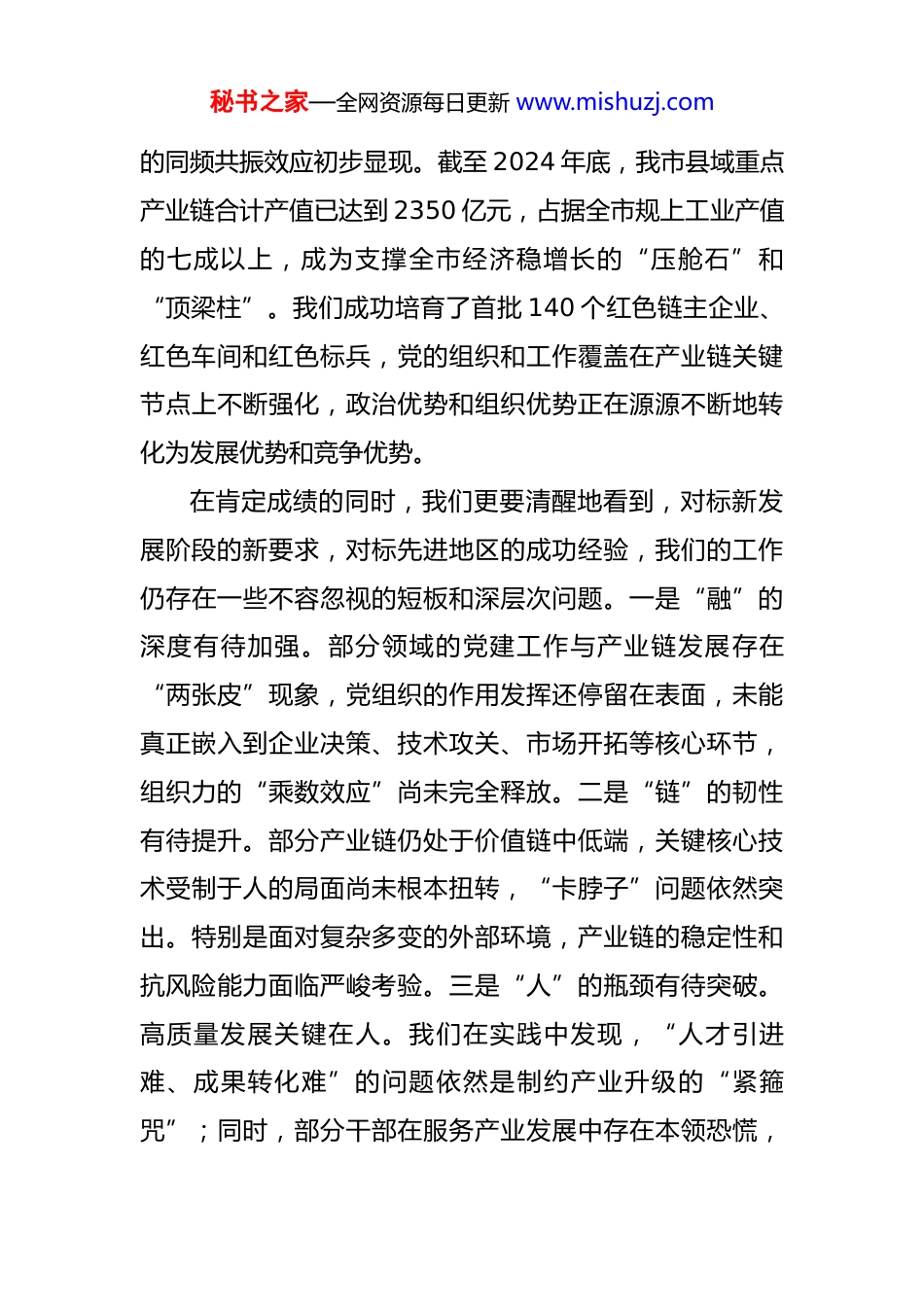 秘书之家—全网资源每日更新 www.mishuzj.com在 2025 年全市产业链党建工作推进会上的讲话 同志们:今天,我们在此召开全市产业链党建工作推进会,主要任务是深入贯彻落实中央和省委关于推动产业高质量发展、以高质量党建引领高质量发展的决策部署,全面总结前一阶段我市产业链党建工作的实践成效,分析当前面临的新形势新挑战,系统部署下一阶段的重点任务。今天上午,与会同志实地察看了*县和*区的几家代表性企业,从*汽车有限公司的智能化生产线,到*工程液压有限公司的精密制造,再到*应急装备股份有限公司的创新成果,我们深切感受到了链上企业蓬勃的发展活力和强劲的创新动能。这充分说明,我市将党建工作深度融入产业链发展的路子走对了,也走实了。下面,我讲三点意见。一、肯定成绩,正视问题,深刻把握新形势下的使命任务近年来,市委坚决扛起经济发展的政治责任,把产业链建设作为推动经济转型升级、培育新质生产力的核心抓手,创新性地提出并实施了产业链党建工作模式。经过一段时间的探索与实践,取得了阶段性成效。全市上下形成了大抓产业、大抓项目的浓厚氛围,党建引领与产业发展秘书之家—全网资源每日更新 www.mishuzj.com的同频共振效应初步显现。截至 2024 年底,我市县域重点产业链合计产值已达到 2350 亿元,占据全市规上工业产值的七成以上,成为支撑全市经济稳增长的“压舱石”和“顶梁柱”。我们成功培育了首批 140 个红色链主企业、红色车间和红色标兵,党的组织和工作覆盖在产业链关键节点上不断强化,政治优势和组织优势正在源源不断地转化为发展优势和竞争优势。在肯定成绩的同时,我们更要清醒地看到,对标新发展阶段的新要求,对标先进地区的成功经验,我们的工作仍存在一些不容忽视的短板和深层次问题。一是“融”的深度有待加强。部分领域的党建工作与产业链发展存在“两张皮”现象,党组织的作用发挥还停留在表面,未能真正嵌入到企业决策、技术攻关、市场开拓等核心环节,组织力的“乘数效应”尚未完全释放。二是“链”的韧性有待提升。部分产业链仍处于价值链中低端,关键核心技术受制于人的局面尚未根本扭转,“卡脖子”问题依然突出。特别是面对复杂多变的外部环境,产业链的稳定性和抗风险能力面临严峻考验。三是“人”的瓶颈有待突破。高质量发展关键在人。我们在实践中发现,“人才引进难、成果转化难”的问题依然是制约产业升级的“紧箍咒”;同时,部分干部在服务产业发展中存在本领恐慌,秘书之家—全网资源每日更新 www.mishuzj.com表现出“不敢为、不善为”的状态,专业能力和担当精神亟待提升。这些问题,是发展中的问题,也是前进中的挑战。当前,新一轮科技革命和产业变革加速演进,发展新质生产力成为推动高质量发展的内在要求和重要着力点。产业链作为承载新质生产力的基本单元,其现代化水平直接决定了区域经济的核心竞争力。因此,抓产业链党建,本质上就是抓住了新质生产力发展的“牛鼻子”。我们必须站在战略和全局的高度,深刻认识到建强产业链党建是巩固党的执政根基、实现经济高质量发展的必然要求,是应对激烈区域竞争、赢得未来发展主动权的战略抉择。全市各级党组织和广大党员干部要切实增强责任感和紧迫感,以更大的决心、更实的举措,推动产业链党建工作走深走实。二、聚焦“四链融合”,精准施策,全面激活高质量发展的新动能做好下一阶段工作,总的思路是:坚持以党的政治建设为统领,以提升产业链现代化水平为目标,以市委提出的“20 条措施”为总抓手着力深化组织聚链、人才强链、创新延链、干部铸链,推动组织链、人才链、创新链、干部链与产业链“四链”深度融合,为我市在 2027 年实现工业产业产值突破 4000 亿元、形成若干千亿级产业集群的宏秘书之家—全网资源每日更新 www.mishuzj.com伟目标提供坚强保障。第一,以“组织聚链”为核心,筑牢产业发展的坚强堡垒。党的领导是产业发展的“定盘星”。必须把党的组织体系深度嵌入产业链的每一个环节,让党旗在产业发展一线高高飘扬。一要压实县级党委一线指挥的领导责任。产业链的发展根植于县域。各县(市、区)党委要坚决扛起主体责任,...