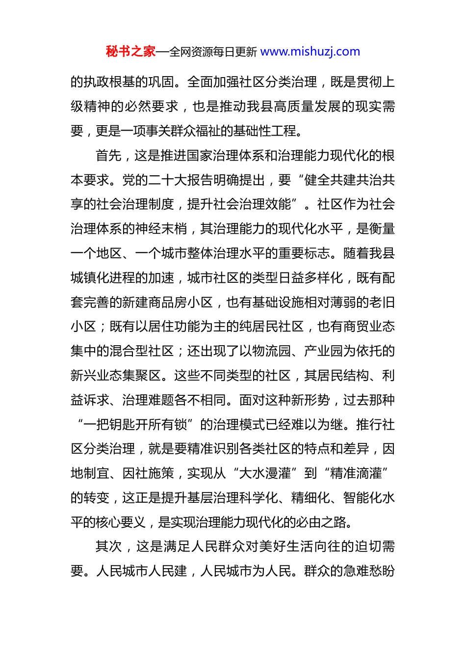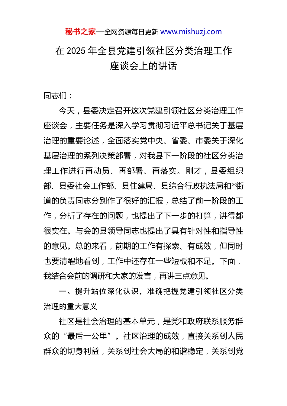 秘书之家—全网资源每日更新 www.mishuzj.com在 2025 年全县党建引领社区分类治理工作座谈会上的讲话 同志们:今天,县委决定召开这次党建引领社区分类治理工作座谈会,主要任务是深入学习贯彻习近平总书记关于基层治理的重要论述,全面落实党中央、省委、市委关于深化基层治理的系列决策部署,对我县下一阶段的社区分类治理工作进行再动员、再部署、再落实。刚才,县委组织部、县委社会工作部、县住建局、县综合行政执法局和*街道的负责同志分别作了很好的汇报,总结了前一阶段的工作,分析了存在的问题,也提出了下一步的打算,讲得都很实在。与会的县领导同志也提出了具有针对性和指导性的意见。总的来看,前期的工作有探索、有成效,但同时也要清醒地看到,工作中还存在一些短板和不足。下面,我结合会前的调研和大家的发言,再讲三点意见。一、提升站位深化认识,准确把握党建引领社区分类治理的重大意义社区是社会治理的基本单元,是党和政府联系服务群众的“最后一公里”。社区治理的成效,直接关系到人民群众的切身利益,关系到社会大局的和谐稳定,关系到党秘书之家—全网资源每日更新 www.mishuzj.com的执政根基的巩固。全面加强社区分类治理,既是贯彻上级精神的必然要求,也是推动我县高质量发展的现实需要,更是一项事关群众福祉的基础性工程。首先,这是推进国家治理体系和治理能力现代化的根本要求。党的二十大报告明确提出,要“健全共建共治共享的社会治理制度,提升社会治理效能”。社区作为社会治理体系的神经末梢,其治理能力的现代化水平,是衡量一个地区、一个城市整体治理水平的重要标志。随着我县城镇化进程的加速,城市社区的类型日益多样化,既有配套完善的新建商品房小区,也有基础设施相对薄弱的老旧小区;既有以居住功能为主的纯居民社区,也有商贸业态集中的混合型社区;还出现了以物流园、产业园为依托的新兴业态集聚区。这些不同类型的社区,其居民结构、利益诉求、治理难题各不相同。面对这种新形势,过去那种“一把钥匙开所有锁”的治理模式已经难以为继。推行社区分类治理,就是要精准识别各类社区的特点和差异,因地制宜、因社施策,实现从“大水漫灌”到“精准滴灌”的转变,这正是提升基层治理科学化、精细化、智能化水平的核心要义,是实现治理能力现代化的必由之路。其次,这是满足人民群众对美好生活向往的迫切需要。人民城市人民建,人民城市为人民。群众的急难愁盼秘书之家—全网资源每日更新 www.mishuzj.com问题,大量集中在社区。老旧小区的电梯安装、停车位规划问题,新建小区的物业服务质量问题,商圈周边社区的环境噪声、交通拥堵问题,以及流动人口的服务管理问题,都是群众天天面对的现实考量。解决好这些问题,就是践行以人民为中心的发展思想的具体体现。社区分类治理的出发点和落脚点,就是要精准对接各类社区居民的差异化需求。比如,在老年人口占比较高的社区,治理重点就要放在完善养老服务、建设日间照料中心、组织文化娱乐活动上;在年轻家庭和上班族集中的社区,则要侧重于优化托幼服务、共享空间打造和便捷生活服务的供给。只有通过分类施策,才能把服务做到群众的心坎上,不断增强群众的获得感、幸福感、安全感。再次,这是巩固党在城市执政基础的战略举措。党的工作最坚实的力量支撑在基层,经济社会发展和民生最突出的矛盾和问题也在基层。社区是党执政大厦的地基,地基牢固,大厦才能坚如磐石。通过党建引领,将党的组织体系、工作体系和服务体系深度融入社区治理的各方面和全过程,就是要确保党的领导像“神经中枢”一样,精准传导至每一个“神经末梢”。在分类治理中,针对不同类型的社区,党组织发挥作用的方式和侧重点也应有所不同。在组织健全的成熟社区,要强化党组织的政治引领和秘书之家—全网资源每日更新 www.mishuzj.com统筹协调功能;在新兴领域和“两新”组织集聚的社区,如我昨天调研的“司机之家”这样的地方,党建工作的重点就是抓好“两个覆盖”,把流动党员、口袋党员组织起来,把党的关怀和服务送到他们身边。通过这种精准化的党建工作,才能真正把社区党组织建设成为宣传党的主张、...