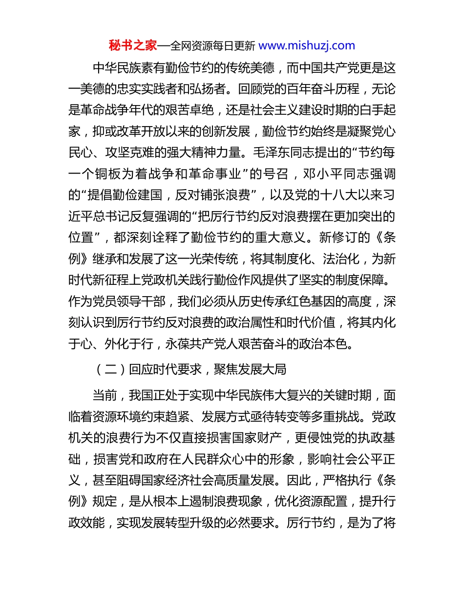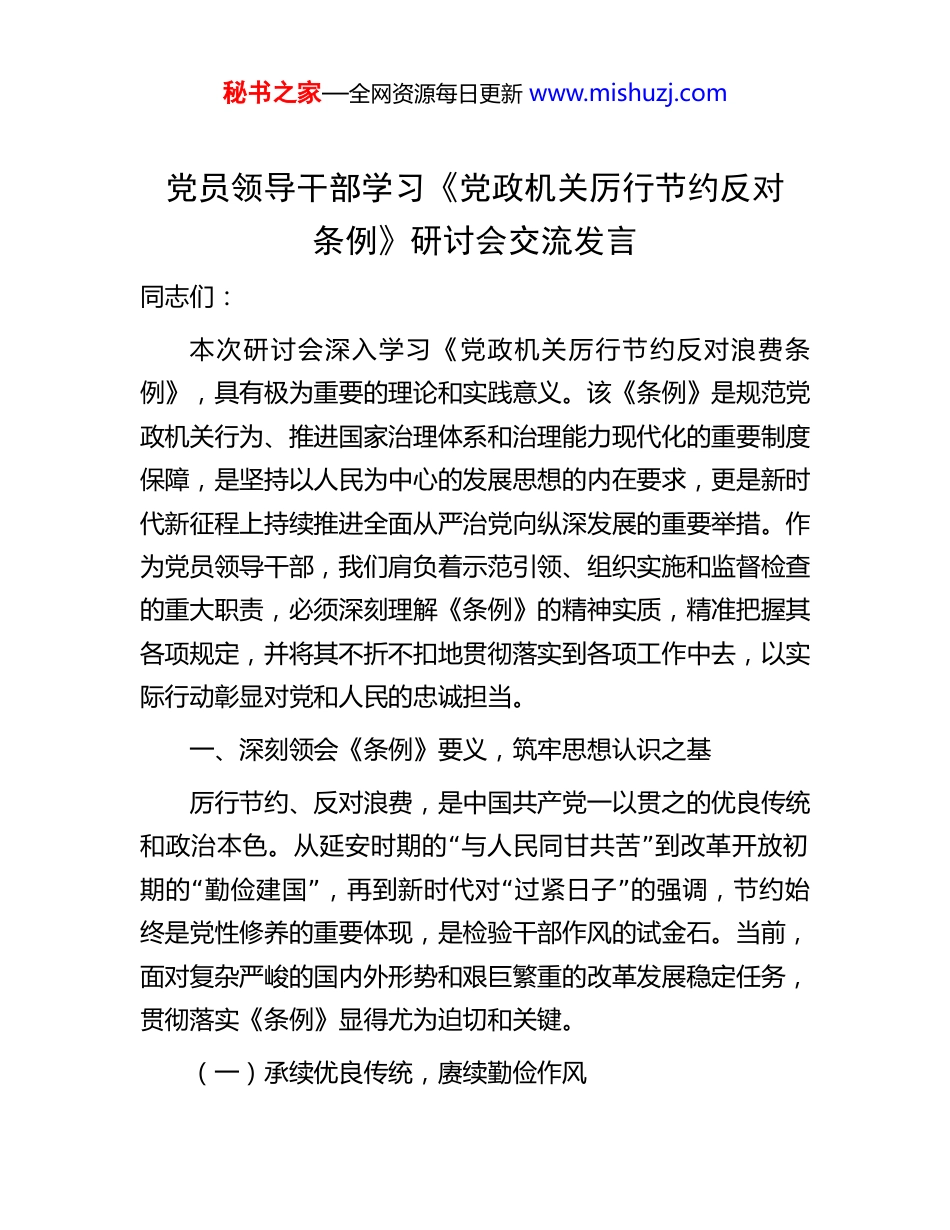 秘书之家—全网资源每日更新 www.mishuzj.com党员领导干部学习《党政机关厉行节约反对条例》研讨会交流发言同志们:本次研讨会深入学习《党政机关厉行节约反对浪费条例》,具有极为重要的理论和实践意义。该《条例》是规范党政机关行为、推进国家治理体系和治理能力现代化的重要制度保障,是坚持以人民为中心的发展思想的内在要求,更是新时代新征程上持续推进全面从严治党向纵深发展的重要举措。作为党员领导干部,我们肩负着示范引领、组织实施和监督检查的重大职责,必须深刻理解《条例》的精神实质,精准把握其各项规定,并将其不折不扣地贯彻落实到各项工作中去,以实际行动彰显对党和人民的忠诚担当。一、深刻领会《条例》要义,筑牢思想认识之基厉行节约、反对浪费,是中国共产党一以贯之的优良传统“”和政治本色。从延安时期的 与人民同甘共苦 到改革开放初“”“”期的 勤俭建国 ,再到新时代对 过紧日子 的强调,节约始终是党性修养的重要体现,是检验干部作风的试金石。当前,面对复杂严峻的国内外形势和艰巨繁重的改革发展稳定任务,贯彻落实《条例》显得尤为迫切和关键。(一)承续优良传统,赓续勤俭作风秘书之家—全网资源每日更新 www.mishuzj.com中华民族素有勤俭节约的传统美德,而中国共产党更是这一美德的忠实实践者和弘扬者。回顾党的百年奋斗历程,无论是革命战争年代的艰苦卓绝,还是社会主义建设时期的白手起家,抑或改革开放以来的创新发展,勤俭节约始终是凝聚党心“民心、攻坚克难的强大精神力量。毛泽东同志提出的 节约每”一个铜板为着战争和革命事业 的号召,邓小平同志强调“”的 提倡勤俭建国,反对铺张浪费 ,以及党的十八大以来习“近平总书记反复强调的 把厉行节约反对浪费摆在更加突出的”位置 ,都深刻诠释了勤俭节约的重大意义。新修订的《条例》继承和发展了这一光荣传统,将其制度化、法治化,为新时代新征程上党政机关践行勤俭作风提供了坚实的制度保障。作为党员领导干部,我们必须从历史传承红色基因的高度,深刻认识到厉行节约反对浪费的政治属性和时代价值,将其内化于心、外化于行,永葆共产党人艰苦奋斗的政治本色。(二)回应时代要求,聚焦发展大局当前,我国正处于实现中华民族伟大复兴的关键时期,面临着资源环境约束趋紧、发展方式亟待转变等多重挑战。党政机关的浪费行为不仅直接损害国家财产,更侵蚀党的执政基础,损害党和政府在人民群众心中的形象,影响社会公平正义,甚至阻碍国家经济社会高质量发展。因此,严格执行《条例》规定,是从根本上遏制浪费现象,优化资源配置,提升行政效能,实现发展转型升级的必然要求。厉行节约,是为了将秘书之家—全网资源每日更新 www.mishuzj.com有限的资源和财力投入到教育、医疗、科技创新、生态环保等民生福祉和发展大计上来,确保公共资金使用效益最大化,真正做到取之于民、用之于民。这不仅是作风建设问题,更是关系到党和国家事业兴衰成败的重大政治问题,是落实新发展理念,推动高质量发展的内在支撑。(三)强化底线思维,严守纪律红线《条例》的出台,将厉行节约反对浪费提升到党内法规的高度,明确了党政机关及其工作人员在公务活动中的行为边界和纪律底线。它不仅是行政管理规范,更是纪律戒尺。对浪费行为的规制,不再仅仅停留在道德倡导层面,而是上升到依规治党、依法行政的严肃范畴。任何形式的铺张浪费,都不仅仅是简单的资金消耗,更是对党纪国法的漠视,对人民群众感情的伤害。对浪费行为的严肃查处,也体现了我们党全面从严治党、从严治吏的坚定决心。党员领导干部必须牢固树立底线思维和红线意识,时刻绷紧纪律这根弦,将《条例》的各项规定“”视为不可逾越的 高压线 ,自觉对照检查,做到不越雷池、不踩红线,真正把纪律和规矩挺在前面,以实际行动维护《条例》的严肃性和权威性。二、聚焦关键领域和环节,严格执行《条例》规定《条例》针对党政机关公务活动中的各项浪费行为,作出了全面、具体、可操作的规定。作为领导干部,我们必须对照秘书之家—全网资源每日更新 www.mishuzj.com《条例》要求,对号入座,认真审视自身在相关领域的行...