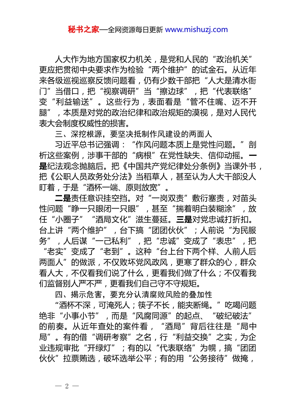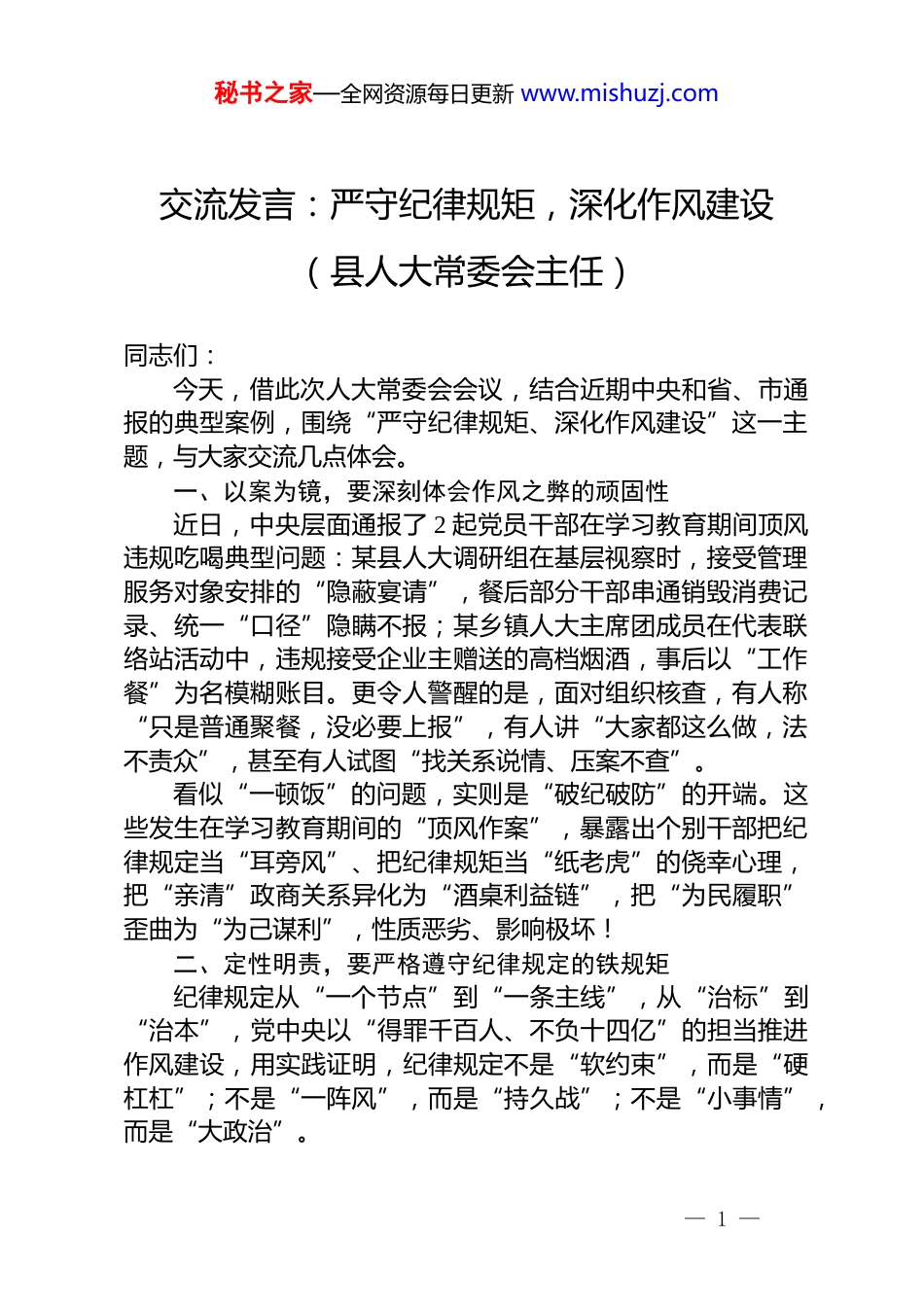 秘书之家—全网资源每日更新 www.mishuzj.com交流发言:严守纪律规矩,深化作风建设(县人大常委会主任)同志们:今天,借此次人大常委会会议,结合近期中央和省、市通报的典型案例,围绕“严守纪律规矩、深化作风建设”这一主题,与大家交流几点体会。一、以案为镜,要深刻体会作风之弊的顽固性近日,中央层面通报了 2 起党员干部在学习教育期间顶风违规吃喝典型问题:某县人大调研组在基层视察时,接受管理服务对象安排的“隐蔽宴请”,餐后部分干部串通销毁消费记录、统一“口径”隐瞒不报;某乡镇人大主席团成员在代表联络站活动中,违规接受企业主赠送的高档烟酒,事后以“工作餐”为名模糊账目。更令人警醒的是,面对组织核查,有人称“只是普通聚餐,没必要上报”,有人讲“大家都这么做,法不责众”,甚至有人试图“找关系说情、压案不查”。看似“一顿饭”的问题,实则是“破纪破防”的开端。这些发生在学习教育期间的“顶风作案”,暴露出个别干部把纪律规定当“耳旁风”、把纪律规矩当“纸老虎”的侥幸心理,把“亲清”政商关系异化为“酒桌利益链”,把“为民履职”歪曲为“为己谋利”,性质恶劣、影响极坏!二、定性明责,要严格遵守纪律规定的铁规矩纪律规定从“一个节点”到“一条主线”,从“治标”到“治本”,党中央以“得罪千百人、不负十四亿”的担当推进作风建设,用实践证明,纪律规定不是“软约束”,而是“硬杠杠”;不是“一阵风”,而是“持久战”;不是“小事情”,而是“大政治”。 — 1 —秘书之家—全网资源每日更新 www.mishuzj.com人大作为地方国家权力机关,是党和人民的“政治机关”更应把贯彻中央要求作为检验“两个维护”的试金石。从近年来各级巡视巡察反馈问题看,仍有少数干部把“人大是清水衙门”当借口,把“视察调研”当“擦边球”,把“代表联络”变“利益输送”。这些行为,表面看是“管不住嘴、迈不开腿”,本质是对党的政治纪律和政治规矩的漠视,是对人民代表大会制度权威性的损害。三、深挖根源,要坚决抵制作风建设的两面人习近平总书记强调:“作风问题本质上是党性问题。”剖析这些案例,涉事干部的“病根”在党性缺失、信仰动摇。一是纪法观念抛脑后。把《中国共产党纪律处分条例》当课外书,把《公职人员政务处分法》当稻草人,甚至认为人大干部没人盯着,于是“酒杯一端、原则放宽”。二是责任意识挂空挡。对“一岗双责”敷衍塞责,对苗头性问题“睁一只眼闭一只眼”,甚至“揣着明白装糊涂”,放任“小圈子”“酒局文化”滋生蔓延。三是对党忠诚打折扣。台上讲“两个维护”,台下搞“团团伙伙”;人前说“为民服务”,人后谋“一己私利”,把“忠诚”变成了“表忠”,把“老实”变成了“老到”。这种“台上台下两个样、人前人后两面人”的做派,不仅败坏党风政风,更寒了群众的心,群众看人大,不仅看我们说了什么,更看我们做了什么;不仅看我们监督别人严不严,更看我们自己守不守规矩。四、揭示危害,要充分认清腐败风险的叠加性“酒杯不深,可淹死人;筷子不长,能夹断绳。”吃喝问题绝非“小事小节”,而是“风腐同源”的起点、“破纪破法”的前奏。从近年查处的案件看,“酒局”背后往往是“局中局”。有的借“调研考察”之名,行“利益交换”之实,为企业违规审批“开绿灯”;有的以“代表联络”为幌,搞“团团伙伙”拉票贿选,破坏选举公平;有的用“公务接待”做掩,— 2 —秘书之家—全网资源每日更新 www.mishuzj.com套取财政资金填“私囊”,甚至挪用民生项目款“买单”。这些行为,本质是“舌尖上的腐败”“酒杯里的权力寻租”,是把公权力异化为“私权”,把“为民用权”变成“为己用权”。如果不及时纠治,小错就会酿成大祸,小问题就会演变成“大塌方”。五、亮明态度,要坚定拥护从严治党的全面性同志们,党纪面前没有“特殊群体”,人大干部更没有“例外权限”。对顶风违纪、表里不一者,必须坚持“三个不放过”。一是问题查不清不放过。对违规吃喝、利益输送等行为,既要查“谁吃了”“谁请了”,更要查“背后有什么交易”“牵扯到哪些人”,深挖背后的“关系网”“保护伞”。二是处理不严厉...