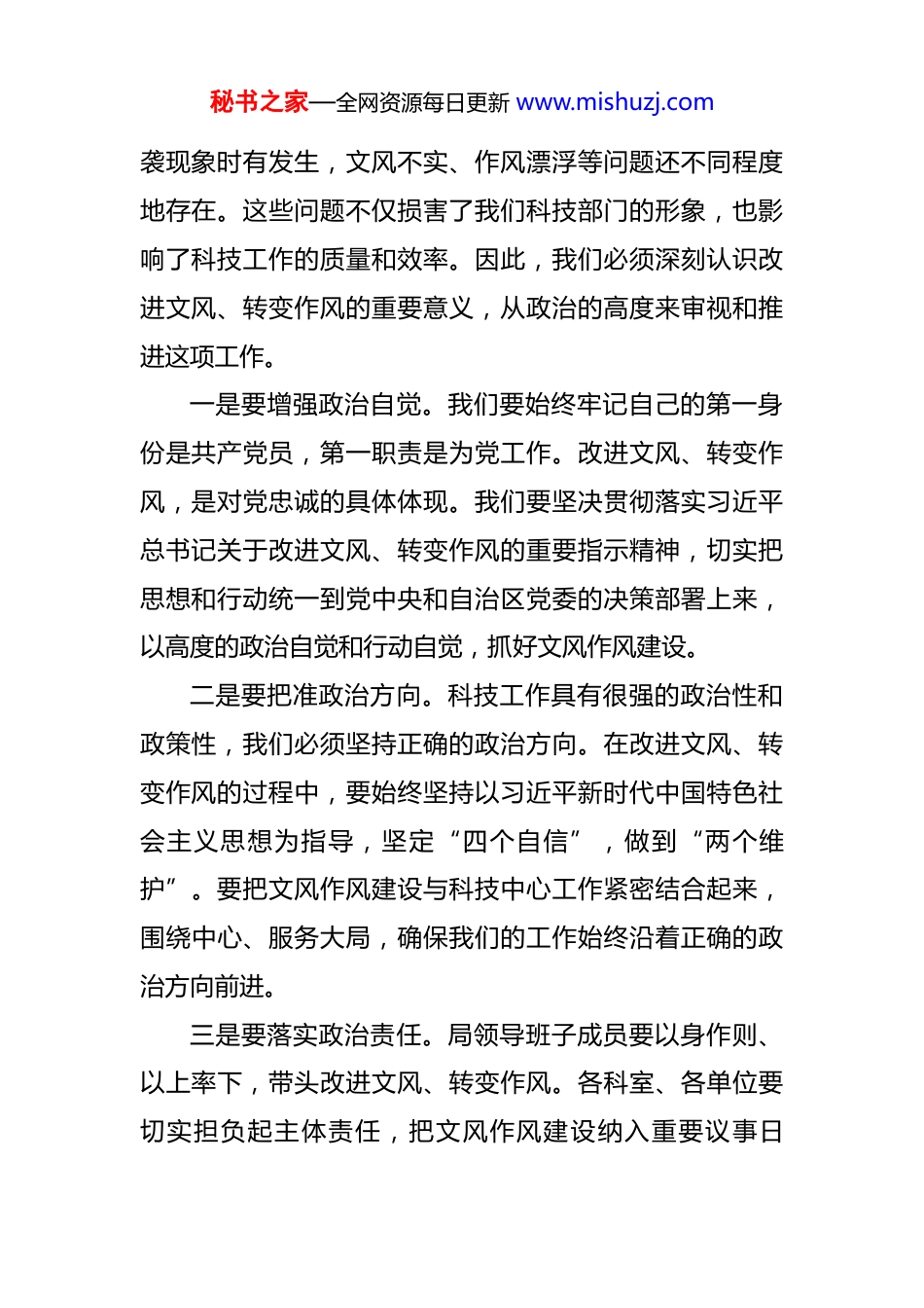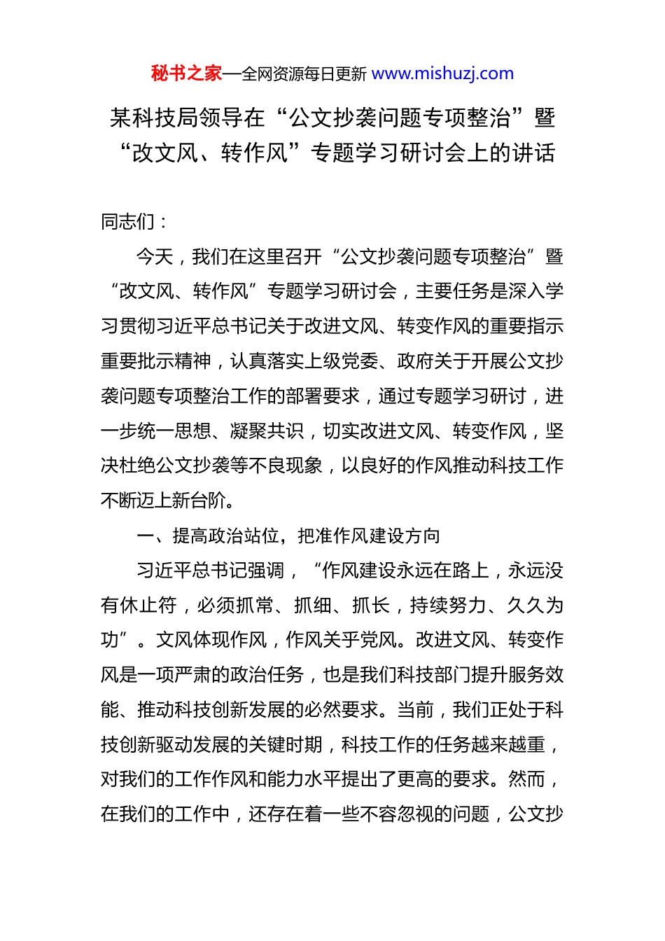 秘书之家—全网资源每日更新 www.mishuzj.com某科技局领导在“公文抄袭问题专项整治”暨“改文风、转作风”专题学习研讨会上的讲话 同志们:今天,我们在这里召开“公文抄袭问题专项整治”暨“改文风、转作风”专题学习研讨会,主要任务是深入学习贯彻习近平总书记关于改进文风、转变作风的重要指示重要批示精神,认真落实上级党委、政府关于开展公文抄袭问题专项整治工作的部署要求,通过专题学习研讨,进一步统一思想、凝聚共识,切实改进文风、转变作风,坚决杜绝公文抄袭等不良现象,以良好的作风推动科技工作不断迈上新台阶。一、提高政治站位,把准作风建设方向习近平总书记强调,“作风建设永远在路上,永远没有休止符,必须抓常、抓细、抓长,持续努力、久久为功”。文风体现作风,作风关乎党风。改进文风、转变作风是一项严肃的政治任务,也是我们科技部门提升服务效能、推动科技创新发展的必然要求。当前,我们正处于科技创新驱动发展的关键时期,科技工作的任务越来越重,对我们的工作作风和能力水平提出了更高的要求。然而,在我们的工作中,还存在着一些不容忽视的问题,公文抄秘书之家—全网资源每日更新 www.mishuzj.com袭现象时有发生,文风不实、作风漂浮等问题还不同程度地存在。这些问题不仅损害了我们科技部门的形象,也影响了科技工作的质量和效率。因此,我们必须深刻认识改进文风、转变作风的重要意义,从政治的高度来审视和推进这项工作。一是要增强政治自觉。我们要始终牢记自己的第一身份是共产党员,第一职责是为党工作。改进文风、转变作风,是对党忠诚的具体体现。我们要坚决贯彻落实习近平总书记关于改进文风、转变作风的重要指示精神,切实把思想和行动统一到党中央和自治区党委的决策部署上来,以高度的政治自觉和行动自觉,抓好文风作风建设。二是要把准政治方向。科技工作具有很强的政治性和政策性,我们必须坚持正确的政治方向。在改进文风、转变作风的过程中,要始终坚持以习近平新时代中国特色社会主义思想为指导,坚定“四个自信”,做到“两个维护”。要把文风作风建设与科技中心工作紧密结合起来,围绕中心、服务大局,确保我们的工作始终沿着正确的政治方向前进。三是要落实政治责任。局领导班子成员要以身作则、以上率下,带头改进文风、转变作风。各科室、各单位要切实担负起主体责任,把文风作风建设纳入重要议事日秘书之家—全网资源每日更新 www.mishuzj.com程,明确责任分工,强化督促检查,形成一级抓一级、层层抓落实的工作格局。全体干部职工要增强责任意识,认真履行自己的工作职责,从每一篇公文撰写、每一项工作任务落实做起,切实改进文风、转变作风。二、强化理论学习,筑牢作风改进基础习近平总书记指出,“中国共产党人依靠学习走到今天,也必然要依靠学习走向未来。”加强理论学习是改进文风、转变作风的基础和前提。只有不断加强理论学习,才能提高我们的政治素养和业务能力,才能使我们的文风更加清新、作风更加务实。我们这次会议集中学习了习近平总书记关于改进文风、转变作风的重要论述,以及相关的制度文件,这只是一个开始。接下来,我们要进一步强化理论学习,建立常态化的学习机制,不断提高学习的质量和效果。一是要系统学习党中央和自治区党委关于作风建设、文风改进的重要论述和精神。要原原本本、原汁原味地学习习近平总书记的重要讲话精神,深刻领会其精神实质和丰富内涵。要深入学习自治区党委关于作风建设的部署要求,准确把握工作重点和方向。通过系统学习,切实增强我们改进文风、转变作风的思想自觉和行动自觉。二是要紧密结合科技工作实际开展针对性学习。科技秘书之家—全网资源每日更新 www.mishuzj.com工作有其自身的特点和规律,我们要结合实际,有针对性地学习相关的科技政策、法律法规和业务知识。要通过学习,不断提高我们的业务水平和工作能力,使我们能够更好地适应科技创新发展的需要。同时,要把学习与解决实际问题结合起来,针对我们在文风作风方面存在的问题,以及科技工作中的难点、热点问题,深入开展调查研究,提出切实可行的解决办法。三是要坚持学用结合、知行合一。学习的...