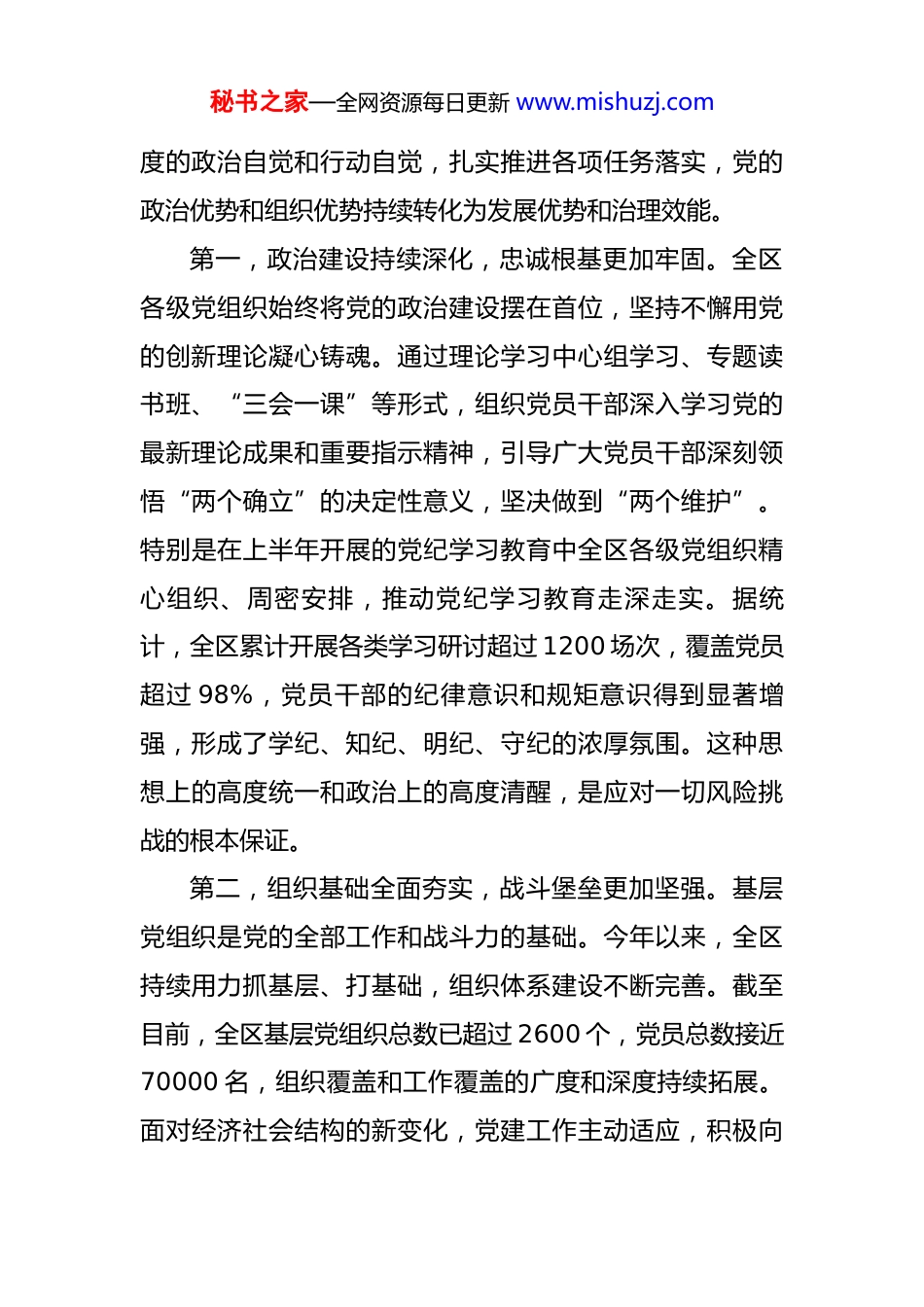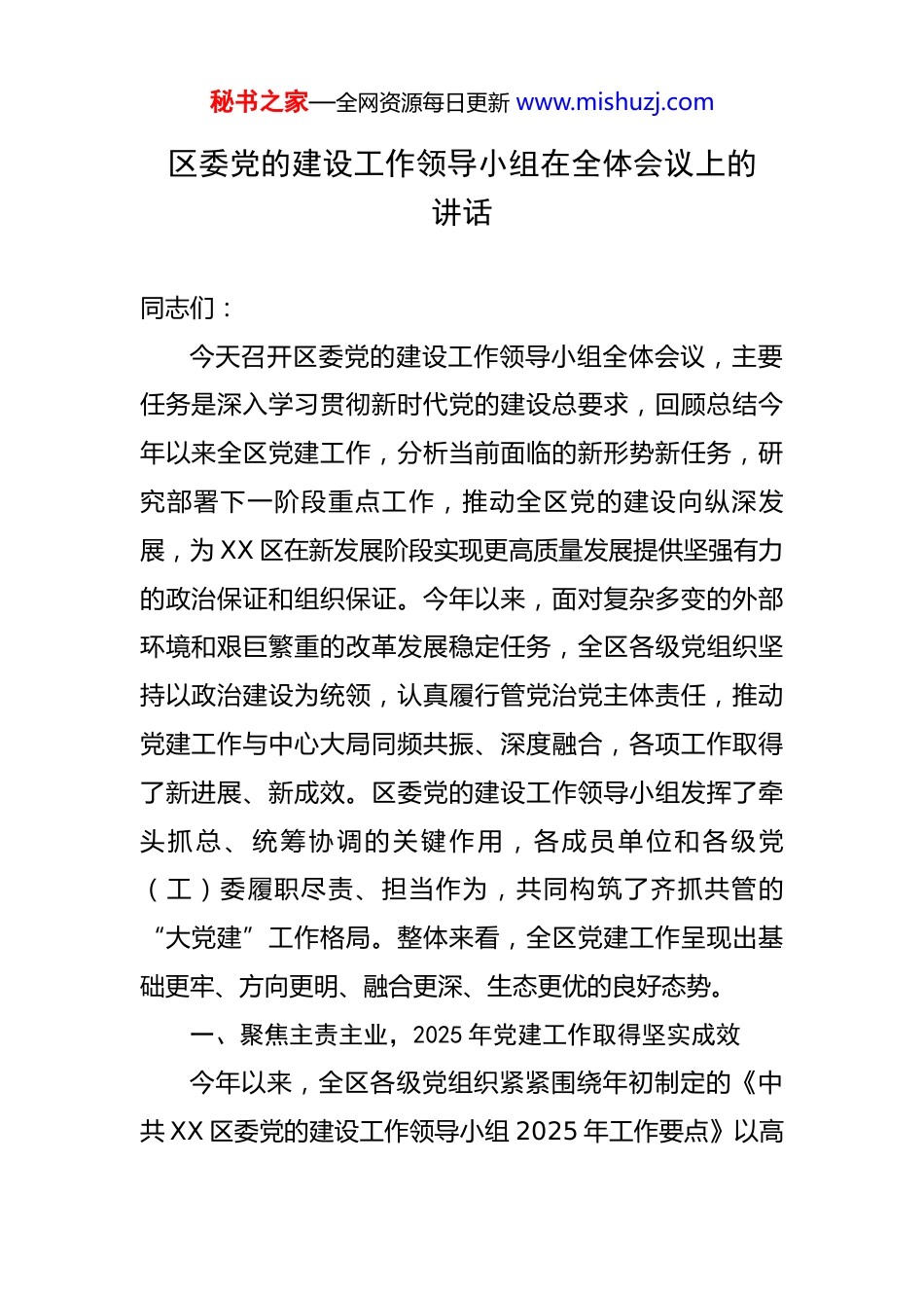 秘书之家—全网资源每日更新 www.mishuzj.com区委党的建设工作领导小组在全体会议上的讲话 同志们:今天召开区委党的建设工作领导小组全体会议,主要任务是深入学习贯彻新时代党的建设总要求,回顾总结今年以来全区党建工作,分析当前面临的新形势新任务,研究部署下一阶段重点工作,推动全区党的建设向纵深发展,为 XX 区在新发展阶段实现更高质量发展提供坚强有力的政治保证和组织保证。今年以来,面对复杂多变的外部环境和艰巨繁重的改革发展稳定任务,全区各级党组织坚持以政治建设为统领,认真履行管党治党主体责任,推动党建工作与中心大局同频共振、深度融合,各项工作取得了新进展、新成效。区委党的建设工作领导小组发挥了牵头抓总、统筹协调的关键作用,各成员单位和各级党(工)委履职尽责、担当作为,共同构筑了齐抓共管的“大党建”工作格局。整体来看,全区党建工作呈现出基础更牢、方向更明、融合更深、生态更优的良好态势。一、聚焦主责主业,2025 年党建工作取得坚实成效今年以来,全区各级党组织紧紧围绕年初制定的《中共 XX 区委党的建设工作领导小组 2025 年工作要点》以高秘书之家—全网资源每日更新 www.mishuzj.com度的政治自觉和行动自觉,扎实推进各项任务落实,党的政治优势和组织优势持续转化为发展优势和治理效能。第一,政治建设持续深化,忠诚根基更加牢固。全区各级党组织始终将党的政治建设摆在首位,坚持不懈用党的创新理论凝心铸魂。通过理论学习中心组学习、专题读书班、“三会一课”等形式,组织党员干部深入学习党的最新理论成果和重要指示精神,引导广大党员干部深刻领悟“两个确立”的决定性意义,坚决做到“两个维护”。特别是在上半年开展的党纪学习教育中全区各级党组织精心组织、周密安排,推动党纪学习教育走深走实。据统计,全区累计开展各类学习研讨超过 1200 场次,覆盖党员超过 98%,党员干部的纪律意识和规矩意识得到显著增强,形成了学纪、知纪、明纪、守纪的浓厚氛围。这种思想上的高度统一和政治上的高度清醒,是应对一切风险挑战的根本保证。第二,组织基础全面夯实,战斗堡垒更加坚强。基层党组织是党的全部工作和战斗力的基础。今年以来,全区持续用力抓基层、打基础,组织体系建设不断完善。截至目前,全区基层党组织总数已超过 2600 个,党员总数接近70000 名,组织覆盖和工作覆盖的广度和深度持续拓展。面对经济社会结构的新变化,党建工作主动适应,积极向秘书之家—全网资源每日更新 www.mishuzj.com新兴领域延伸。在 XX 物流产业园,通过建立“枢纽型”联合党委,将分散在 120 余家物流企业、拥有 400 余名流动党员的群体有效组织起来,解决了以往组织难覆盖、党员难管理、作用难发挥的问题,实现了党建引领下的行业规范和高效运转。在基层治理层面,“党建引领、多方参与”的模式不断深化。XX 街道 XX 社区针对老旧小区停车难、管理乱的问题,成立了由社区党委牵头,物业、业委会、党员楼门长、居民代表共同参与的“红色议事会”,通过民主协商,制定了小区停车管理公约,并划设了“党员先锋示范车位”,有效化解了困扰居民多年的矛盾。这些实践证明,把党的组织优势转化为治理效能,是破解基层治理难题的“金钥匙”。第三,干部队伍建设优化,担当精神更加彰显。事业成败,关键在人。全区坚持新时代好干部标准,树立重实干、重实绩、重担当的鲜明用人导向。今年以来,共选派了 80 余名优秀年轻干部到招商引资、项目建设、信访维稳等一线岗位进行实践锻炼,让他们在急难险重任务中经风雨、见世面、壮筋骨。同时,干部教育培训的精准性和实效性不断提升。区委党校围绕 XX 区发展战略,开设了“数字经济与产业升级”“城市精细化治理”等专题培训班,累计培训干部超过 3000 人次,总时长超过 15 万学时。通秘书之家—全网资源每日更新 www.mishuzj.com过系统化的培养和锻炼,一批想干事、能干事、干成事的干部脱颖而出,全区干部队伍的专业能力和综合素质得到整体提升,干事创业的精气神更加饱满。第四,党建业务深度融合,引领作用更加凸显。党建工作如果脱离了中心工作,就会成...