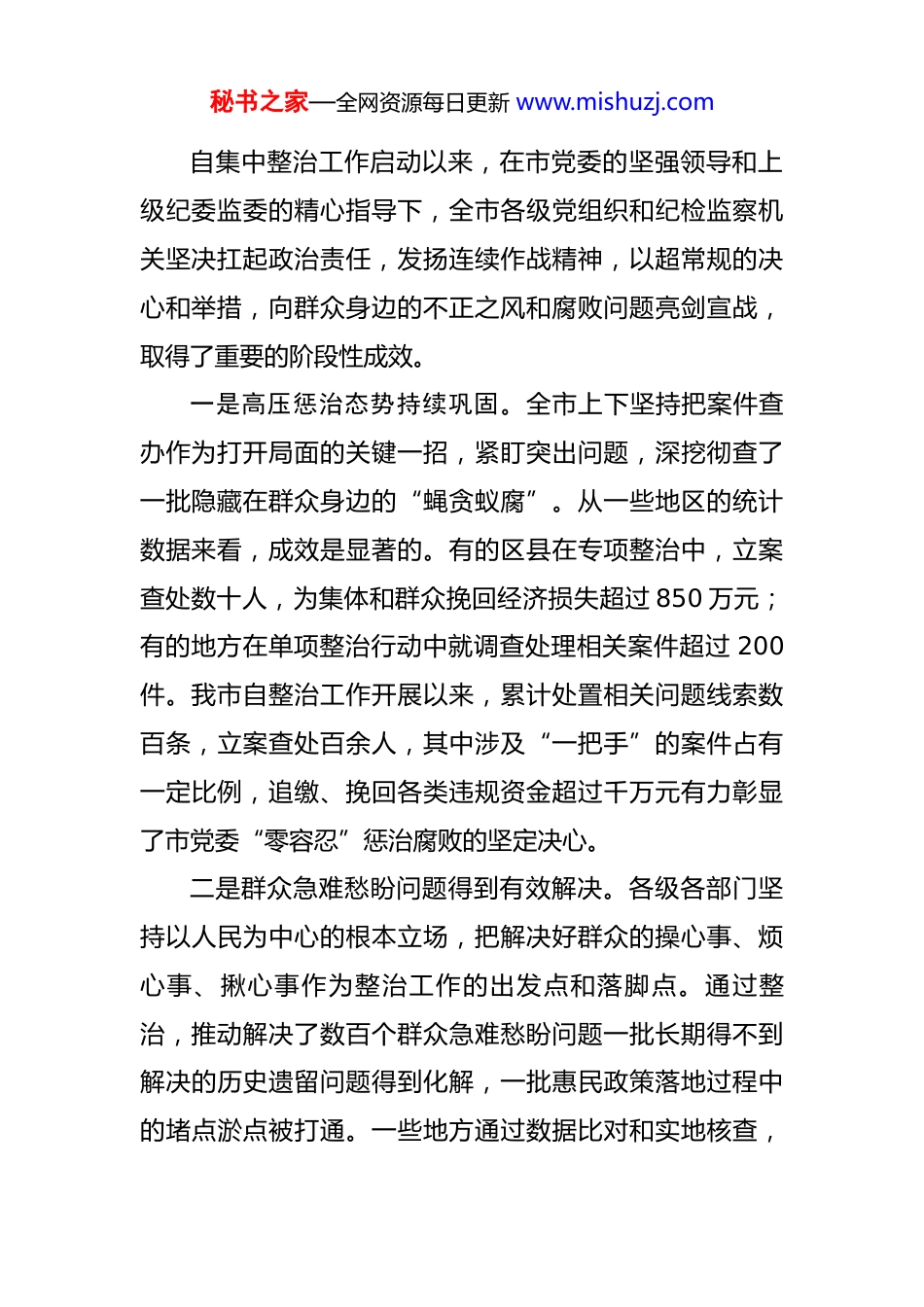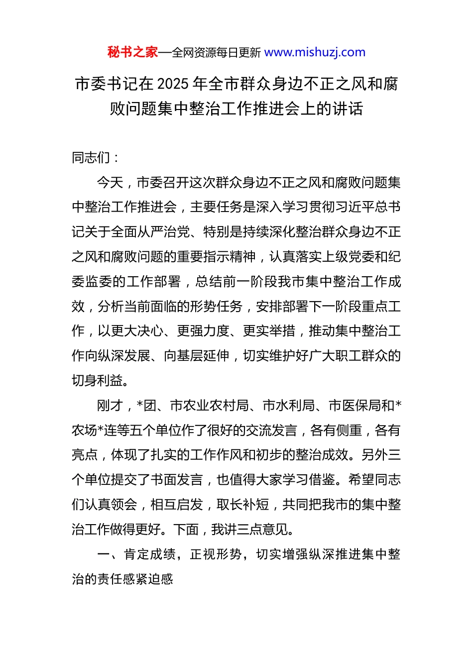 秘书之家—全网资源每日更新 www.mishuzj.com市委书记在 2025 年全市群众身边不正之风和腐败问题集中整治工作推进会上的讲话 同志们:今天,市委召开这次群众身边不正之风和腐败问题集中整治工作推进会,主要任务是深入学习贯彻习近平总书记关于全面从严治党、特别是持续深化整治群众身边不正之风和腐败问题的重要指示精神,认真落实上级党委和纪委监委的工作部署,总结前一阶段我市集中整治工作成效,分析当前面临的形势任务,安排部署下一阶段重点工作,以更大决心、更强力度、更实举措,推动集中整治工作向纵深发展、向基层延伸,切实维护好广大职工群众的切身利益。刚才,*团、市农业农村局、市水利局、市医保局和*农场*连等五个单位作了很好的交流发言,各有侧重,各有亮点,体现了扎实的工作作风和初步的整治成效。另外三个单位提交了书面发言,也值得大家学习借鉴。希望同志们认真领会,相互启发,取长补短,共同把我市的集中整治工作做得更好。下面,我讲三点意见。一、肯定成绩,正视形势,切实增强纵深推进集中整治的责任感紧迫感秘书之家—全网资源每日更新 www.mishuzj.com自集中整治工作启动以来,在市党委的坚强领导和上级纪委监委的精心指导下,全市各级党组织和纪检监察机关坚决扛起政治责任,发扬连续作战精神,以超常规的决心和举措,向群众身边的不正之风和腐败问题亮剑宣战,取得了重要的阶段性成效。一是高压惩治态势持续巩固。全市上下坚持把案件查办作为打开局面的关键一招,紧盯突出问题,深挖彻查了一批隐藏在群众身边的“蝇贪蚁腐”。从一些地区的统计数据来看,成效是显著的。有的区县在专项整治中,立案查处数十人,为集体和群众挽回经济损失超过 850 万元;有的地方在单项整治行动中就调查处理相关案件超过 200件。我市自整治工作开展以来,累计处置相关问题线索数百条,立案查处百余人,其中涉及“一把手”的案件占有一定比例,追缴、挽回各类违规资金超过千万元有力彰显了市党委“零容忍”惩治腐败的坚定决心。二是群众急难愁盼问题得到有效解决。各级各部门坚持以人民为中心的根本立场,把解决好群众的操心事、烦心事、揪心事作为整治工作的出发点和落脚点。通过整治,推动解决了数百个群众急难愁盼问题一批长期得不到解决的历史遗留问题得到化解,一批惠民政策落地过程中的堵点淤点被打通。一些地方通过数据比对和实地核查,秘书之家—全网资源每日更新 www.mishuzj.com实现了问题整改率和数据核查率双双达到 100%,让职工群众切身感受到了公平正义就在身边,党和政府的温暖就在身边。三是基层治理效能得到明显提升。坚持标本兼治、系统施治,把“当下改”与“长久立”结合起来,在解决具体问题的同时,着力堵塞制度漏洞、规范权力运行。整治工作开展以来,全市各级各部门针对暴露出的问题,新建和修订了一批重点领域的监管制度,例如一些地方在农村“三资”管理专项整治后,不仅整改完成率达到 100%,还追回了资金,并完善了相关管理制度。通过以案促改、以案促治,推动相关职能部门整改问题近两百个,一些领域的整改完成率超过了 90%,基层治理体系和治理能力现代化水平得到了新的提升。在肯定成绩的同时,也必须清醒地认识到,我市群众身边不正之风和腐败问题的形势依然严峻复杂,存量尚未清底,增量仍在发生,集中整治工作还存在一些不容忽视的问题。有的单位思想认识不到位,存在“松口气、歇歇脚”的懈怠情绪;有的地方整治重点不够突出,存在“撒胡椒面”现象,没有形成“拳头”;有的案件查办力度不足,攻坚克难的斗争精神有所弱化;有的制度建设滞后,标本兼治的长效机制尚未完全形成。这些问题,严重影响秘书之家—全网资源每日更新 www.mishuzj.com集中整治工作的成效和质量,必须引起高度警惕,下大力气加以解决。习近平总书记强调,“全面从严治党永远在路上,党的自我革命永远在路上”。我们必须横下一条心,力度不减、尺度不松、标准不降,以打攻坚战、持久战的清醒和坚定,把集中整治强力推向纵深。二、聚焦重点,精准发力,以攻坚突破带动集中整治工作全局打蛇打七寸,做事抓关键。深化集中整治,必须在精准上做文...