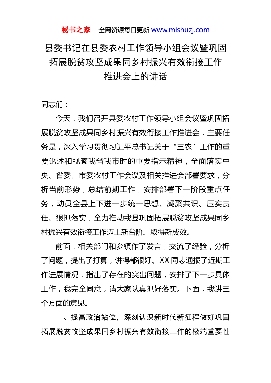 秘书之家—全网资源每日更新 www.mishuzj.com县委书记在县委农村工作领导小组会议暨巩固拓展脱贫攻坚成果同乡村振兴有效衔接工作推进会上的讲话 同志们:今天,我们召开县委农村工作领导小组会议暨巩固拓展脱贫攻坚成果同乡村振兴有效衔接工作推进会,主要任务是,深入学习贯彻习近平总书记关于“三农”工作的重要论述和视察我省我市时的重要指示精神,全面落实中央、省委、市委农村工作会议及相关推进会部署要求,分析当前形势,总结前期工作,安排部署下一阶段重点任务,动员全县上下进一步统一思想、凝聚共识、压实责任、狠抓落实,全力推动我县巩固拓展脱贫攻坚成果同乡村振兴有效衔接工作迈上新台阶、取得新成效。前面,相关部门和乡镇作了发言,交流了经验,分析了问题,提出了打算,讲得都很好。XX 同志通报了近期工作进展情况,指出了存在的突出问题,安排了下一步具体工作,我完全同意,请大家认真抓好落实。下面,我讲三个方面的意见。一、提高政治站位,深刻认识新时代新征程做好巩固拓展脱贫攻坚成果同乡村振兴有效衔接工作的极端重要性秘书之家—全网资源每日更新 www.mishuzj.com和紧迫性“三农”工作是治国安邦的重中之重,巩固拓展脱贫攻坚成果是全面推进乡村振兴的底线任务。我们必须站在坚定拥护“两个确立”、坚决做到“两个维护”的政治高度,深刻认识这项工作的重大意义,切实增强责任感、使命感和紧迫感。(一)这是必须完成好的重大政治任务。习近平总书记多次强调,脱贫摘帽不是终点,而是新生活、新奋斗的起点。要切实做好巩固拓展脱贫攻坚成果同乡村振兴有效衔接各项工作,让脱贫基础更加稳固、成效更可持续。党中央、国务院和省委、市委对此项工作高度重视,作出系列部署,提出明确要求。这既是发展任务,更是政治责任。我们必须不折不扣地贯彻落实好中央和省委、市委的决策部署,把做好有效衔接工作作为检验我们政治判断力、政治领悟力、政治执行力的“试金石”,确保工作方向不偏、力度不减、标准不降,以实际行动和成效体现对党忠诚。(二)这是推动我县高质量发展的内在要求。我县作为传统农业县,农业农村现代化是全县现代化建设的重中之重。没有农业农村的现代化,就没有全县的现代化。当前,我县发展不平衡不充分的问题仍然突出,最艰巨最繁秘书之家—全网资源每日更新 www.mishuzj.com重的任务依然在农村。巩固拓展脱贫攻坚成果,防止规模性返贫,是发展的前提和基础;全面推进乡村振兴,加快农业农村现代化,是发展的目标和方向。只有牢牢守住不发生规模性返贫的底线,才能为高质量发展奠定坚实基础;只有加快推进乡村全面振兴,才能拓宽农民增收致富渠道,挖掘县域经济增长潜力,构建城乡融合发展新格局,为我县高质量发展提供坚实支撑和强劲动能。(三)这是回应人民群众对美好生活向往的必然选择。人民对美好生活的向往,就是我们的奋斗目标。经过脱贫攻坚战的艰苦努力,我县农村面貌发生了历史性巨变,脱贫群众生活水平显著提高。但也要清醒地看到,部分脱贫群众增收基础还比较脆弱,防止返贫的压力依然存在;一些农村地区在基础设施、公共服务、人居环境等方面与群众的期盼还有差距。做好有效衔接工作,就是要持续改善民生福祉,着力解决群众急难愁盼问题,让脱贫群众的生活更上一层楼,让广大农民群众在乡村振兴中有更多获得感、幸福感、安全感,这是践行以人民为中心发展思想的具体体现。二、聚焦重点任务,精准发力推动有效衔接工作走深走实做好有效衔接工作,头绪多、任务重,必须坚持目标秘书之家—全网资源每日更新 www.mishuzj.com导向、问题导向、结果导向,抓住关键环节,精准施策,久久为功。当前和今后一个时期,要着力在以下几个方面下功夫、求突破。(一)坚决守牢底线,抓实防止返贫动态监测和帮扶。这是巩固拓展脱贫攻坚成果的首要任务,必须紧抓不放、常抓不懈。一要健全监测网络,确保精准识别。进一步优化监测标准,简化识别程序,缩短认定时间。充分发挥村“两委”、驻村工作队、网格员等基层力量的作用,结合行业部门数据比对,开展常态化排查与集中排查相结合,确保对易返贫致贫人口做到早发现、早干预、早帮...