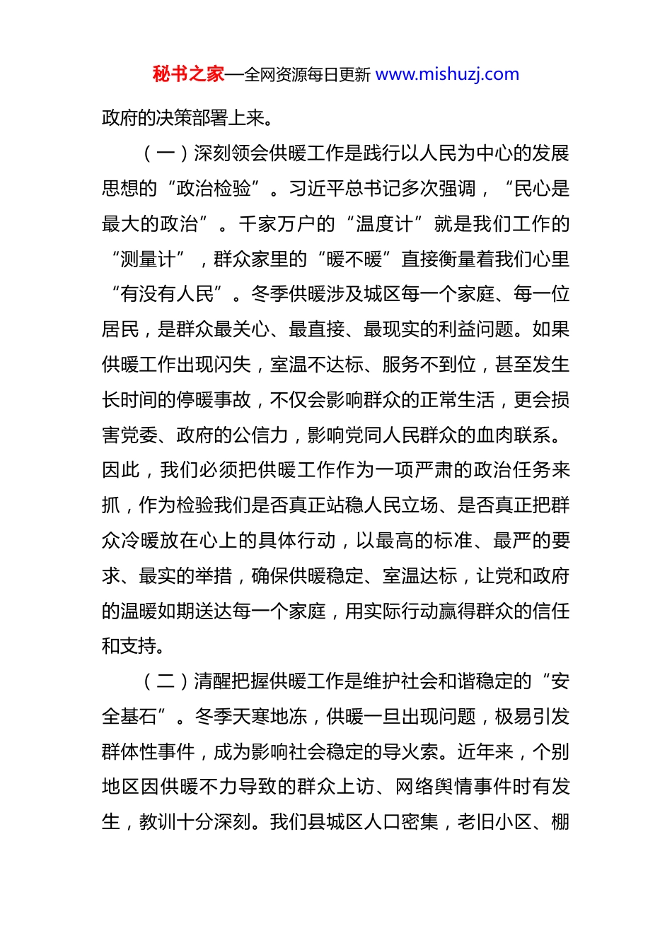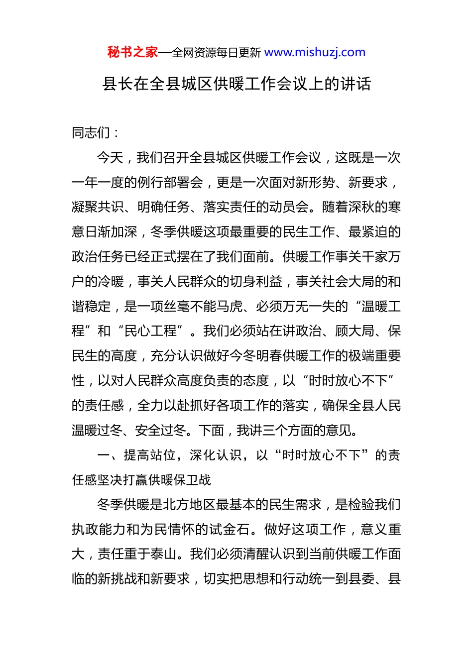 秘书之家—全网资源每日更新 www.mishuzj.com县长在全县城区供暖工作会议上的讲话 同志们:今天,我们召开全县城区供暖工作会议,这既是一次一年一度的例行部署会,更是一次面对新形势、新要求,凝聚共识、明确任务、落实责任的动员会。随着深秋的寒意日渐加深,冬季供暖这项最重要的民生工作、最紧迫的政治任务已经正式摆在了我们面前。供暖工作事关千家万户的冷暖,事关人民群众的切身利益,事关社会大局的和谐稳定,是一项丝毫不能马虎、必须万无一失的“温暖工程”和“民心工程”。我们必须站在讲政治、顾大局、保民生的高度,充分认识做好今冬明春供暖工作的极端重要性,以对人民群众高度负责的态度,以“时时放心不下”的责任感,全力以赴抓好各项工作的落实,确保全县人民温暖过冬、安全过冬。下面,我讲三个方面的意见。一、提高站位,深化认识,以“时时放心不下”的责任感坚决打赢供暖保卫战冬季供暖是北方地区最基本的民生需求,是检验我们执政能力和为民情怀的试金石。做好这项工作,意义重大,责任重于泰山。我们必须清醒认识到当前供暖工作面临的新挑战和新要求,切实把思想和行动统一到县委、县秘书之家—全网资源每日更新 www.mishuzj.com政府的决策部署上来。(一)深刻领会供暖工作是践行以人民为中心的发展思想的“政治检验”。习近平总书记多次强调,“民心是最大的政治”。千家万户的“温度计”就是我们工作的“测量计”,群众家里的“暖不暖”直接衡量着我们心里“有没有人民”。冬季供暖涉及城区每一个家庭、每一位居民,是群众最关心、最直接、最现实的利益问题。如果供暖工作出现闪失,室温不达标、服务不到位,甚至发生长时间的停暖事故,不仅会影响群众的正常生活,更会损害党委、政府的公信力,影响党同人民群众的血肉联系。因此,我们必须把供暖工作作为一项严肃的政治任务来抓,作为检验我们是否真正站稳人民立场、是否真正把群众冷暖放在心上的具体行动,以最高的标准、最严的要求、最实的举措,确保供暖稳定、室温达标,让党和政府的温暖如期送达每一个家庭,用实际行动赢得群众的信任和支持。(二)清醒把握供暖工作是维护社会和谐稳定的“安全基石”。冬季天寒地冻,供暖一旦出现问题,极易引发群体性事件,成为影响社会稳定的导火索。近年来,个别地区因供暖不力导致的群众上访、网络舆情事件时有发生,教训十分深刻。我们县城区人口密集,老旧小区、棚秘书之家—全网资源每日更新 www.mishuzj.com户区改造区域仍存在一些管网老化、系统不匹配等风险隐患。同时,随着人民群众对美好生活的向往不断提升,对供暖质量和服务水平也提出了更高的要求。我们必须居安思危、未雨绸缪,把困难估计得更充分一些,把风险思考得更深入一些,把预案制定得更周密一些。要牢固树立底线思维和风险意识,下好先手棋,打好主动仗,深入排查化解各类矛盾纠纷和风险隐患,确保供暖季期间不出现大的问题,为社会大局和谐稳定奠定坚实基础。(三)充分认识供暖工作是推动县域经济高质量发展的“环境保障”。一个宜居宜业的环境,是吸引人才、汇聚资源、推动发展的重要软实力。稳定、优质的供暖服务是营造良好营商环境、人居环境的重要组成部分。试想,如果一个地方的冬天,企业办公室冷冰冰,员工宿舍寒彻骨,居民家中无暖意,如何能留住人才、安心创业?如何能吸引外来投资、促进项目落地?良好的供暖保障,直接关系到企业和居民的生产生活秩序,关系到城市的形象和竞争力。我们必须将供暖工作置于全县经济社会发展的大局中来谋划和推进,通过提供可靠、高效的供暖服务,为各类市场主体创造稳定预期,为人民群众创造舒适生活环境,从而不断增强我县的吸引力和凝聚力,为高质量发展提供坚实的民生保障和环境支撑。秘书之家—全网资源每日更新 www.mishuzj.com二、聚焦重点,精准发力,以“钉钉子”的精神扎实做好供暖各项准备工作“凡事预则立,不预则废”。供暖工作系统性强、环节多、链条长,必须坚持问题导向,抓住关键环节,精准施策,把各项准备工作做深、做细、做实。目前,距离正式供暖启动已时间紧迫,各相关部门、供热企业必须立即行动起来,倒排工期、...
