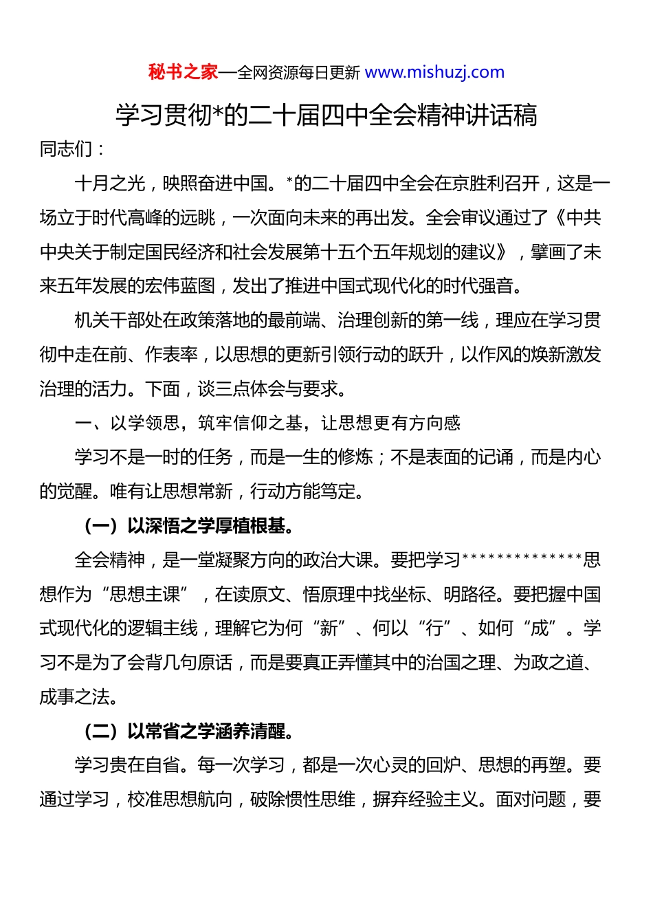 秘书之家—全网资源每日更新 www.mishuzj.com学习贯彻*的二十届四中全会精神讲话稿同志们:十月之光,映照奋进中国。*的二十届四中全会在京胜利召开,这是一场立于时代高峰的远眺,一次面向未来的再出发。全会审议通过了《中共中央关于制定国民经济和社会发展第十五个五年规划的建议》,擘画了未来五年发展的宏伟蓝图,发出了推进中国式现代化的时代强音。机关干部处在政策落地的最前端、治理创新的第一线,理应在学习贯彻中走在前、作表率,以思想的更新引领行动的跃升,以作风的焕新激发治理的活力。下面,谈三点体会与要求。一、以学领思,筑牢信仰之基,让思想更有方向感学习不是一时的任务,而是一生的修炼;不是表面的记诵,而是内心的觉醒。唯有让思想常新,行动方能笃定。(一)以深悟之学厚植根基。全会精神,是一堂凝聚方向的政治大课。要把学习**************思想作为“思想主课”,在读原文、悟原理中找坐标、明路径。要把握中国式现代化的逻辑主线,理解它为何“新”、何以“行”、如何“成”。学习不是为了会背几句原话,而是要真正弄懂其中的治国之理、为政之道、成事之法。(二)以常省之学涵养清醒。学习贵在自省。每一次学习,都是一次心灵的回炉、思想的再塑。要通过学习,校准思想航向,破除惯性思维,摒弃经验主义。面对问题,要秘书之家—全网资源每日更新 www.mishuzj.com有政治的敏感、理论的深度,更要有思想的锐度。要常问自己:我对*的决策理解是否深刻?我所做之事是否契合民心?我个人之为是否配得上*员的称号?(三)以践行之学验证真知。思想的力量,在于落地生根。要把“学懂弄通做实”贯穿始终,让学习走出会议室,融入工作场景、服务群众现场。要把理论转化为治理理念,把信仰转化为行动力量,让思想之光在每一次公文起草、每一次政策执行中闪耀光芒。二、以干践行,锤炼担当之勇,让执行更有穿透力思想是指南针,行动是推进器。学习全会精神,关键要把“思想热度”转化为“落实强度”,以实干开路,用行动立言。(一)在谋定而动中把握方向。谋,是干的前提;定,是成的基础。要以系统思维把握全局,科学研判形势,把机关工作放进国家发展的大棋局中思考。要从宏观中找坐标,在微观中求突破。做到眼中有全局、手中有细节,既谋大势,又解细题,让每一项工作都与“十五五”蓝图同频共振。(二)在敢打敢为中彰显担当。担当不是口号,而是一次次关键时刻的挺身而出。面对改革的难题,要敢于迎难而上;面对发展的瓶颈,要敢于破局突围;面对群众的期盼,要敢于立即回应。要以“难题就是命题”的思维破解矛盾,以“压力就是动力”的信念开辟新局。每一位机关干部都要在执行中历练,在攻坚中成秘书之家—全网资源每日更新 www.mishuzj.com长,让“我能行、我来干”成为最响亮的回答。(三)在实效导向中检验成色。落实是检验忠诚的经验交流。要健全清单式推进、闭环式管理机制,形成任务有图、进度有表、落实有声的工作格局。要防止“文件式落实”“会议式推进”,真正让“纸上蓝图”变成“地上景象”;要让“今天再晚也是早、明天再早也是晚”的意识成为常态,让“马上就办、办就办好”的作风成为习惯。三、以德正行,涵养公仆之心,让为政更有温度感权力是责任的延伸,岗位是人民的托付。对机关干部而言,德行不是抽象的修辞,而是行走在公文行间、落实在群众眼中的风景。唯有心中有光,脚下才有路。(一)让情怀点亮初心。心怀苍生,方能不负时代。干部的价值,不在头衔的高低,而在心系百姓的真诚。要学会在平凡的工作中看见人民的需要,在群众的诉求里听出时代的脉搏。要让每一份文件都写出温度,让每一次审批都映出真情。群众的笑容,才是最朴素的政绩考量。(二)让清风拂净心境。清廉不是禁令的结果,而是修养的选择。面对诱惑,要能“心不动于微利之诱,目不眩于五色之惑”;面对权力,要常思其重,常念其戒。要在独处时守住分寸,在权力前稳住心神,让干净成为一种底色,让自律成为一种品格。清风拂面时,才会听到内心最安静的声音。(三)让共识凝成力量。团结,是事业的最大公约数。一个人可以走秘书之家—全网资源每日更新 www.mis...