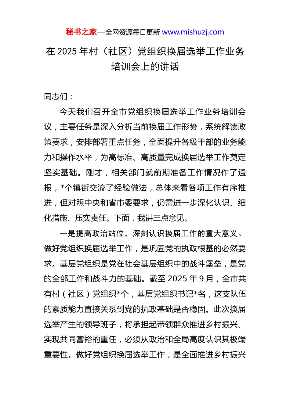 秘书之家—全网资源每日更新 www.mishuzj.com在 2025 年村(社区)党组织换届选举工作业务培训会上的讲话 同志们:今天我们召开全市党组织换届选举工作业务培训会议,主要任务是深入分析当前换届工作形势,系统解读政策要求,安排部署重点任务,全面提升各级干部的业务能力和操作水平,为高标准、高质量完成换届选举工作奠定坚实基础。刚才,相关部门就前期准备工作情况作了通报,*个镇街交流了经验做法,总体来看各项工作有序推进,但对照中央和省市委要求,仍需进一步深化认识、细化措施、压实责任。下面,我讲三点意见。一是提高政治站位,深刻认识换届工作的重大意义。做好党组织换届选举工作,是巩固党的执政根基的必然要求。基层党组织是党在社会基层组织中的战斗堡垒,是党的全部工作和战斗力的基础。截至 2025 年 9 月,全市共有村(社区)党组织*个,基层党组织书记*名,这支队伍的素质能力直接关系到党的执政基础是否稳固。此次换届选举产生的领导班子,将承担起带领群众推进乡村振兴、实现共同富裕的重任,必须从政治和全局高度认识其极端重要性。做好党组织换届选举工作,是全面推进乡村振兴秘书之家—全网资源每日更新 www.mishuzj.com的战略需要。当前我市正处于加快农业农村现代化建设的攻坚期,全市农林牧渔业总产值预计 2025 年将达到*亿元,农村居民人均可支配收入有望突破*万元。实现这些目标,迫切需要一支懂农业、爱农村、爱农民的基层干部队伍。通过换届,要选拔一批政治素质好、带富能力强、协调能力强的优秀人才进入班子,为乡村振兴提供坚强组织保证。做好党组织换届选举工作,是提升基层治理效能的关键举措。随着经济社会快速发展,基层治理面临新挑战新要求。目前全市村(社区)中,35 岁以下年轻干部占比*%,大专以上学历干部占比*%,班子结构还需进一步优化。要通过换届,推动基层干部队伍实现年龄结构、学历结构、能力结构的整体提升,加快构建现代基层治理体系。二是聚焦关键环节,精准落实换届工作的各项要求。扎实做好前期准备,夯实工作基础。要按照“一村一策”原则,全面完成摸底排查工作。截至 2025 年第三季度,全市已完成*个村的摸底调研,占总数的*%,剩余*个村要在10 月底前全部完成。重点要掌握各村人口结构、党员队伍、集体经济、矛盾纠纷等情况,建立详细工作台账。要严格落实离任审计制度,对*个村(社区)的“三资”管理情况进行全面审计,审计结果及时向群众公示。严格规范秘书之家—全网资源每日更新 www.mishuzj.com操作程序,确保依法依规。要准确把握《中国共产党基层组织选举工作条例》规定,严格执行换届选举的各项程序要求。在代表产生环节,要注重发扬民主,充分酝酿协商,代表构成要体现广泛性和先进性。据 2025 年最新统计,全市村(社区)党组织换届中,党员参选率要达到95%以上,代表中基层一线比例不低于 60%。在候选人产生环节,要严格资格审查,建立组织、纪检、政法等部门联审机制,坚决把不符合条件的人挡在门外。着力优化班子结构,增强整体功能。要围绕乡村振兴和基层治理需要,科学配置班子资源。原则上,每个村(社区)班子中至少要有 1 名 35 岁以下年轻干部、1 名大专以上学历干部、1 名女性干部。要积极推进村党组织书记通过法定程序担任村民委员会主任,2025 年全市“一肩挑”比例要达到*%以上。要注重从致富能手、返乡创业人员、退役军人中选拔干部,改善班子队伍结构。切实加强培训指导,提升业务能力。要分级分类开展业务培训,市级重点培训镇街领导干部和业务骨干,镇街重点培训村(社区)干部和工作人员。2025 年全市计划举办换届业务培训班*期,培训人员*人次。培训内容要突出政策法规、操作流程、纪律要求等重点,采用案例教学、模拟演练等方式增强培训实效。要严格执行培训考核制度,培训合格方可上岗。秘书之家—全网资源每日更新 www.mishuzj.com三是加强组织领导,全力保障换届工作圆满成功。压实工作责任,形成工作合力。各级党委要切实履行主体责任,党委书记要承担第一责任人职责。要成立换届工作领导小组,设立专门工作机构,配强工作力量。建立市级领导包镇...